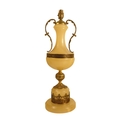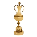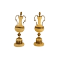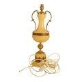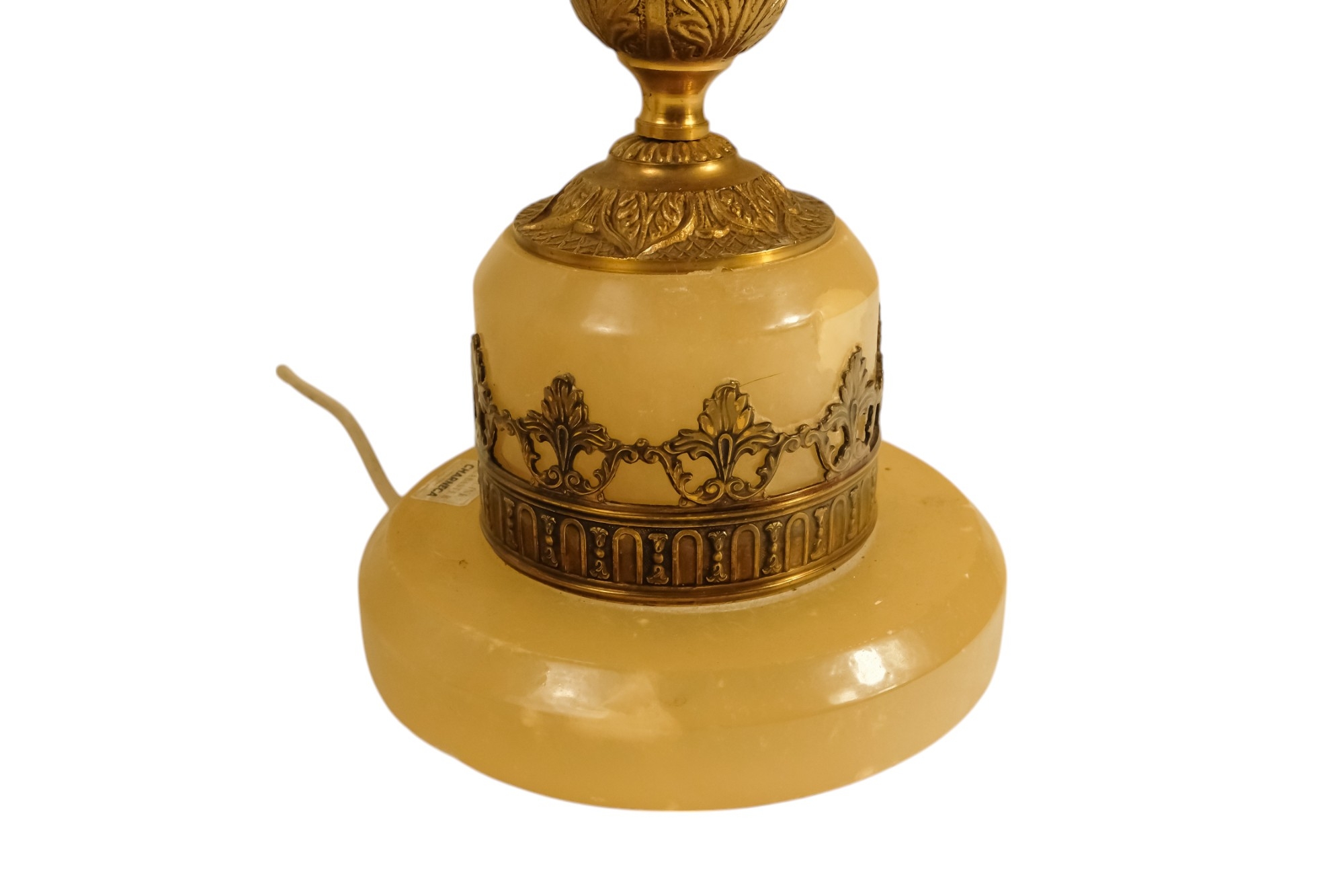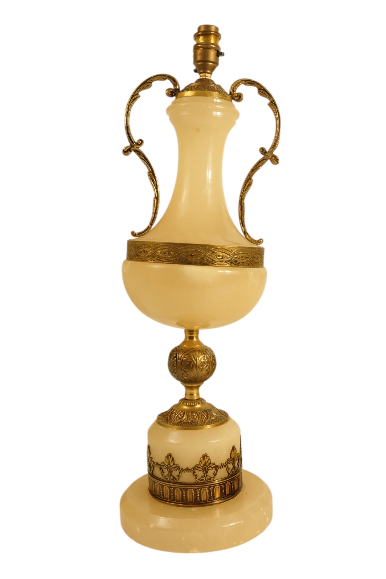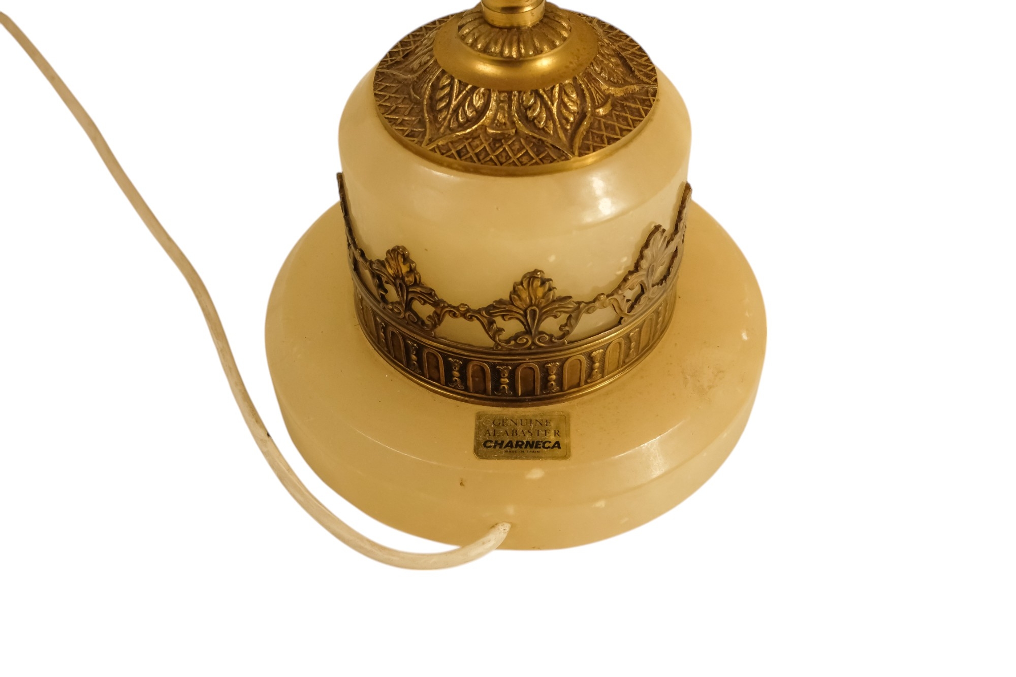 A pair of alabaster and gilt metal table lamps - with twin handles and foliate castings, 58cm high. (2)