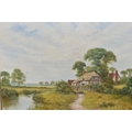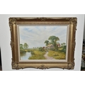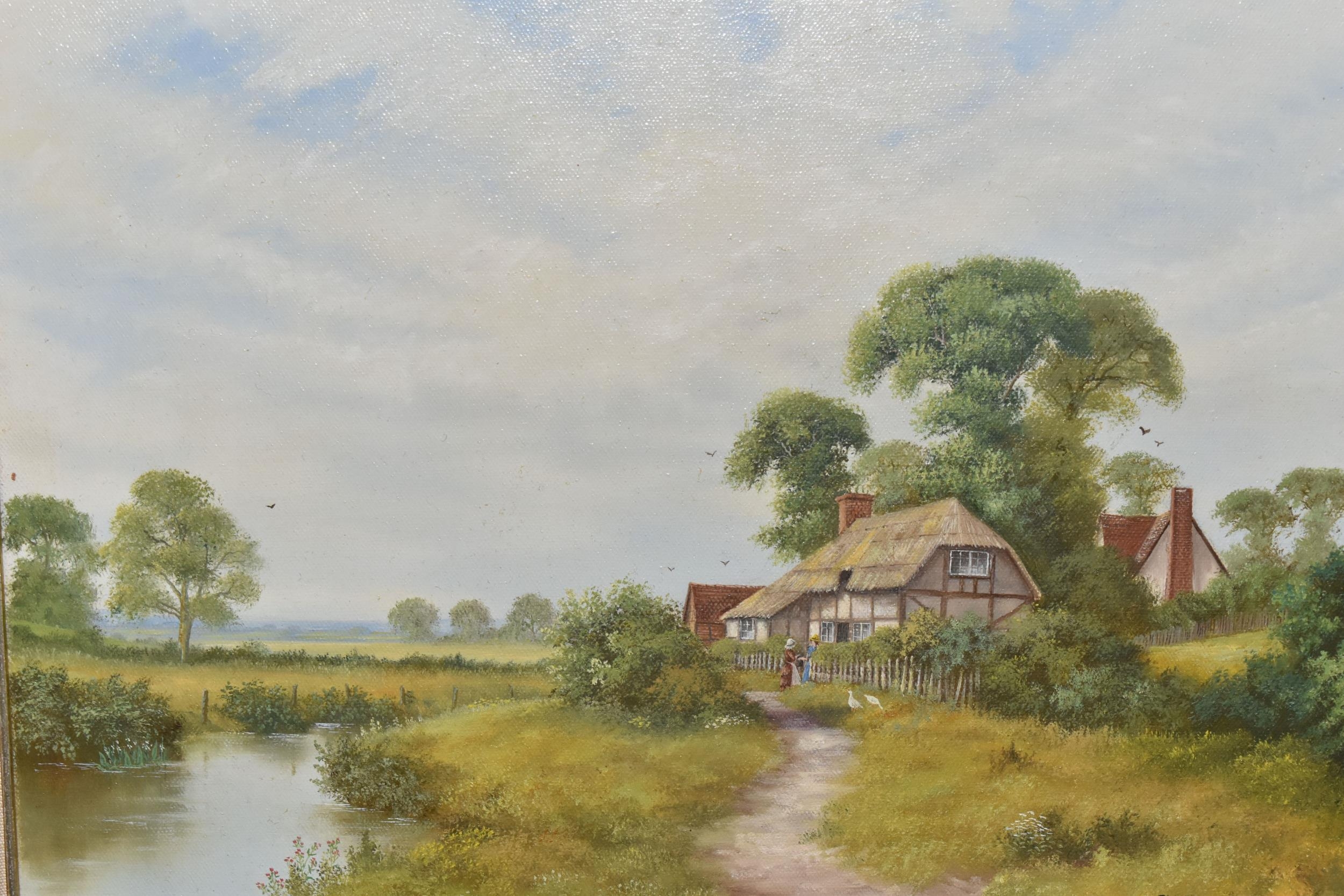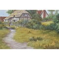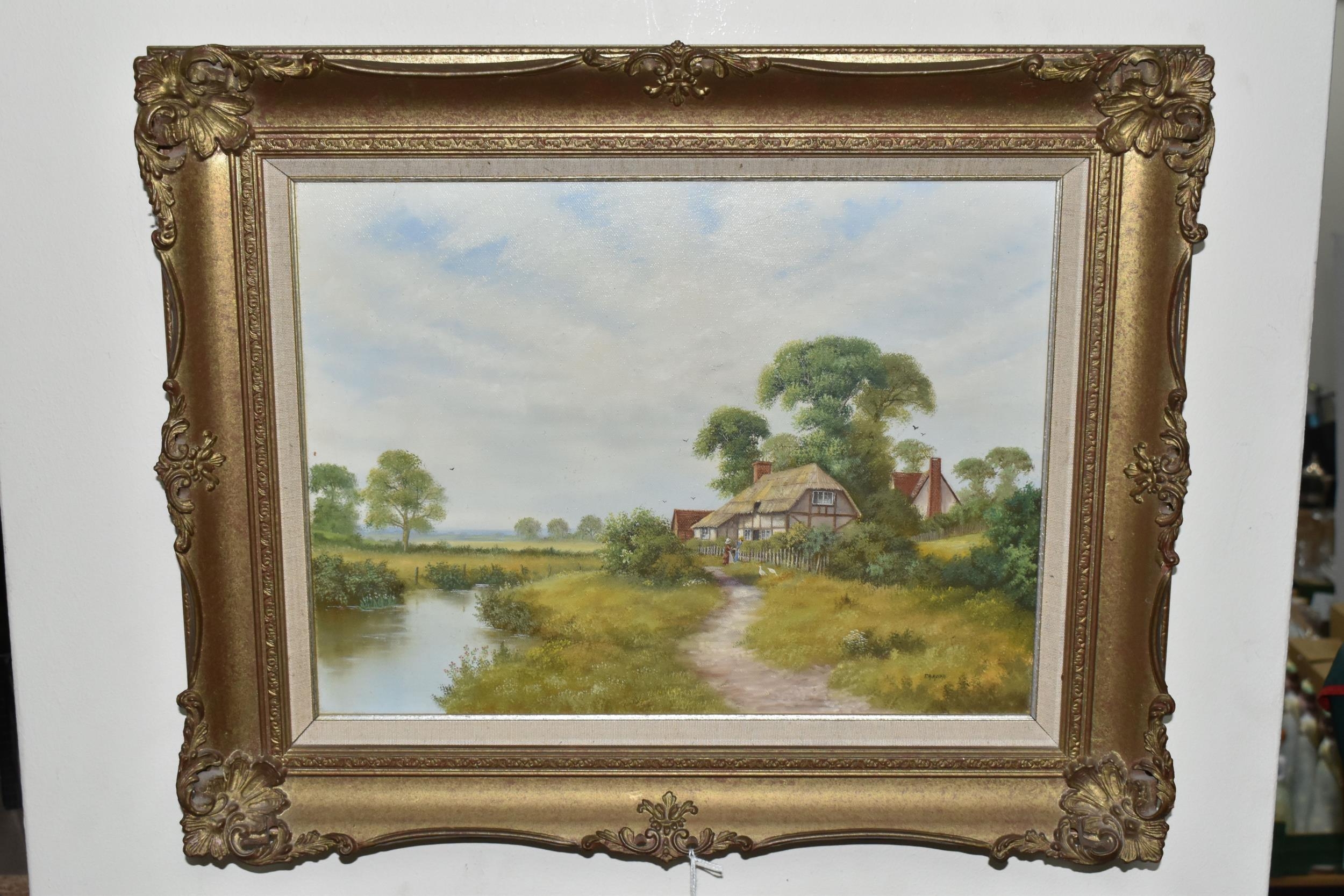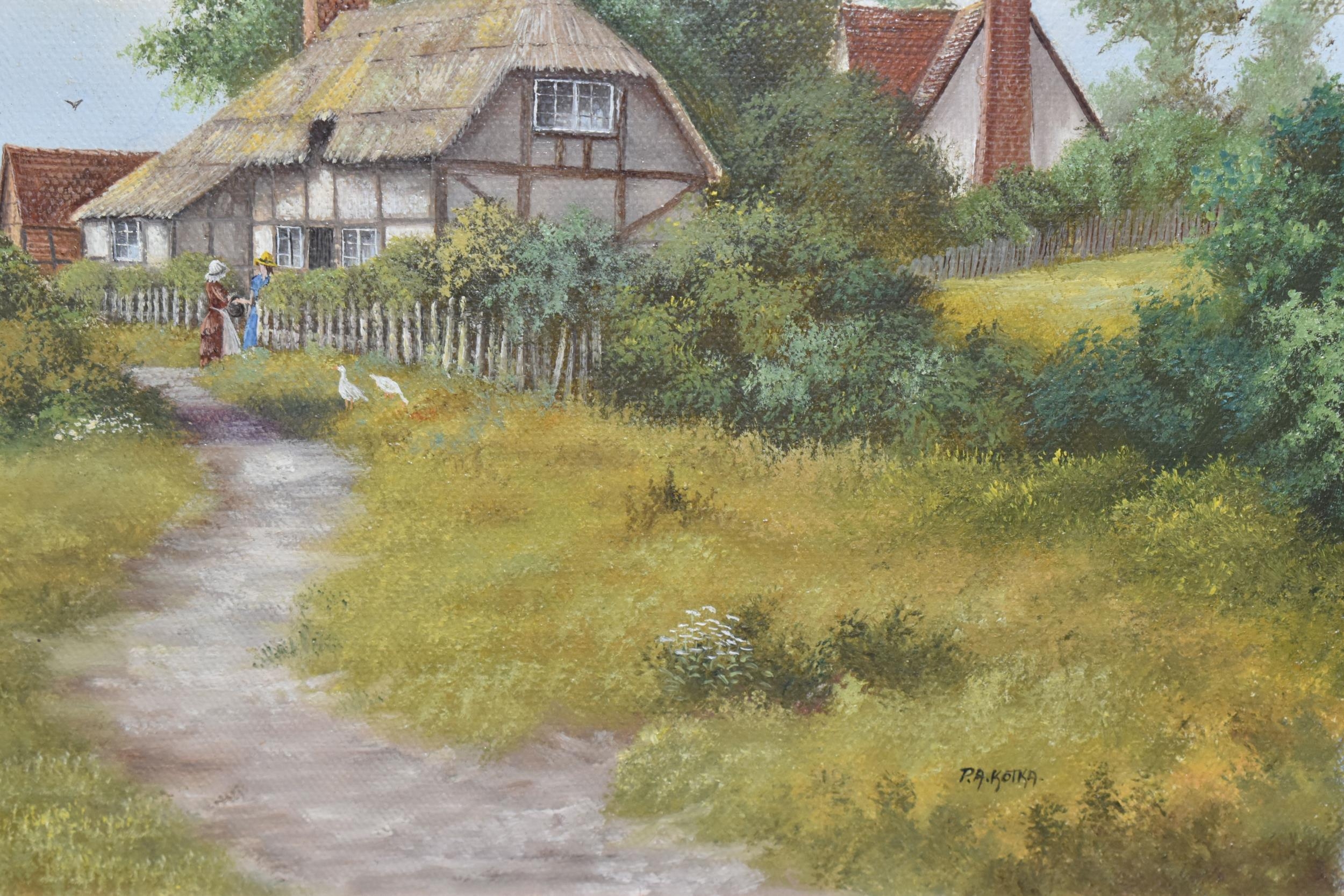 PETER KOTKA (1951-) A NOSTALGIC 19TH CENTURY STYLE LANDSCAPE, two figures are standing before a thatched cottage, signed bottom right, oil on canvas, approximate size 30cm x 40cm, Condition Report: good overall condition
