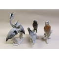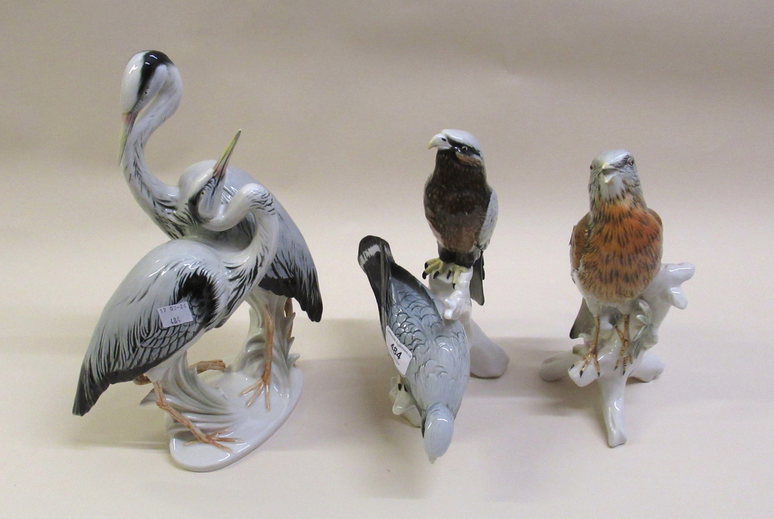 Karl Ens, large pottery figure of a pair of eagles, similar group of herons and another of a bird