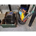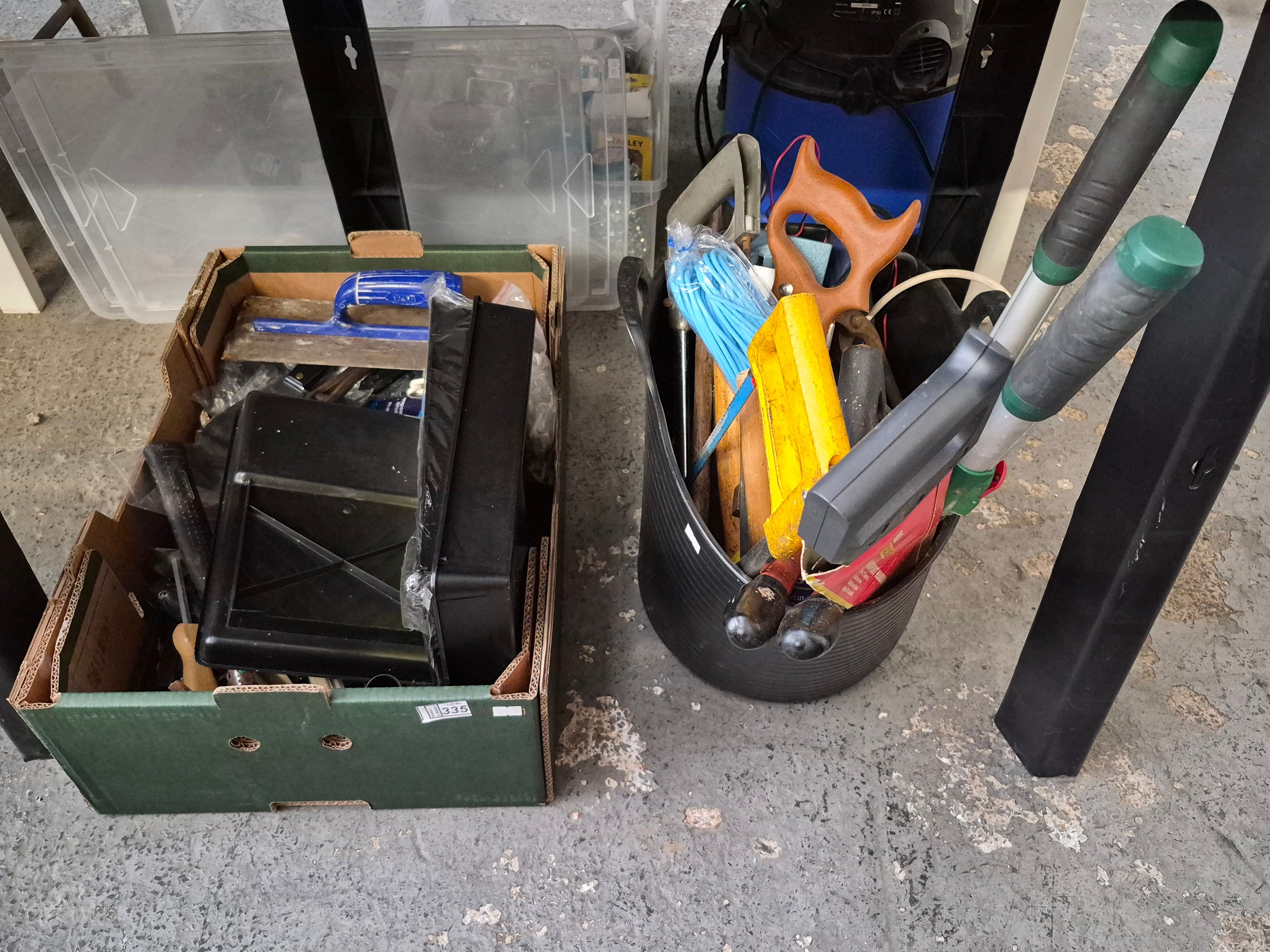 Box and builders tub containing assorted tools and decorating supplies