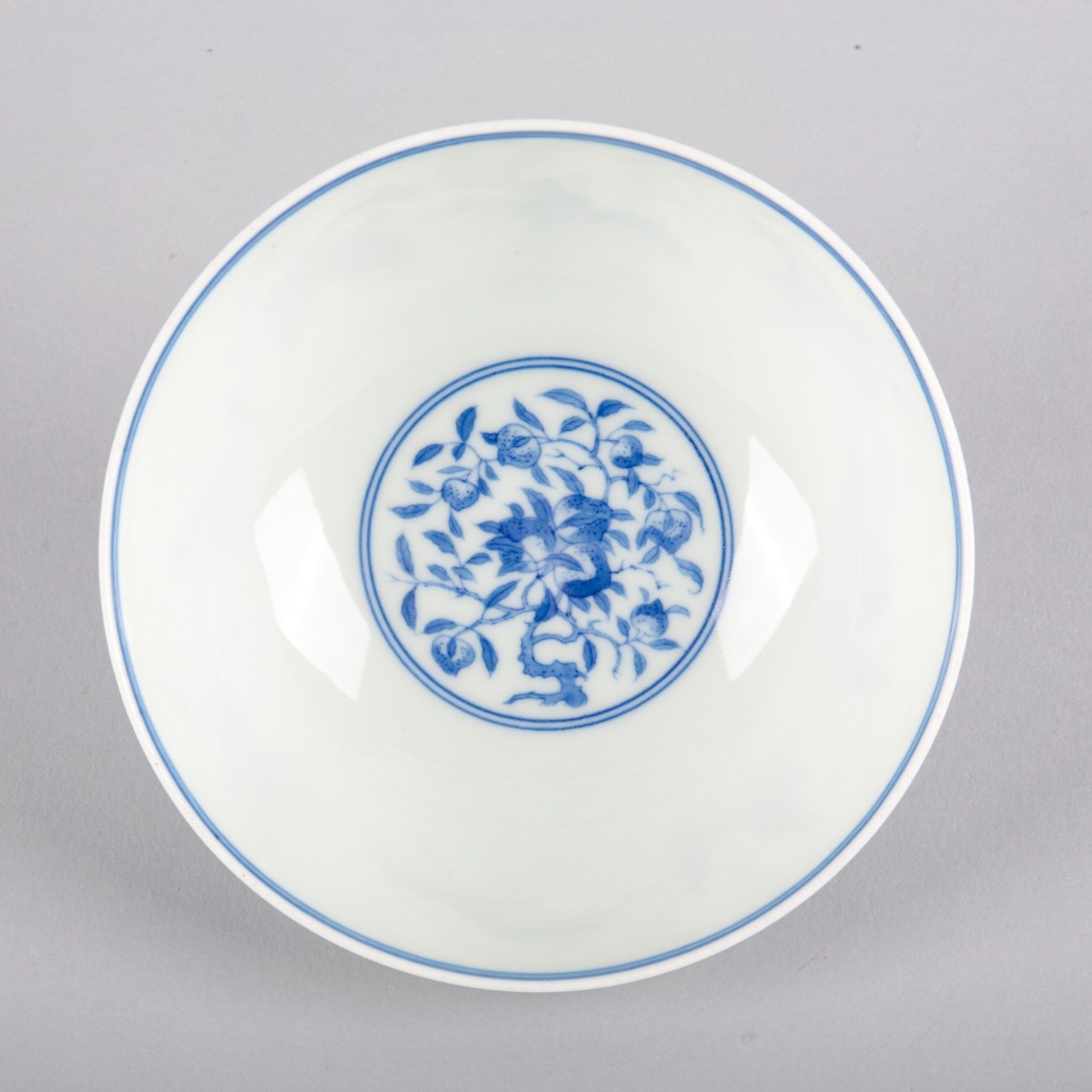 bearing a six character Yongzheng mark to the base, decorated with eight herons in flight, a blossoming pomegranate plant to the interior, 6cm high x 14.5cm diameter