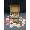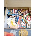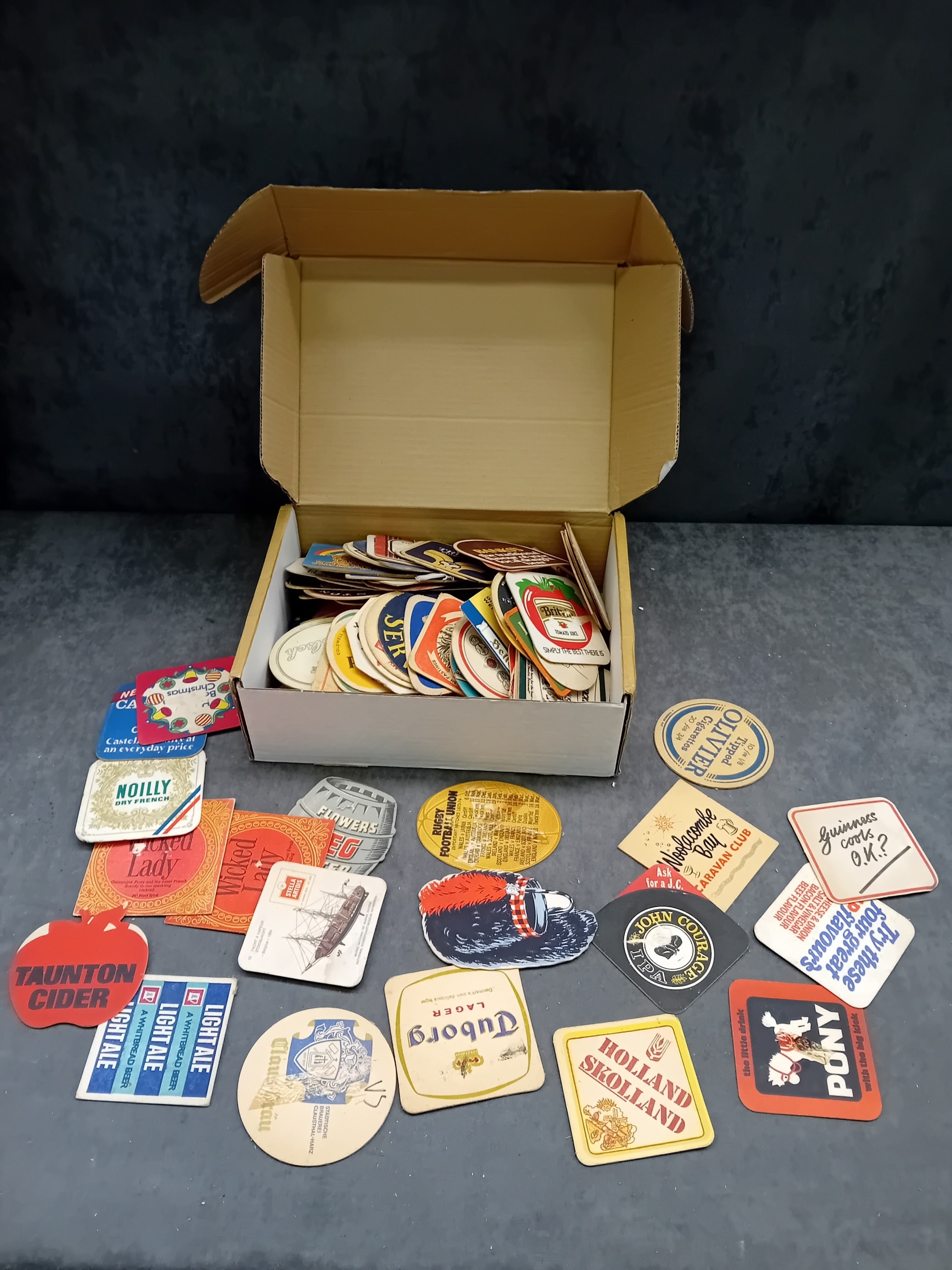 A collection of approximately 50 vintage German beer coasters, primarily crafted from pulpboard or thick cardboard. The assortment features various shapes, including round, square, diamond, and irregular cuts, and appears to date primarily from the mid to late 20th century. The collection advertises a diverse range of products and brands, with notable visible text and brand names including "Guinness" (e.g., "Guinness cooks O.K.?"), "John Courage IPA, " "Tuborg Lager" (with the slogan "Denmark's own delicious lager"), "Stella Artois" (bearing French text "Belgique - 1888" and "Brasserie Nationale de Louvain"), "Taunton Cider, " "Whitbread Light Ale, " "Pony" ("the little drink with the big kick"), "Olivier Tipped Cigarettes, " "Banks's, " "Britvic Tomato Juice, " "Woolscombe Bay Caravan Club, " "Flowers EG, " and "Rugby Football Union" (mentioning "Important Matches 1973-74"). The collection is predominantly in English, with some French and implied Danish text.