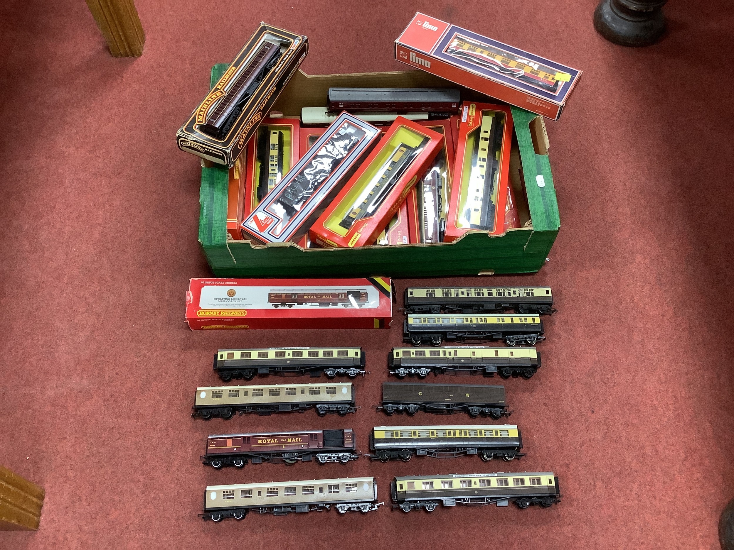 Approximately twenty-three 00 gauge coaches, including twelve boxed, by Hornby, Lima, Airfix and others, including a Palethorpes Sausages Bogie Van and a GWR Siphon H Parcels Van, playworn.