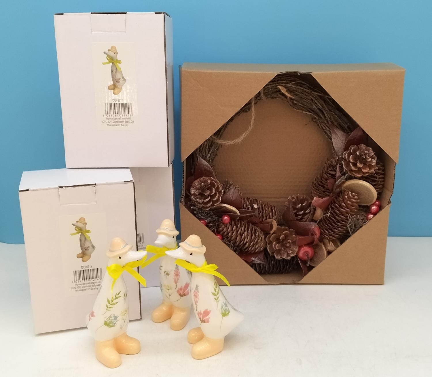 New Boxed 29cm Festive Wreath plus New Boxed 14cm Ceramic Ducks (3).