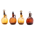 A group of four 19th century amber glass flagon decanters with brass and m.o.p. mounts and stoppers, 21-24cm [4].