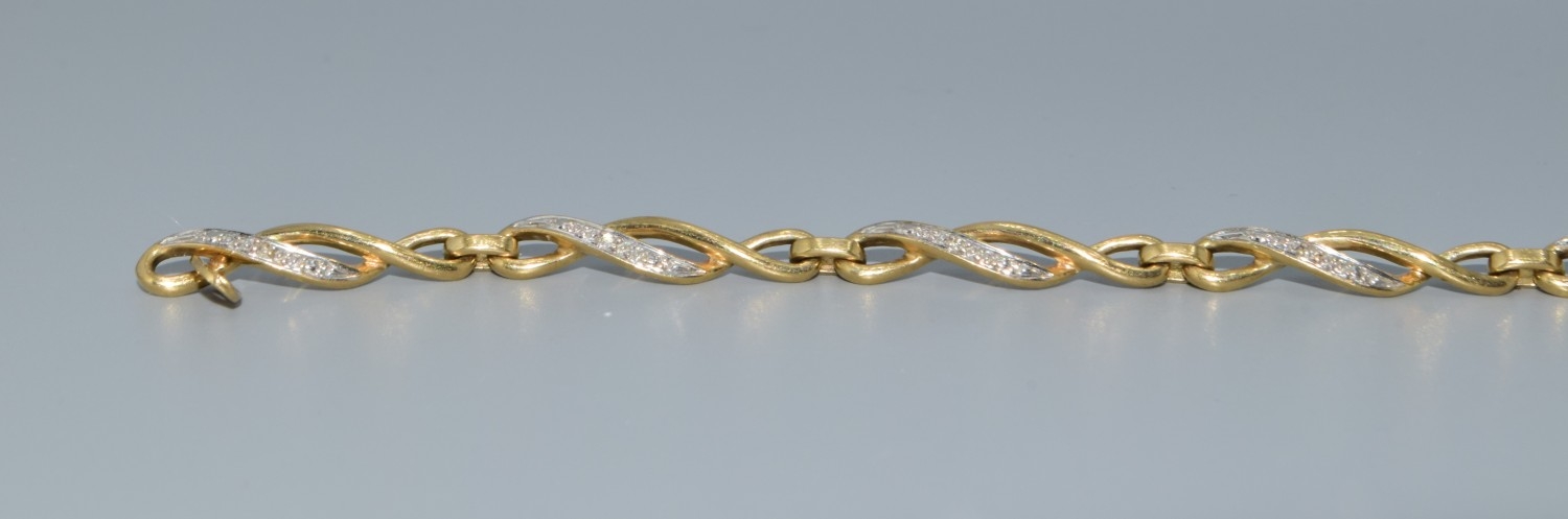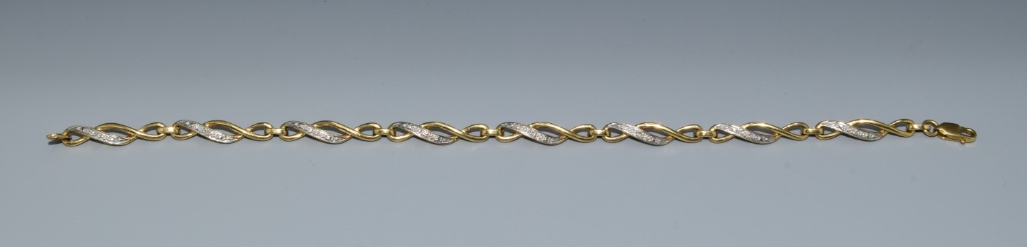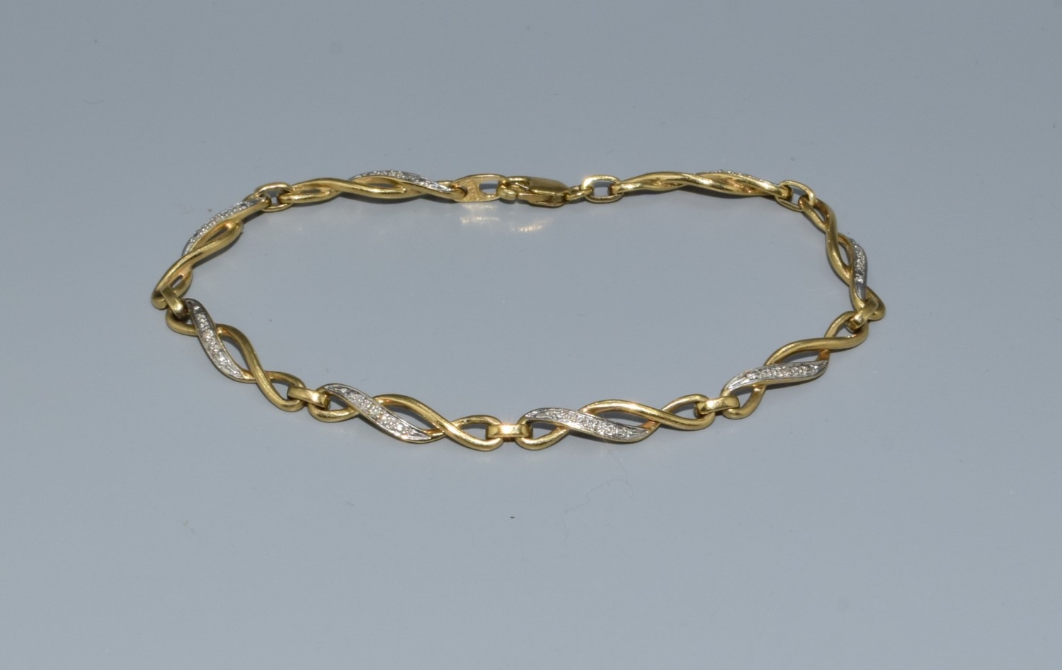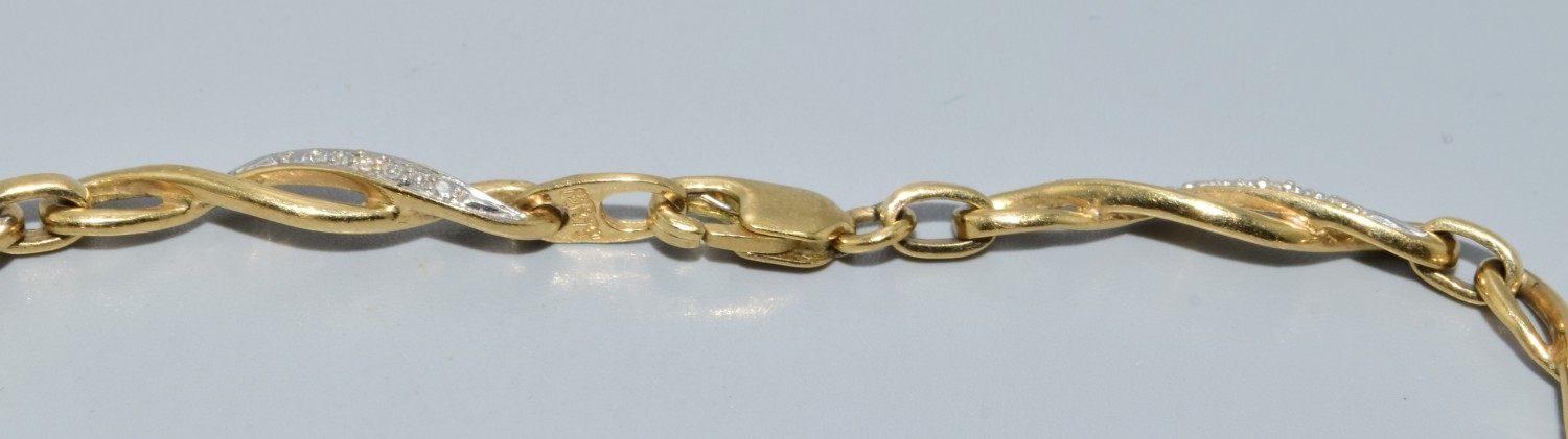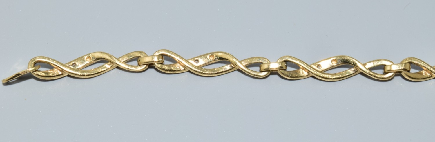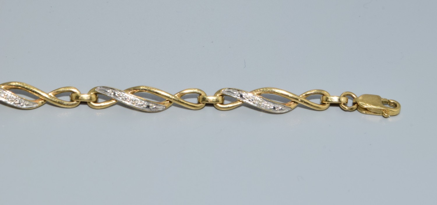 9ct gold and diamond Celtic style lobster claw bracelet with diamond insert. 7 inches long 5.7g