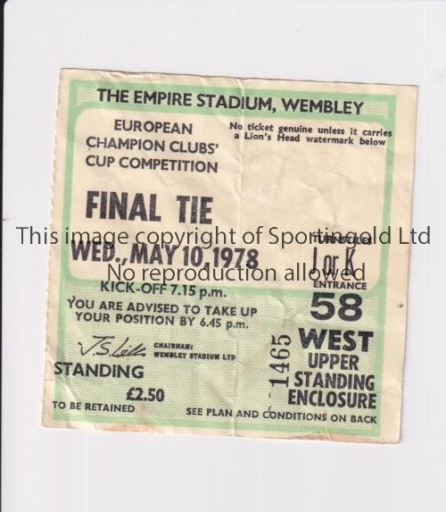 1978 EUROPEAN CUP FINAL Ticket for Liverpool v Bruges 10/5/1978 at Wembley, creased. Fair to generally good