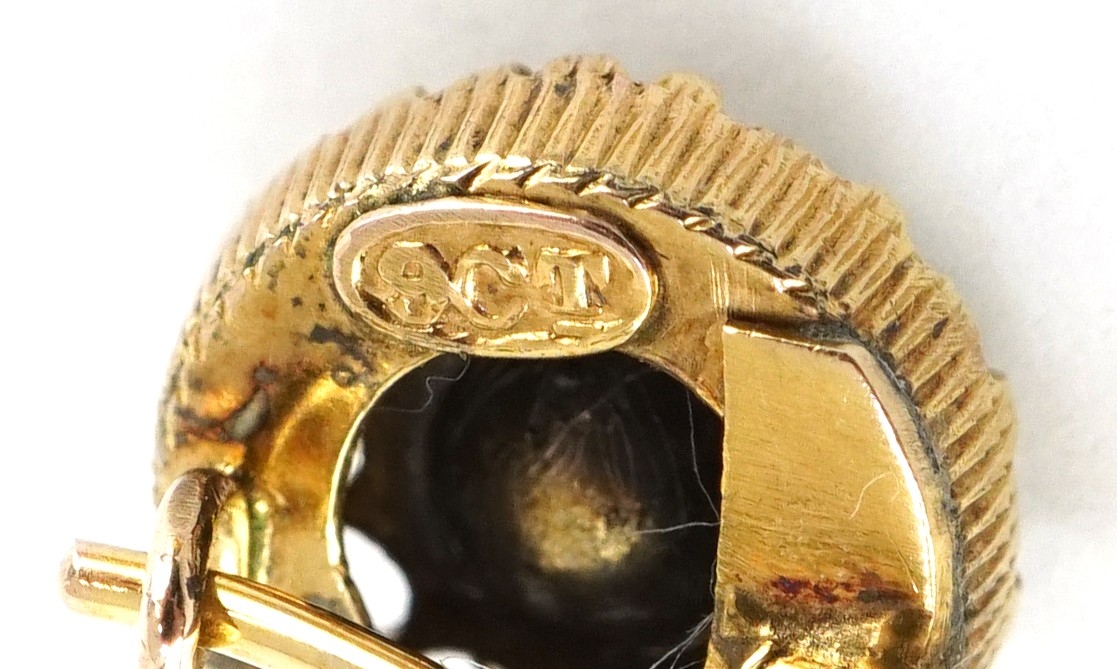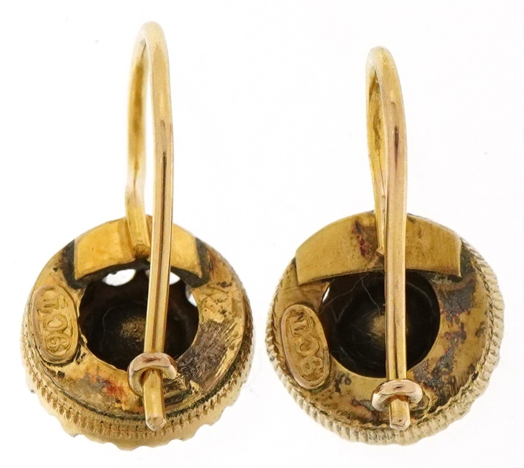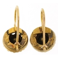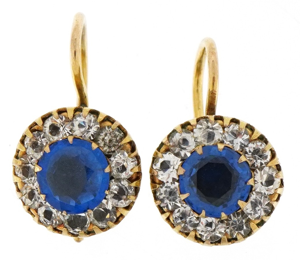 A pair of 9ct gold tanzanite and clear stone drop earrings, 1.0cm in diameter, total 2.5g.