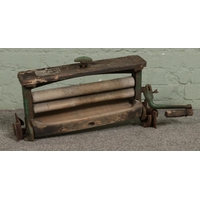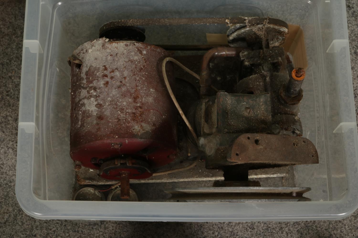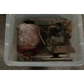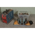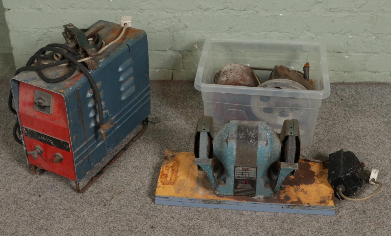 A Wolf electric bench grinder alongside a Welding machine LM-100 and a box of spare machine parts - Picador England, Merlin Brooke Motor, Maxfield Tyre Pump etc.