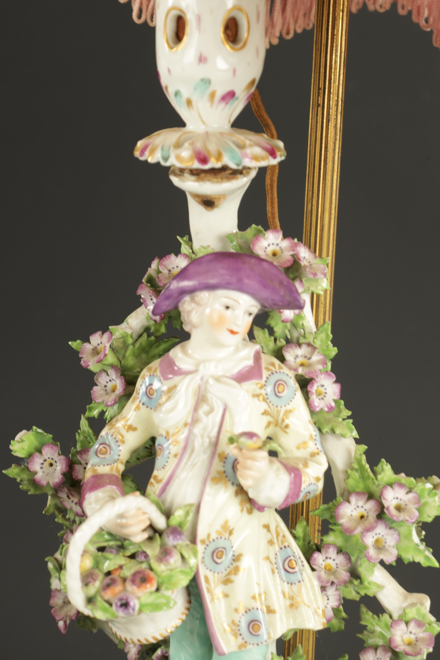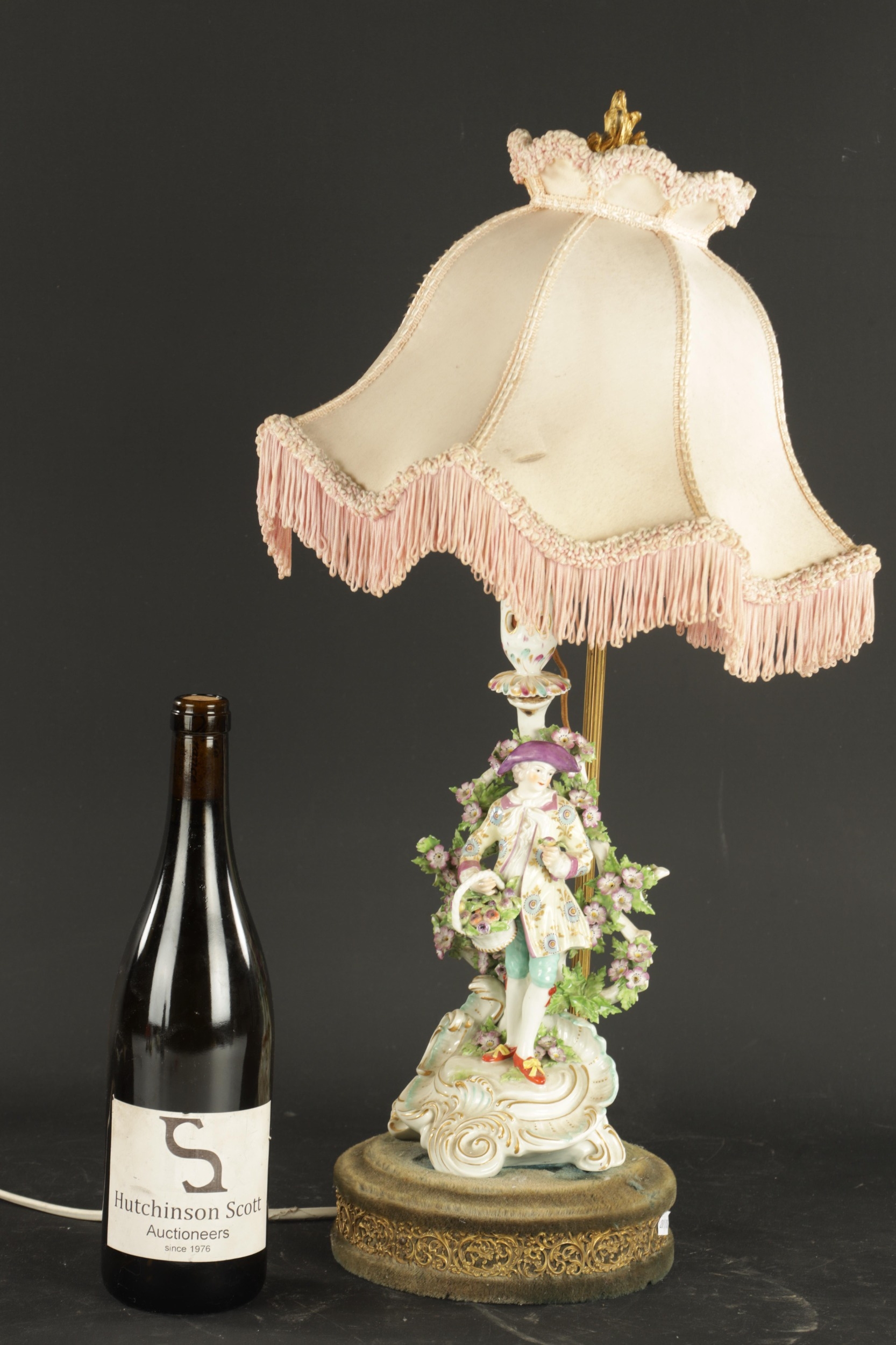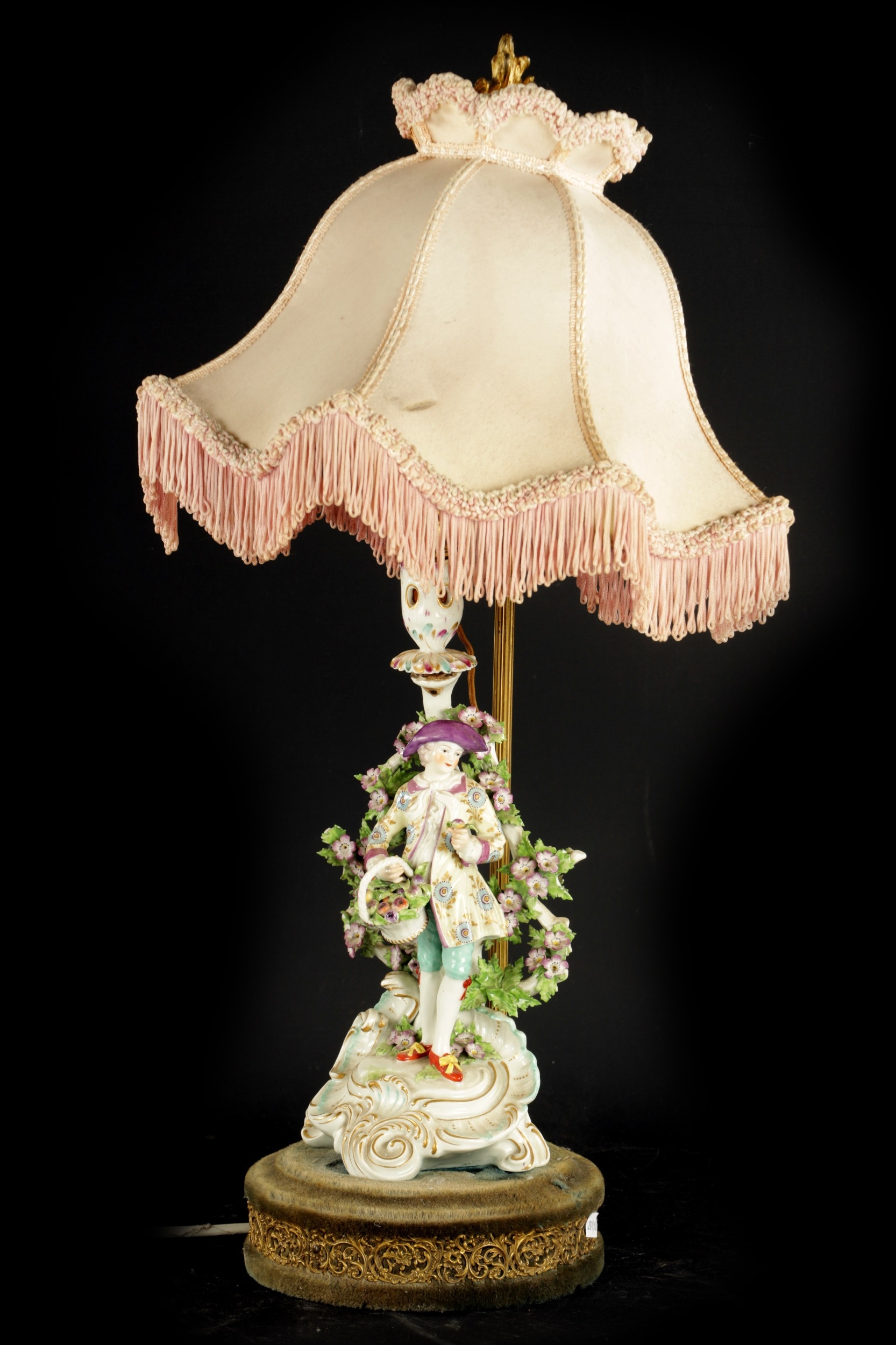 A FRENCH PORCELAIN LAMP FIGURE of a boy with a basket of fruit in the derby style (36cm High)