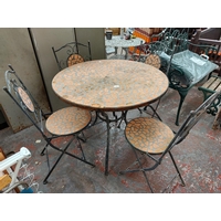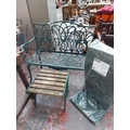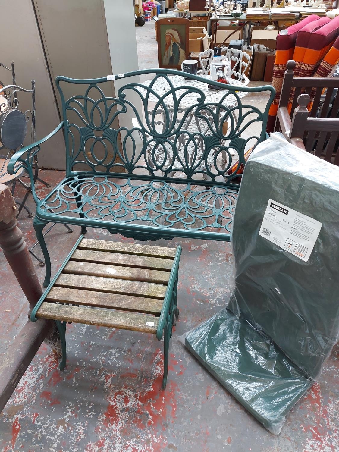 Three items to include a green painted cast aluminium two seat ornate garden bench with Homebase bench cushion together with a wooden slatted cast iron footstool