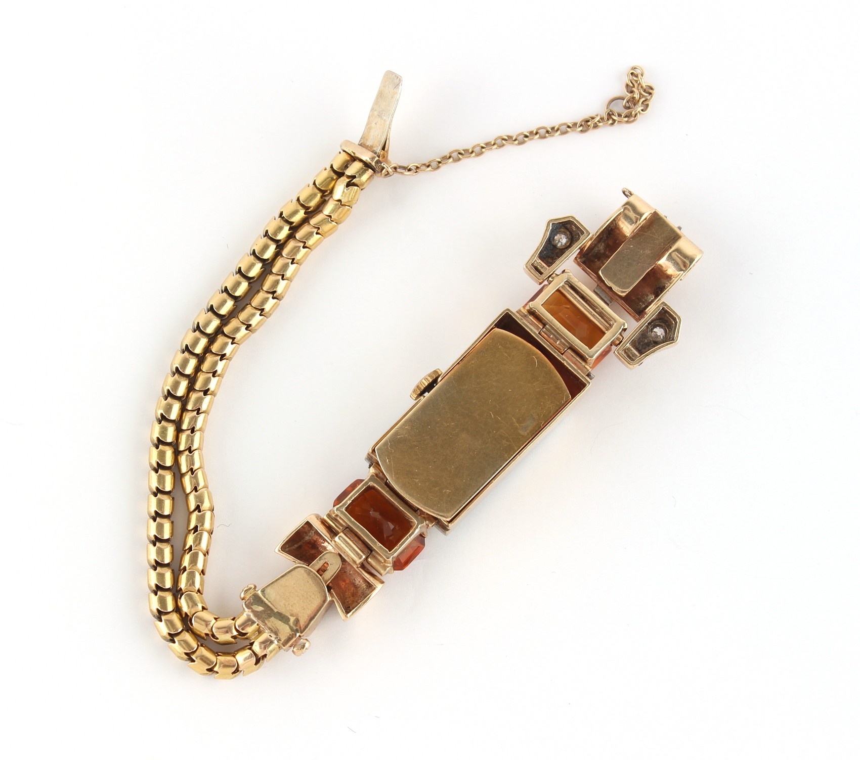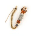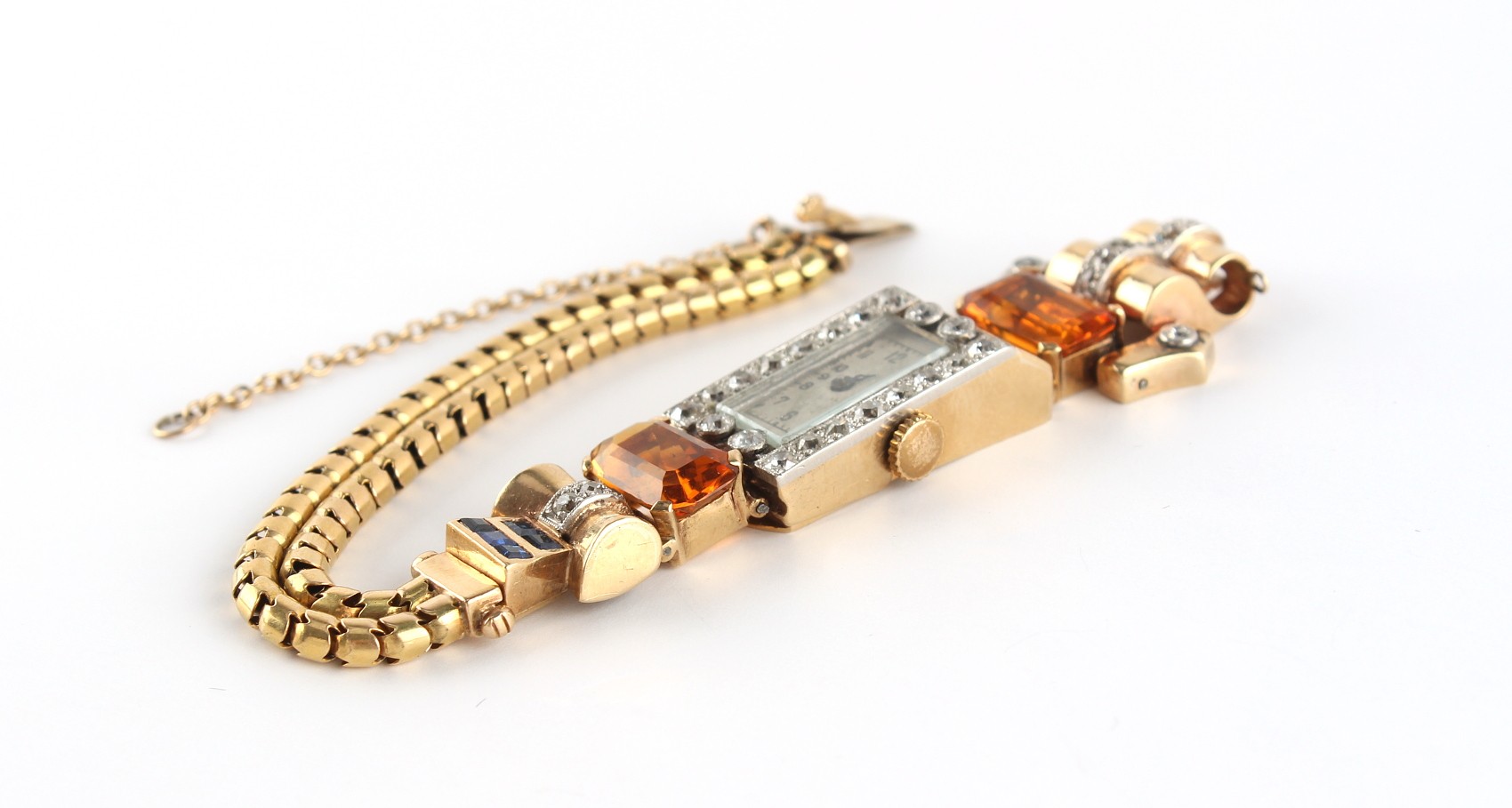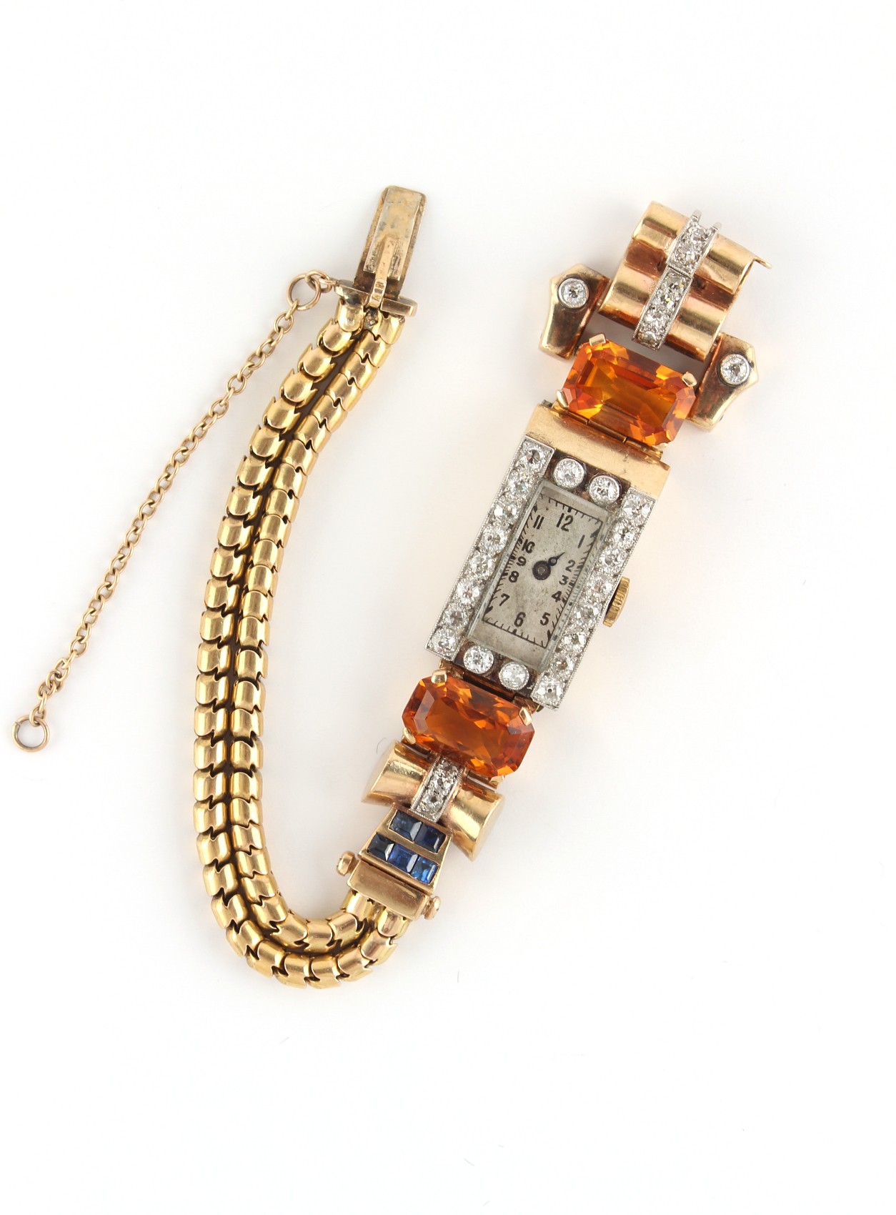 A lady's Art Deco style yellow gold diamond sapphire & citrine cocktail watch, the old cut diamonds weighing an estimated 1.48 carats, with two emerald cut citrines and five square cut sapphires, the 17-jewel Swiss movement not currently working.