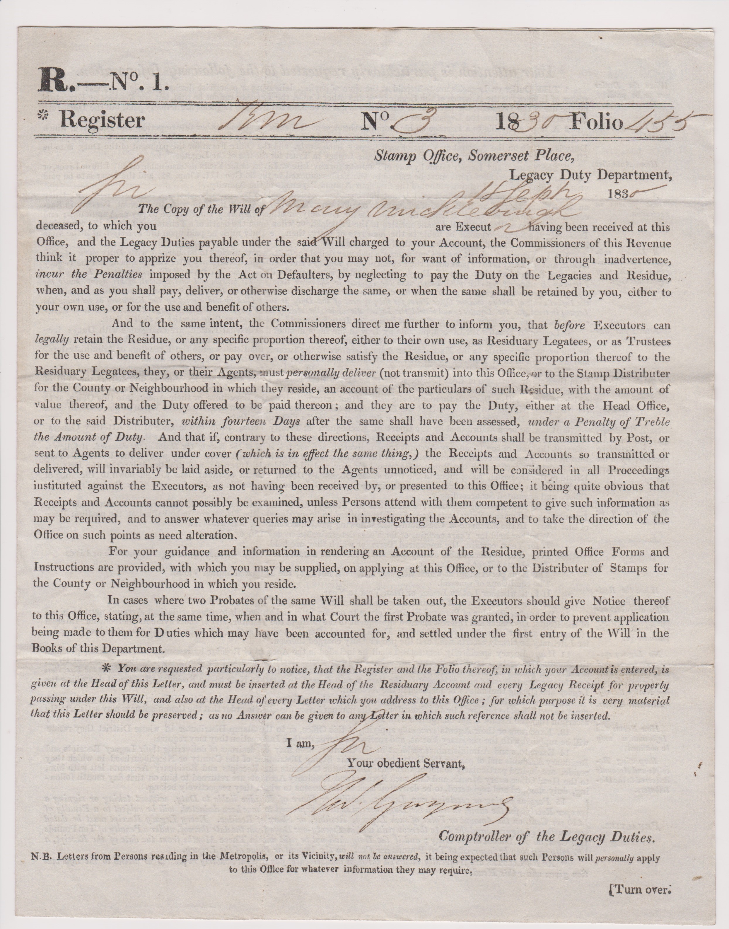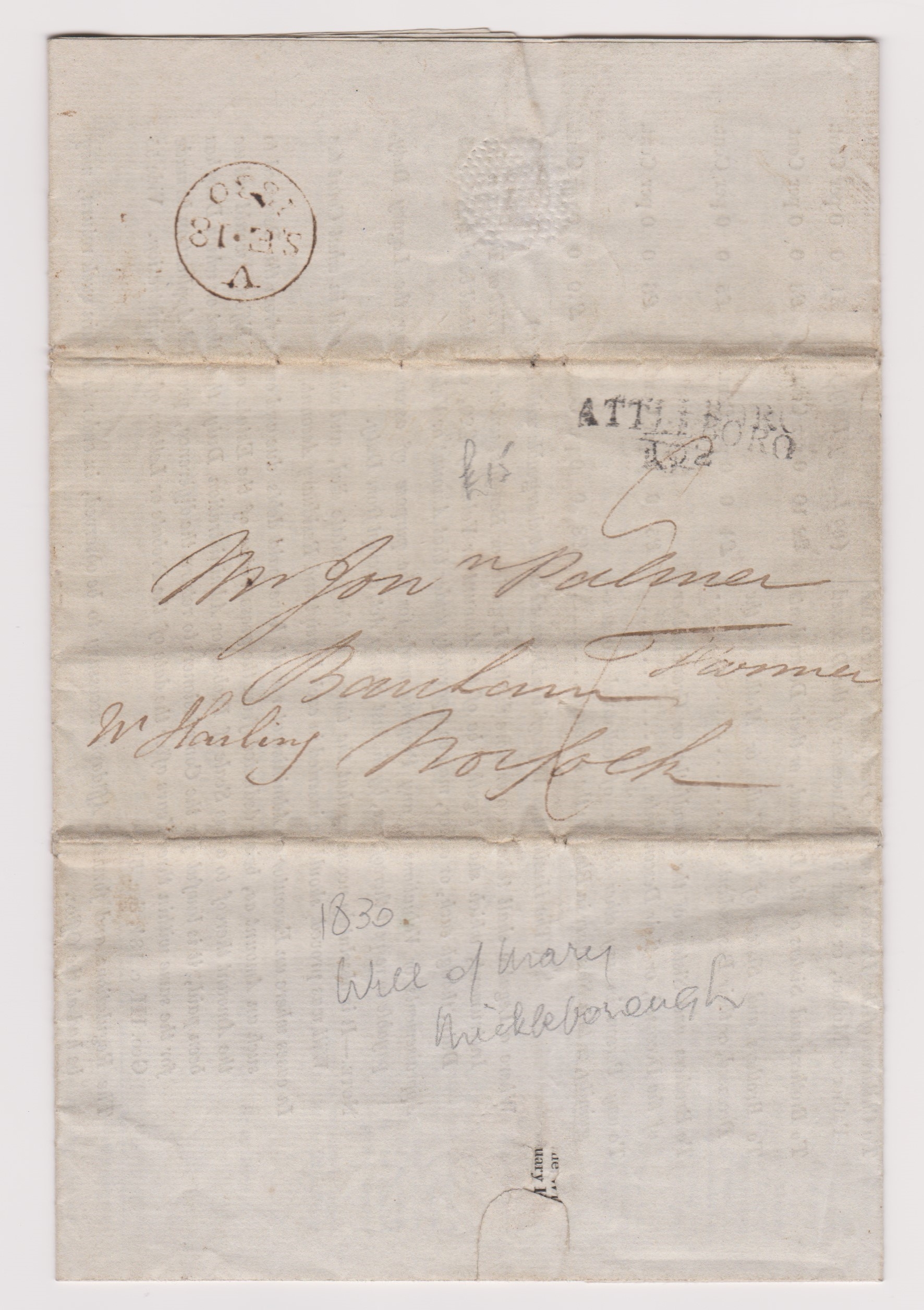 Great Britain 1830-EL Legacy duty form dated 18th Sept 1830 raised due to the will of Mary Mickleborough-posted to Banham-manuscript 9 black 2 line Attleboro 122 cancel single ring V/SE18/1830 cancel