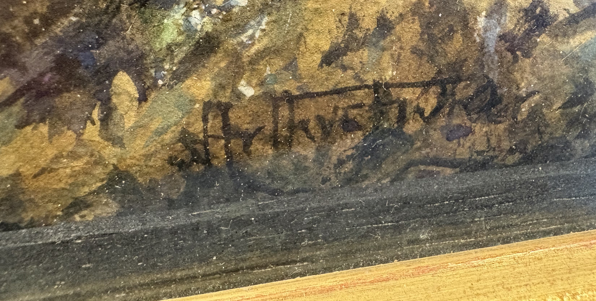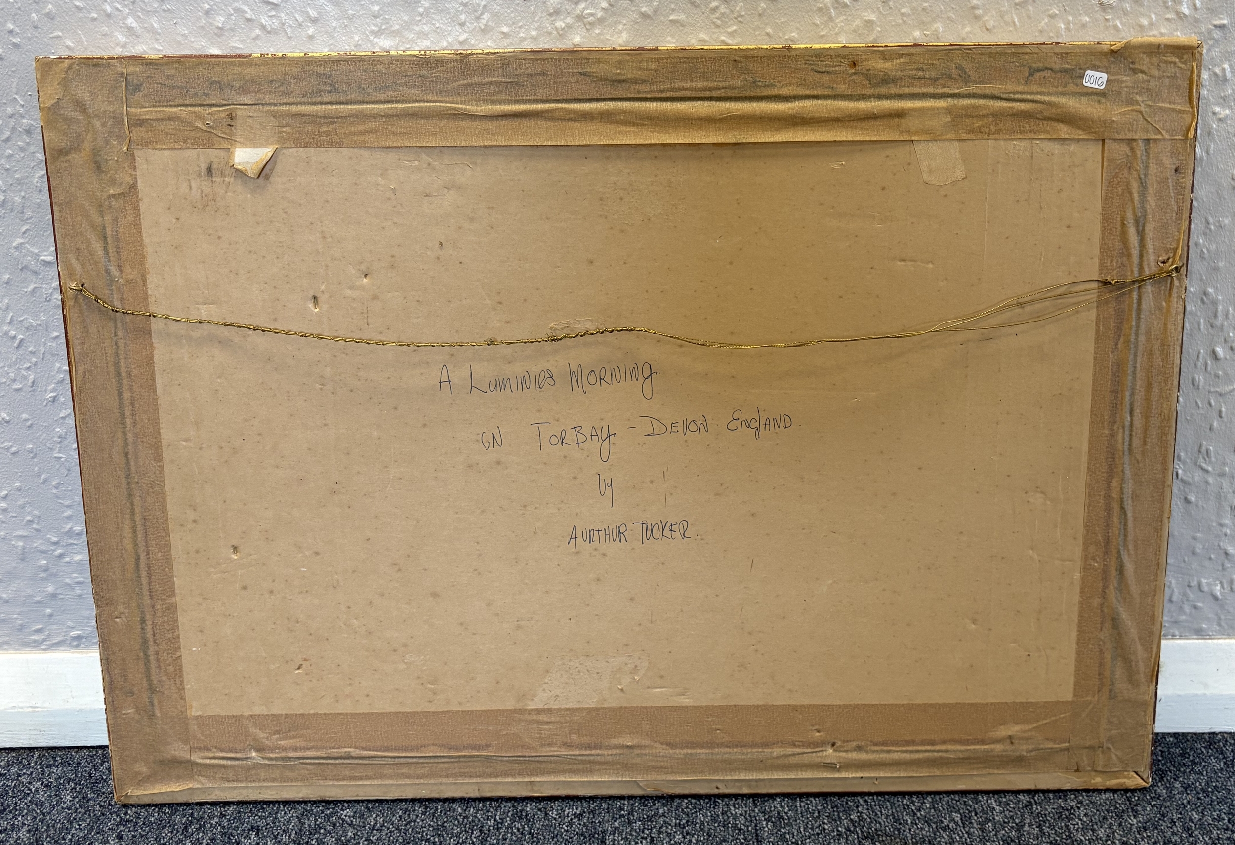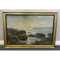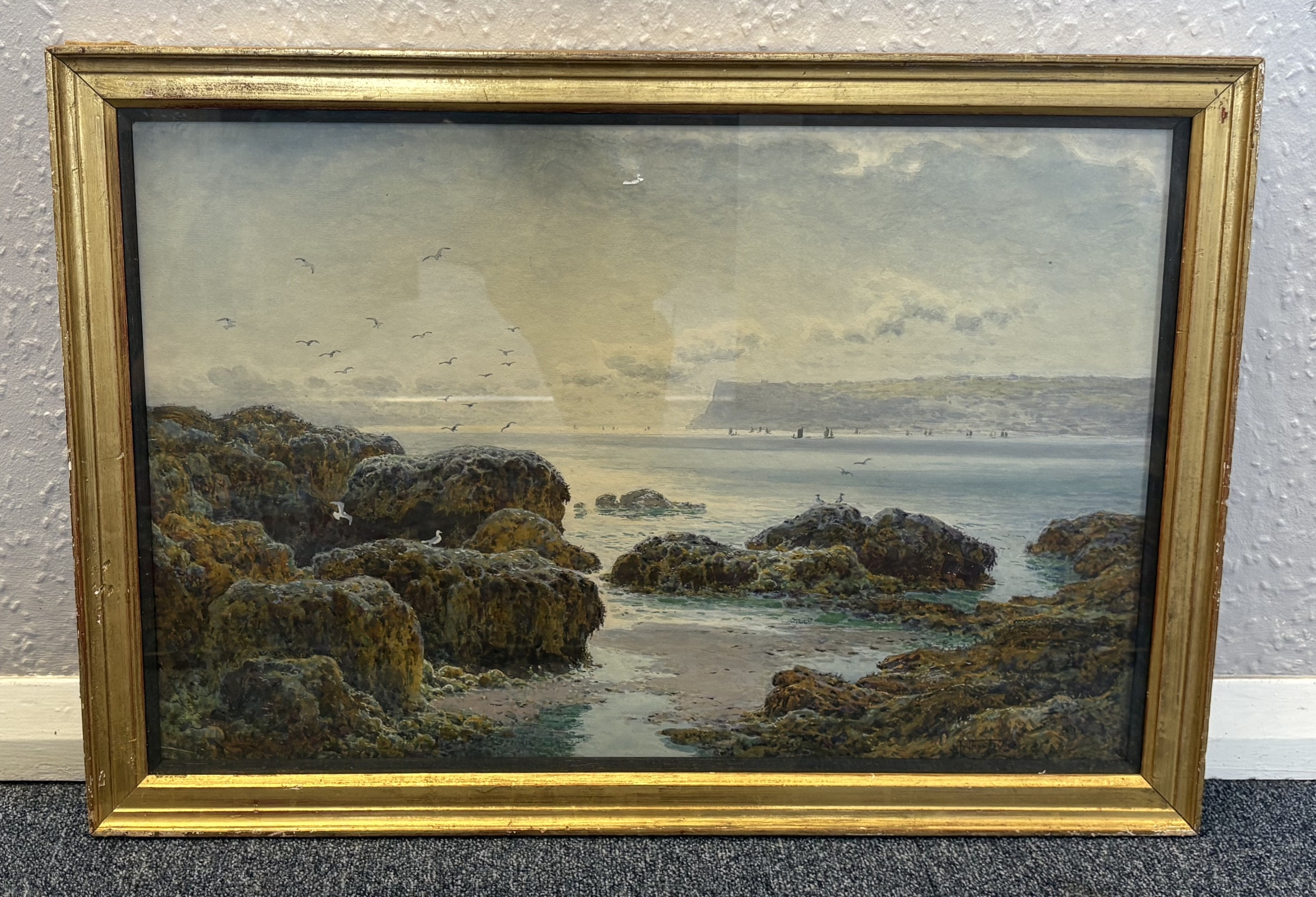 ARTHUR SUKER: (British, 1857 - 1902): A gilt framed and glazed watercolour depicting seagulls flying over rocks at Torbay, Devon. Signed to bottom right. Approx. 58 cm x 39 cm (ss). Est. £150 - £200.