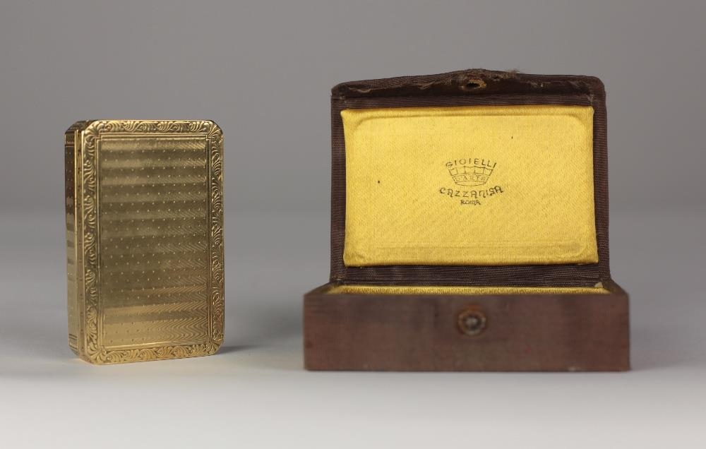 An attractive and fine quality engraved and decorated gold Box, by Gioielli Cazzaniga, Roma, in original case with label, approx. 8 cms (3") long and 4.12 ounces. (1)