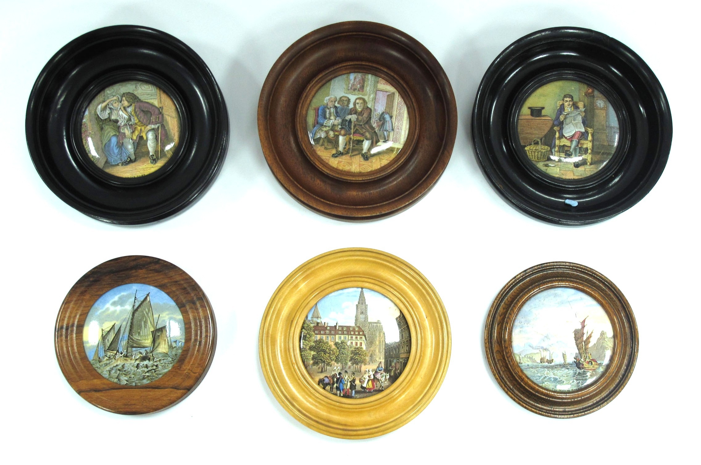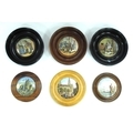 Six Framed XIX Century Pottery Pot Lids, to include: 'Uncle Toby', 'The Times', 'Dr Johnson', ' The Ning Po River' etc, 15-19cm diameter (including frames). (6)