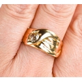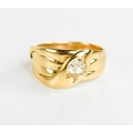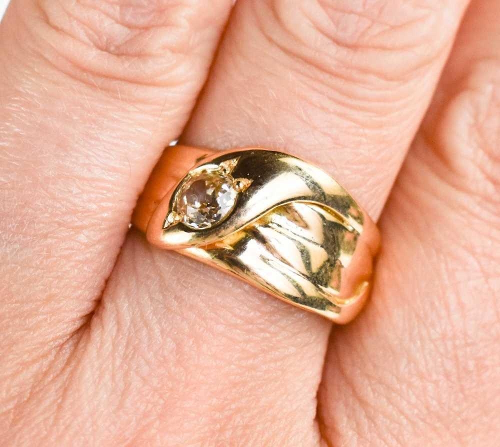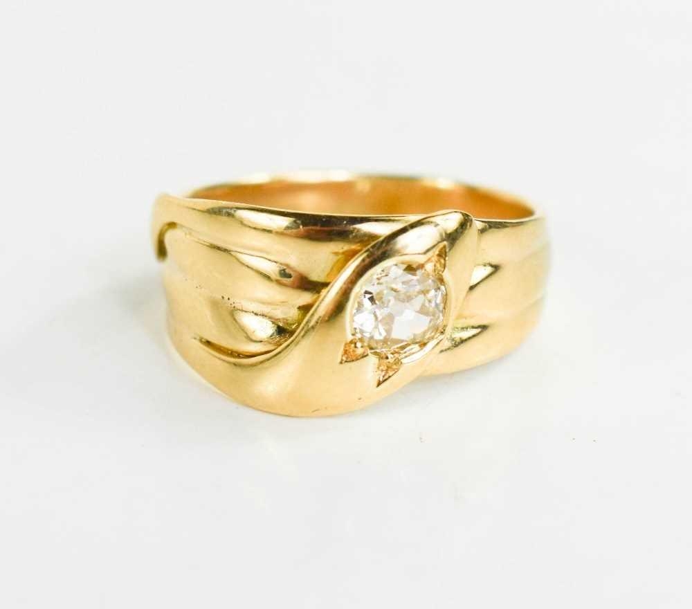 A gold and diamond snake form ring, unmarked but testing as 18ct gold, set with a 1ct diamond to the head of the snake, size R, 7.1g.