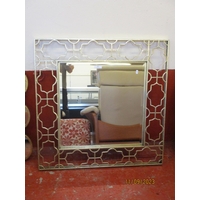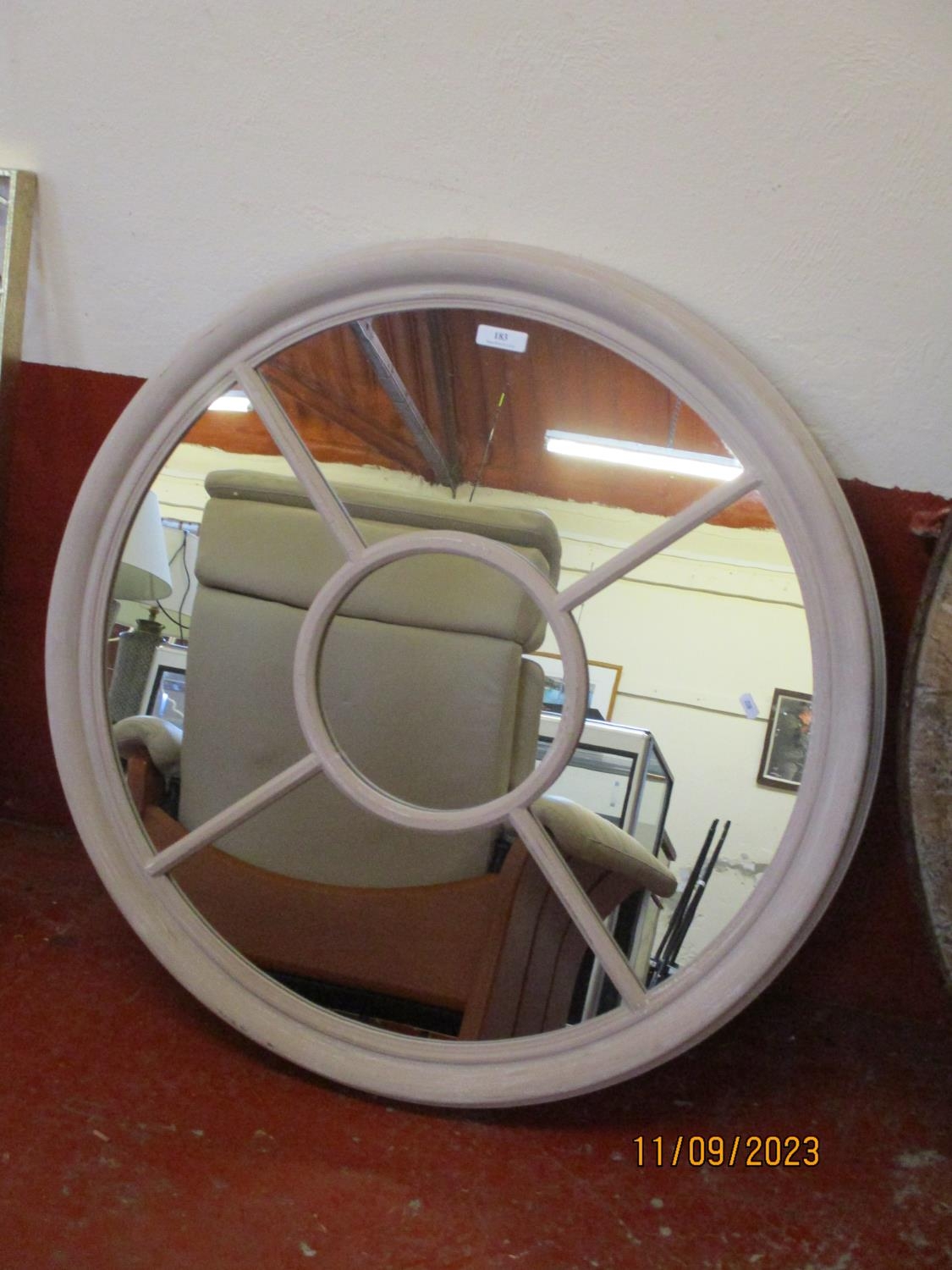 A circular wall mirror with shabby chic frame and partitions