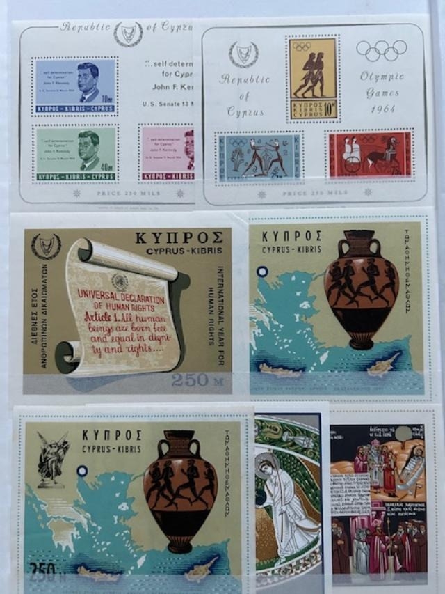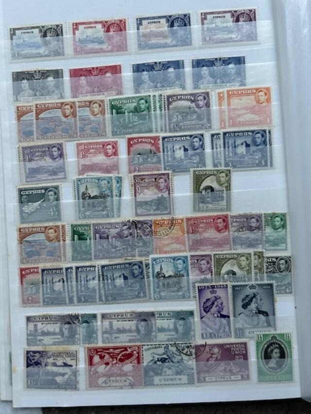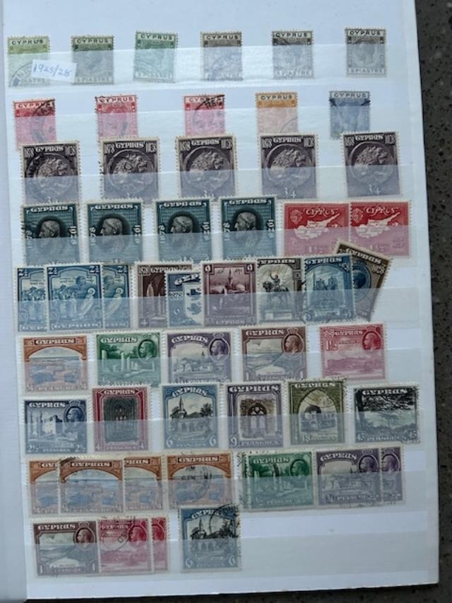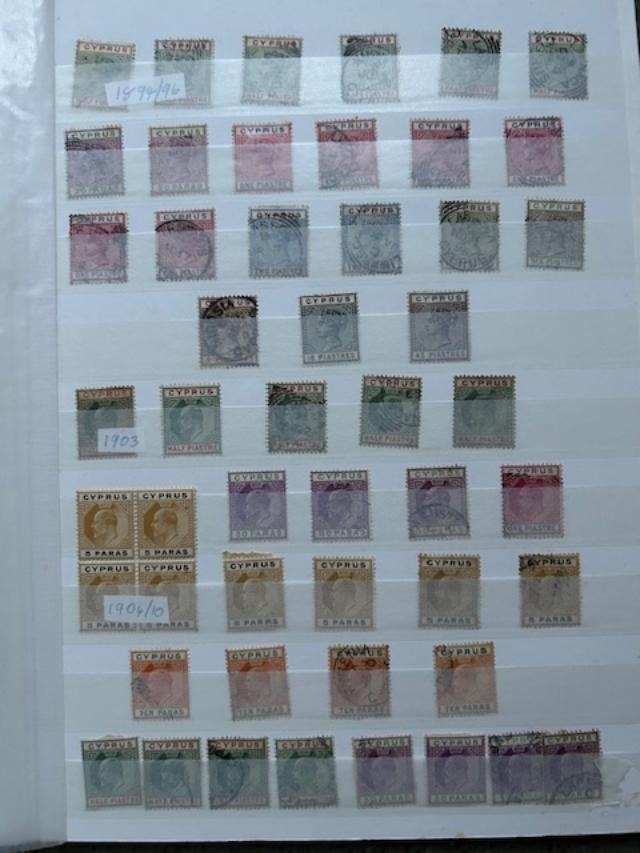 Cyprus QV-QE with QV to 45pi M, KEVII to 45pi M, KGV £1 fiscal, 1924-8 to 90pi M + £5 clever forgery, 1928 £1 U (tone-spots) 1934 to 45pi U, KGVI, QE to 1980s. (100s) (E)