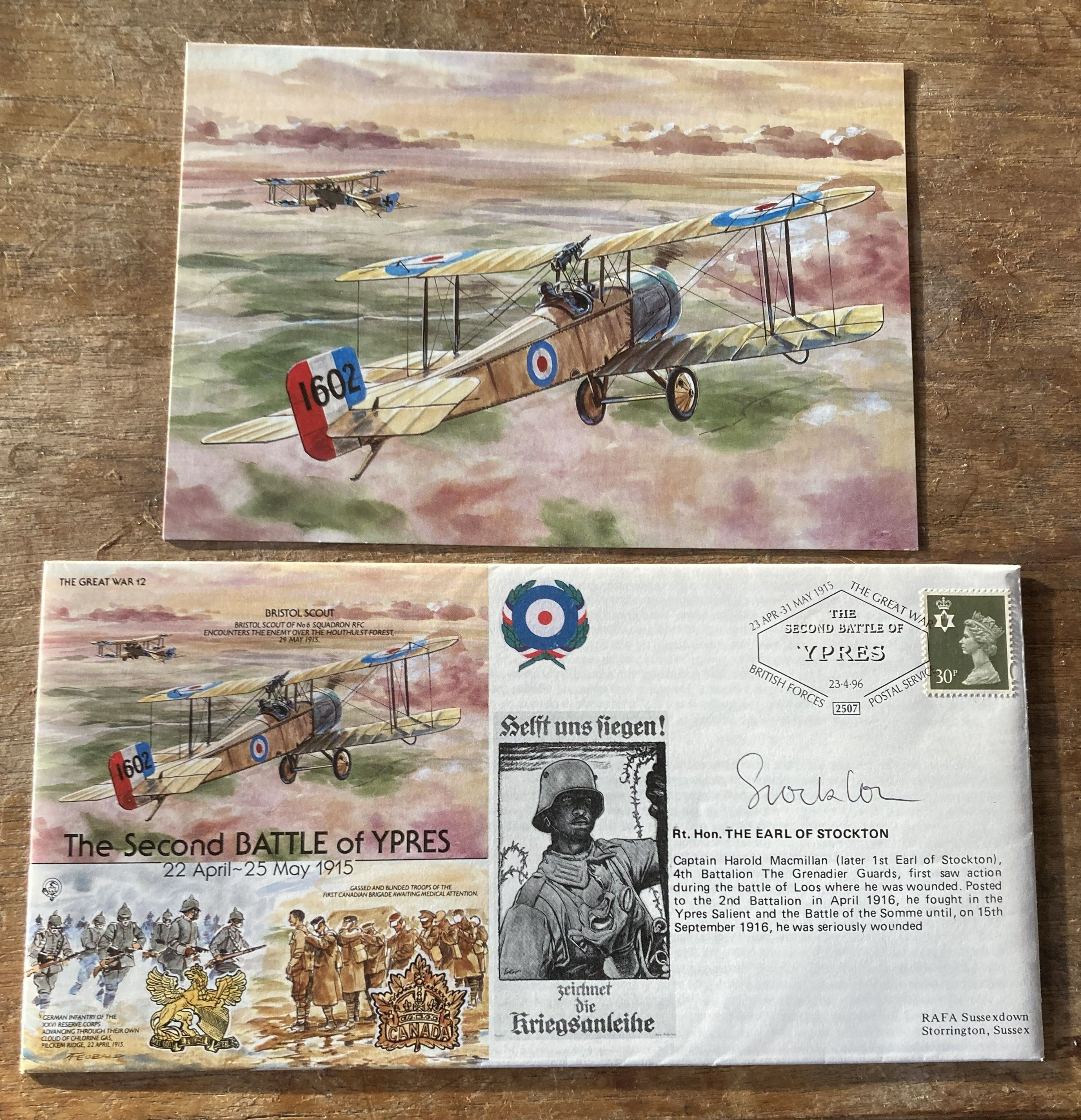 WW1 The Great War 12 cover 80th anniv The Second Battle of Ypres 22 Apr - 25 May 1915 signed Rt Hon The Earl of Stockton - Capt Harold Macmillan 4th Battalion The Grenadier Guards signed WW1 FDC. With additional colour postcard of Bristol Scout in Flight. Single Vendor collection. Good condition. We combine postage on multiple winning lots and can ship worldwide. UK postage from £5.99, EU from £7.99, Rest of World from £9.99.