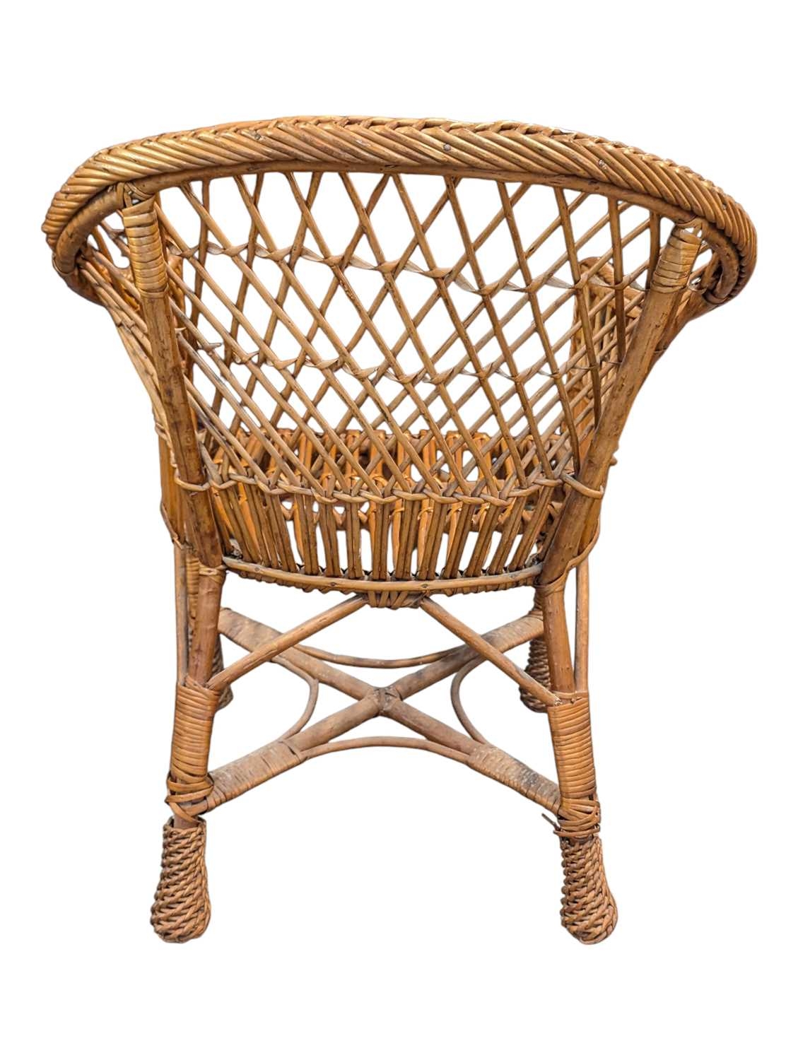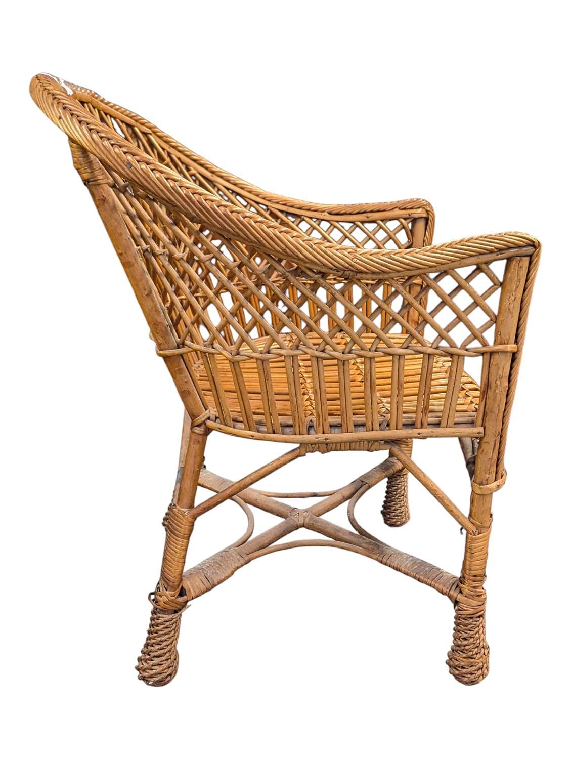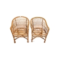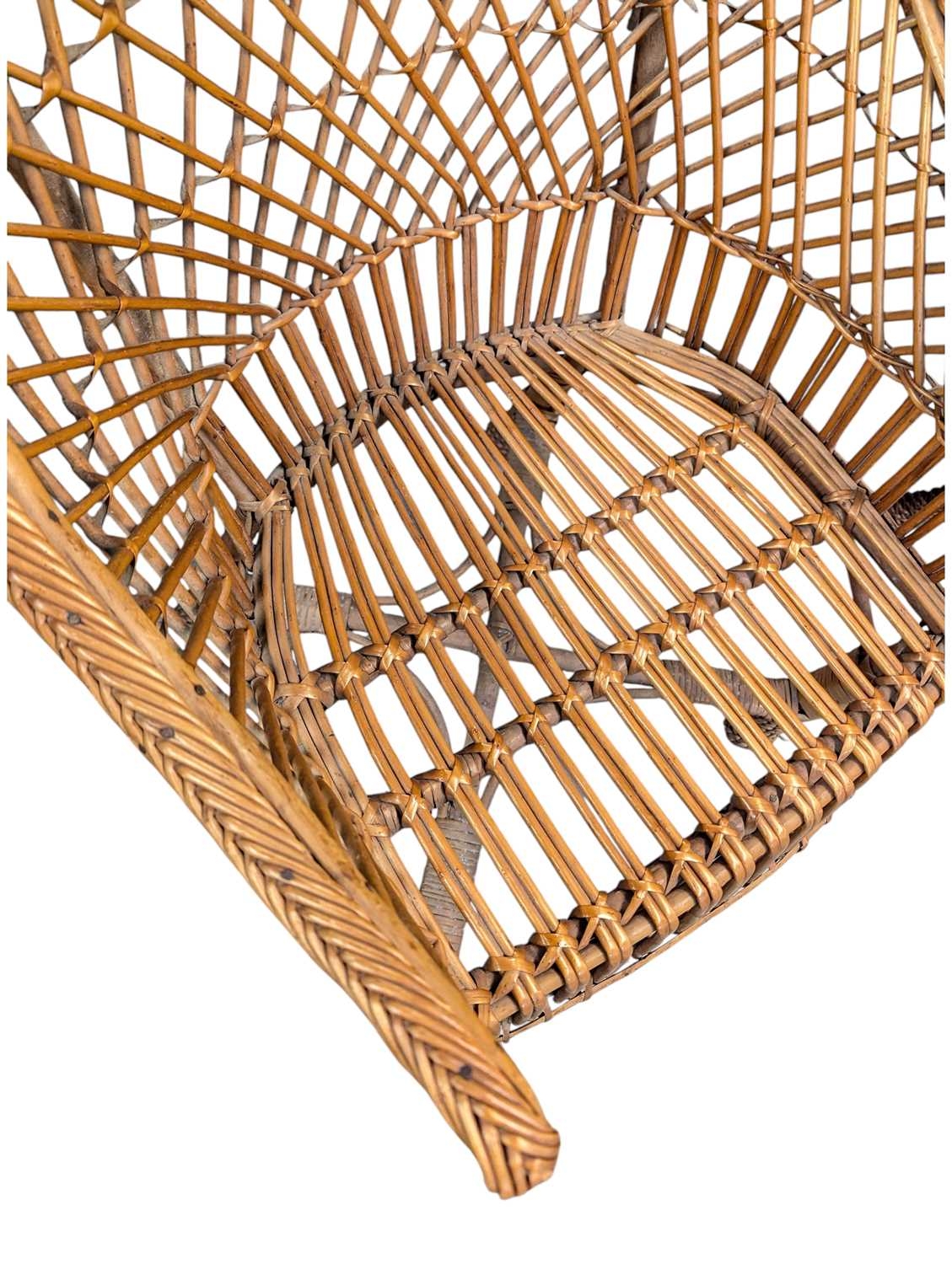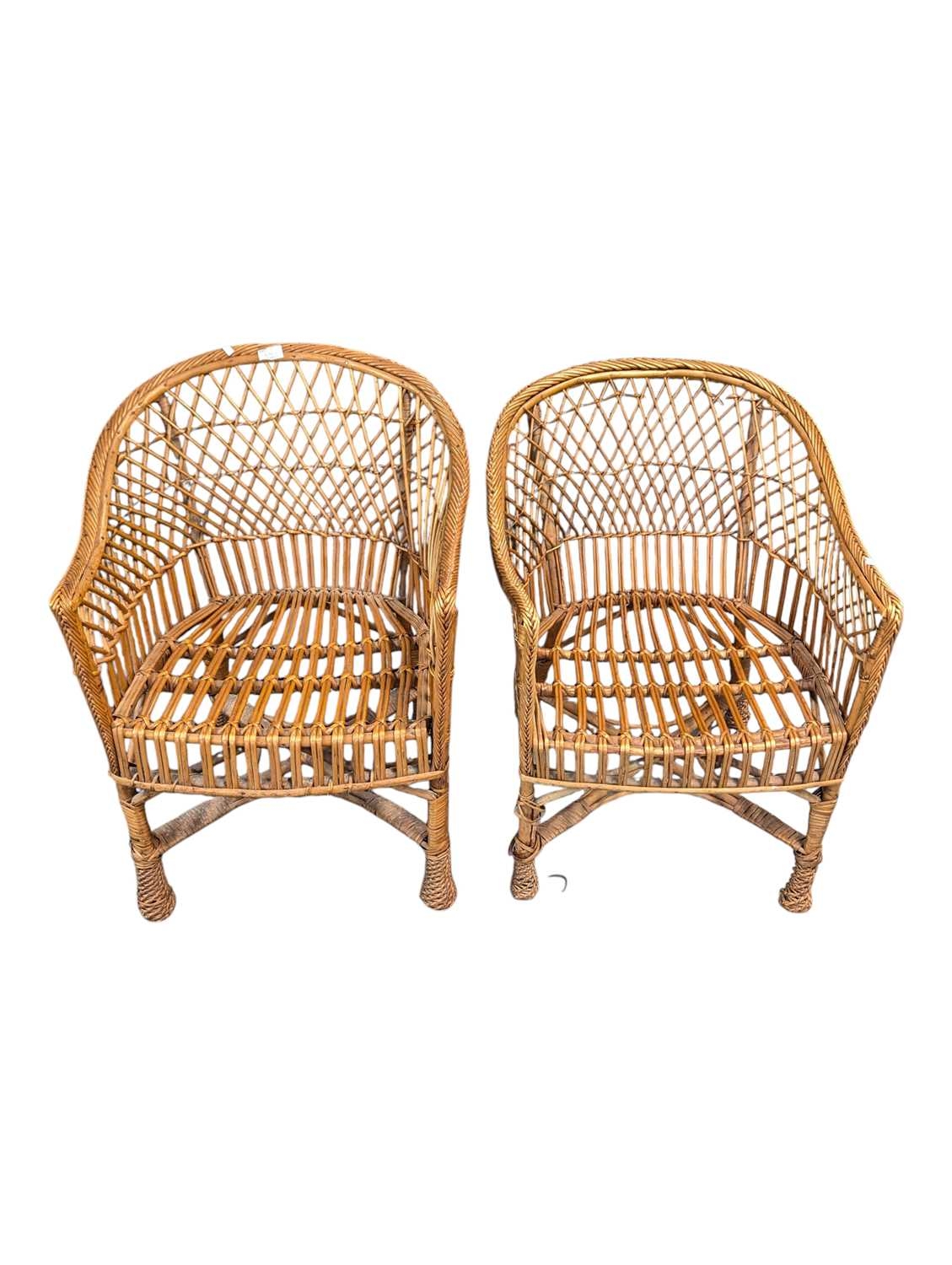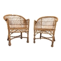 Italian Modern Design 0 Two vintage 20th century rattan / wicker cane hoop back conservatory orangery chairs. The armchairs with curved frames and armrests havin lattice worked rattan back rests.