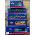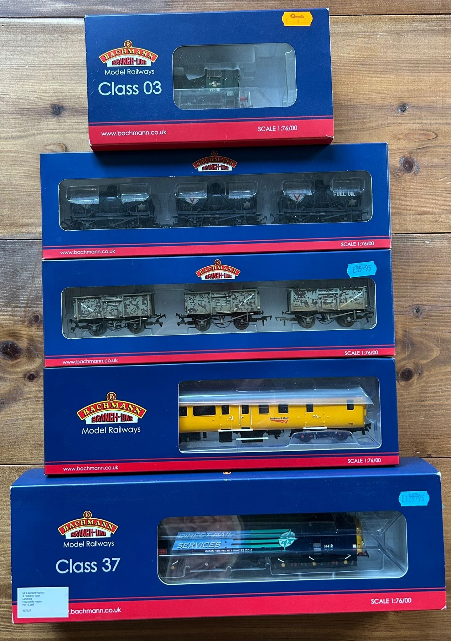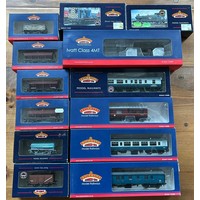Bachmann Branch-Line OO Railway. A Class 37 Diesel Electric Locomotive 37419 'Carl Haviland' (No. product No.). In Direct Rail services livery. A BR Class 03 Diesel Shunter, D2011 (31-360). In plain Green livery, 6DCC. Together with 2x 3 Wagon sets - 14T Tank Wagons, FINA and BR grey Mineral Wagons, all weathered. Plus a BR Mk2F DBSO (Refurbished) Network Rail. All boxed, Class 37 box is associated. Contents looks to be as new. (5)