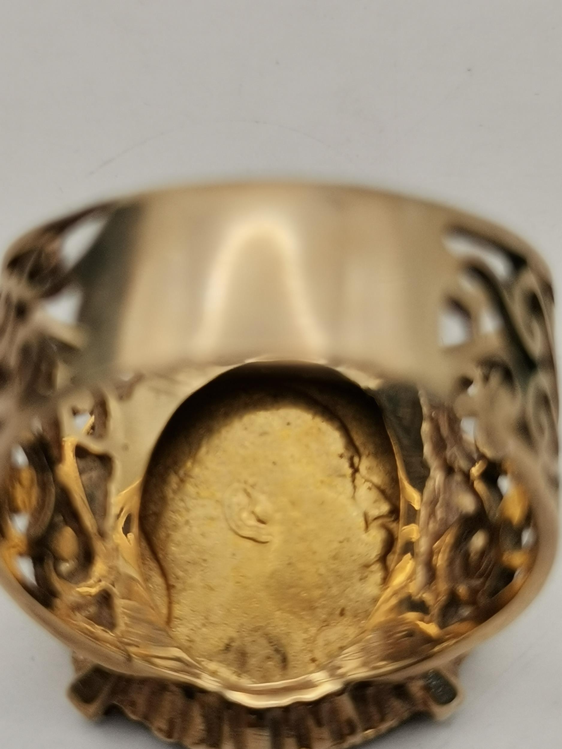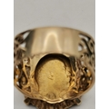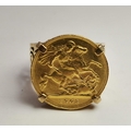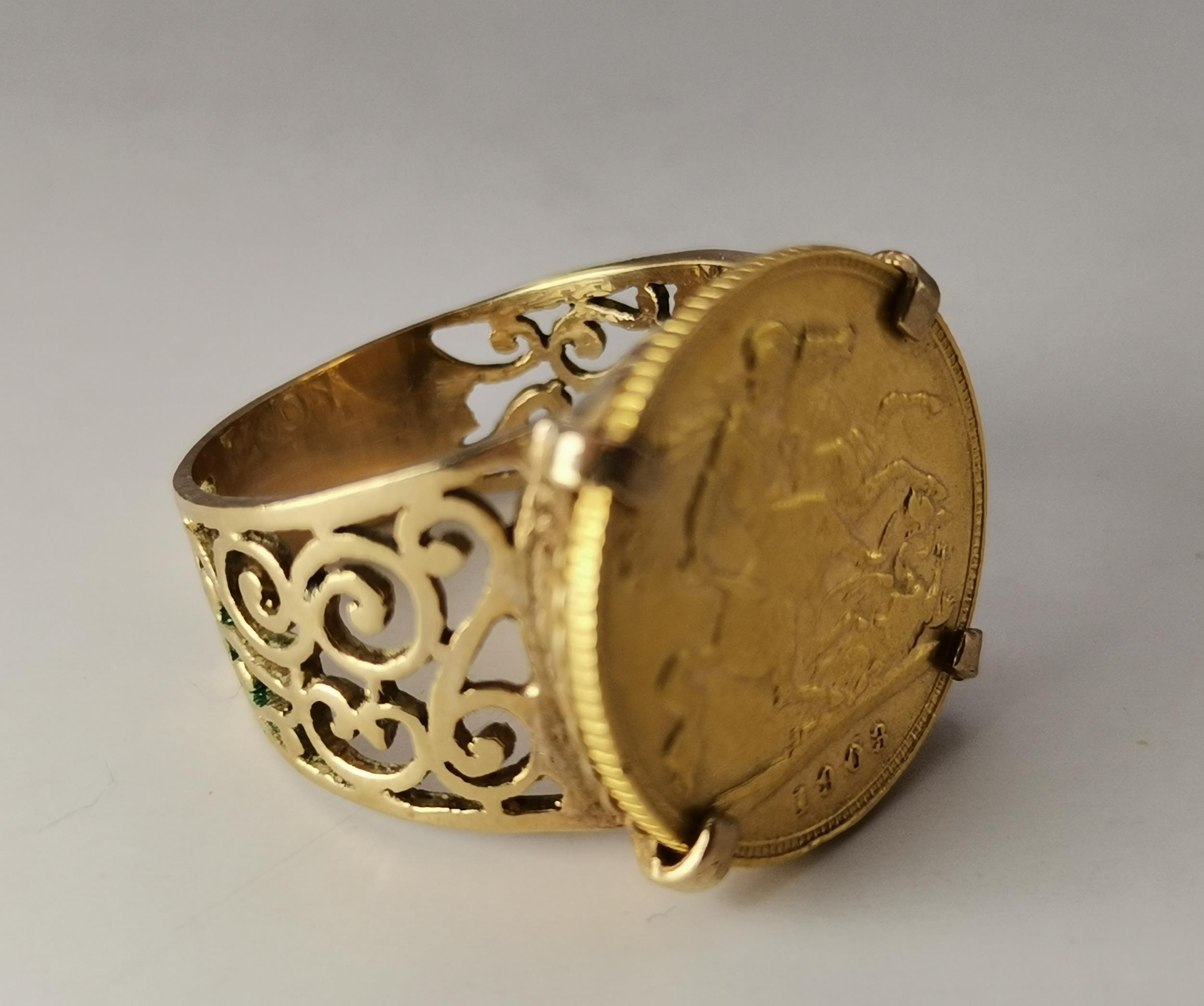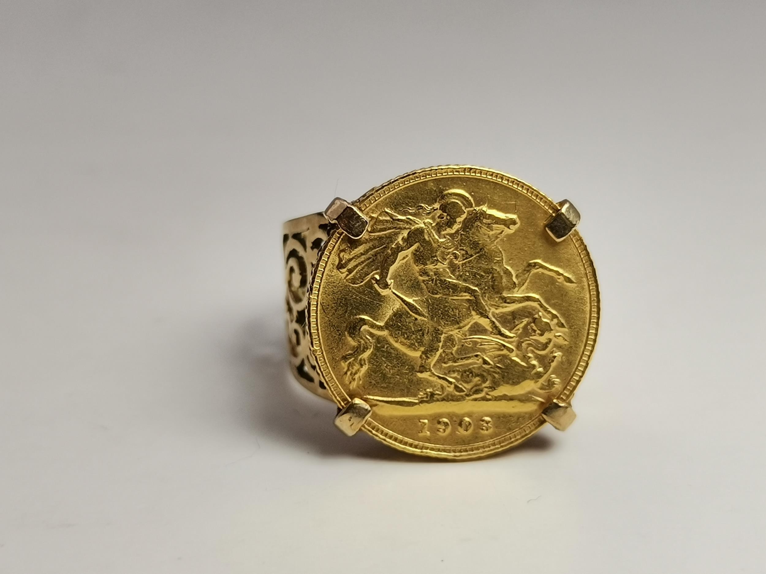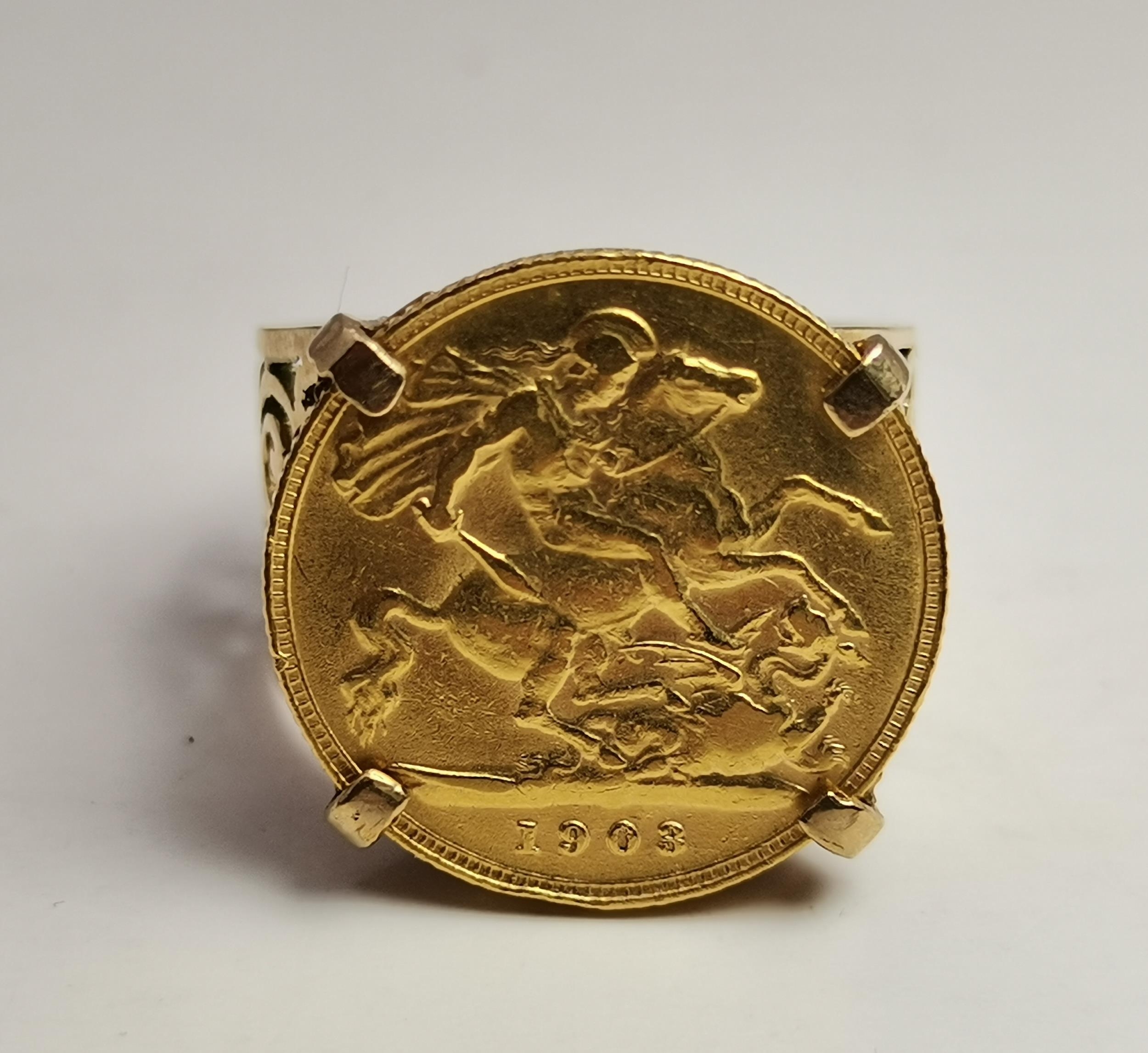 A 9 carat gold-mounted Edward VII 1903 half sovereign ring, the coin claw-mounted to a broad shank with scrolling pierced shoulders, hallmarked 375. Ring size S, 8.9g gross