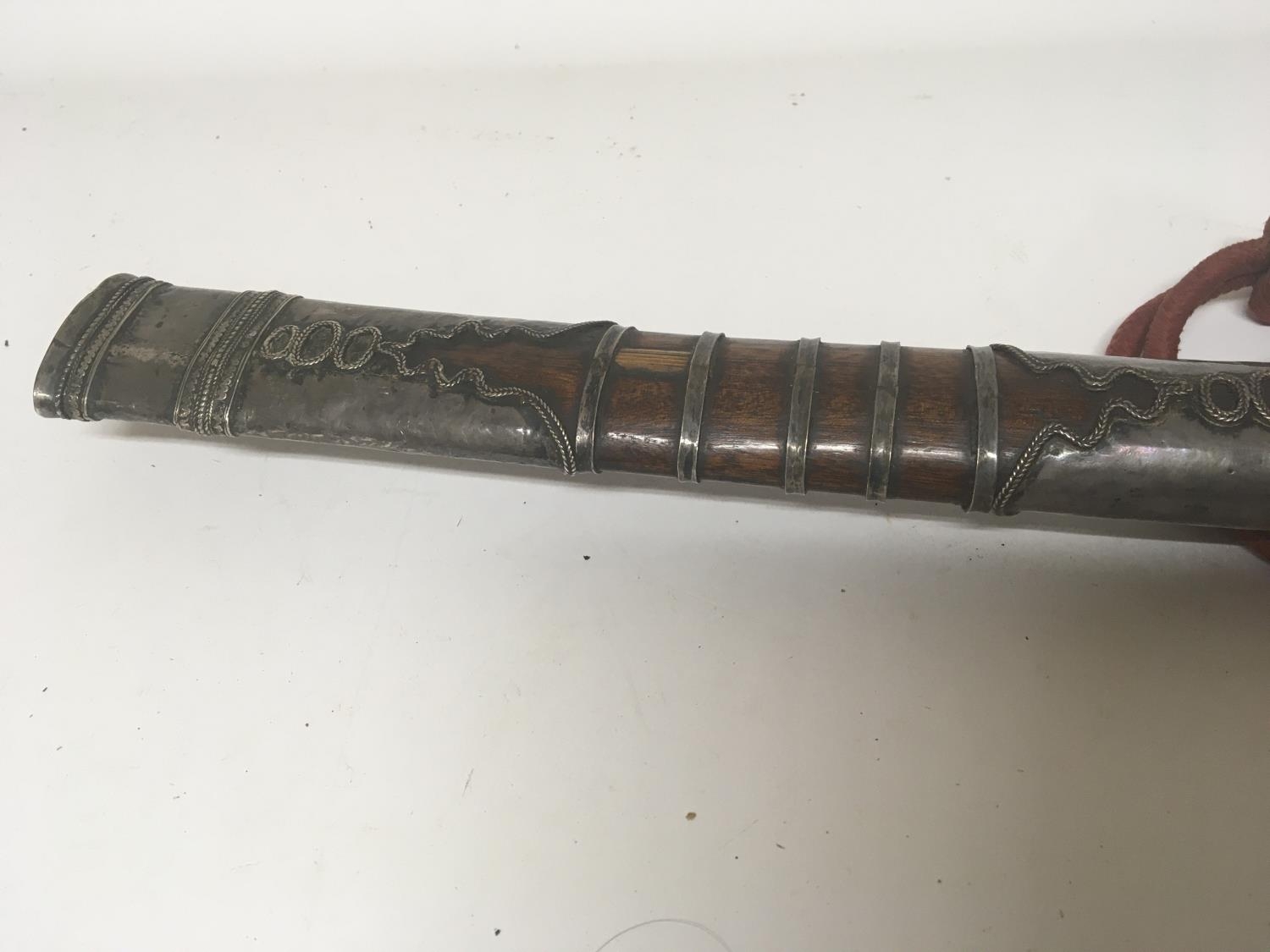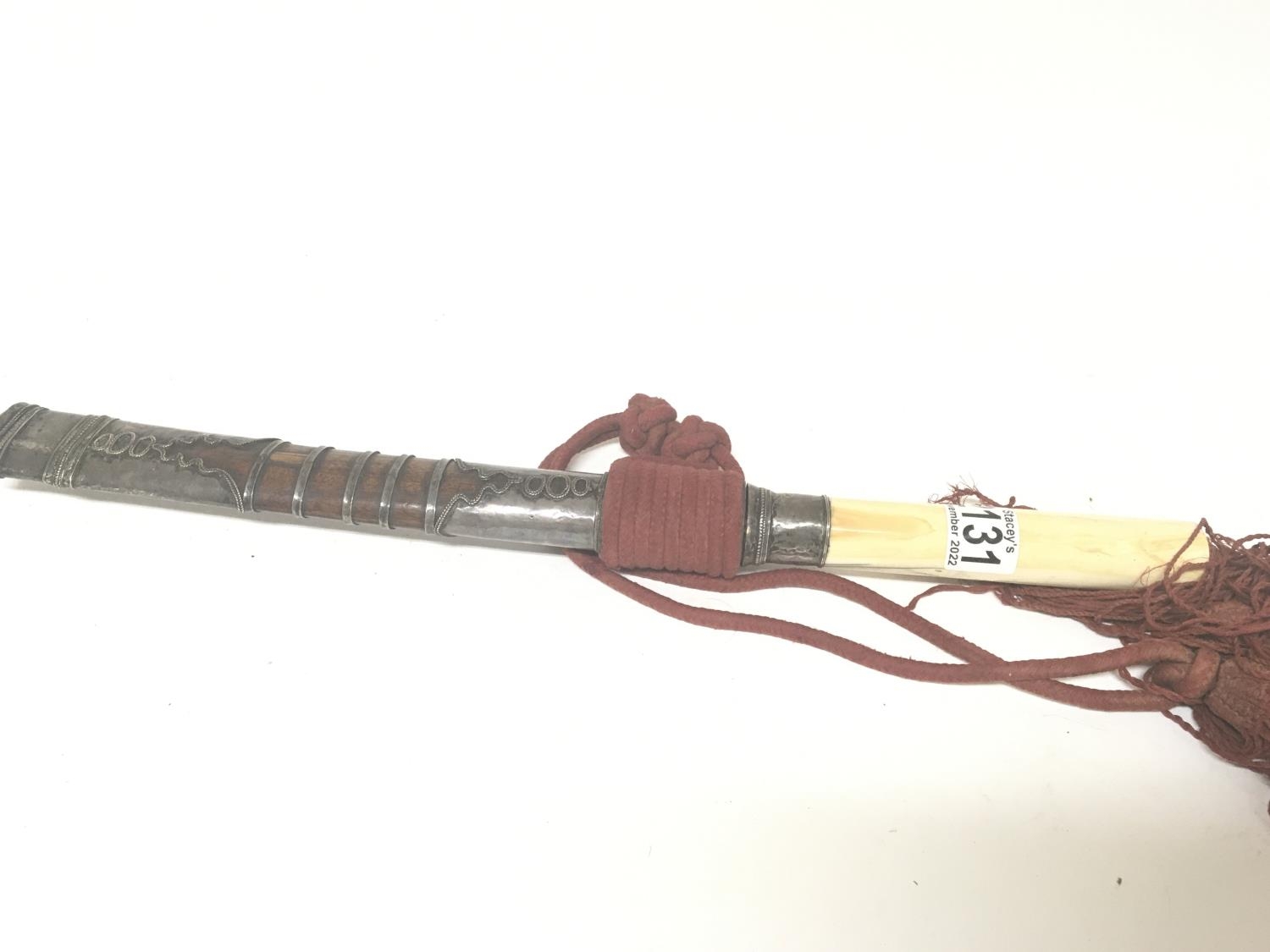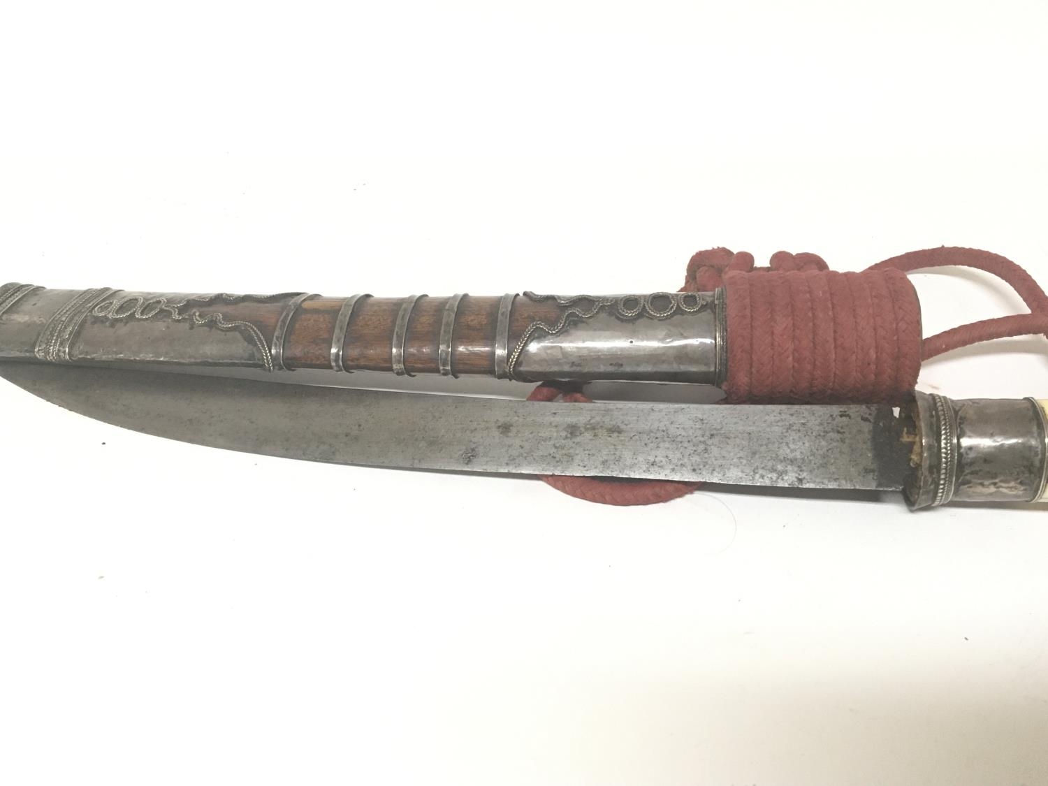 An Antique white metal mounted Tanto short sword the scabbard with applied white metal and attached tassel. Length 47cm.
