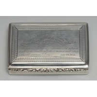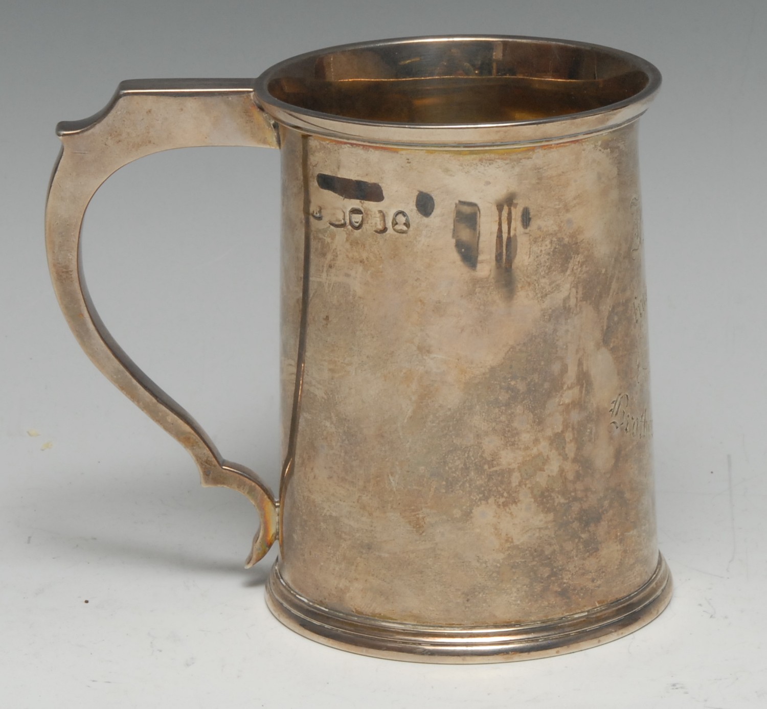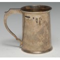 A William IV silver cylindrical mug, flared rim, angular scroll handle, skirted base, Masonic inscription, 10.5cm high, William Bateman, London 1834,