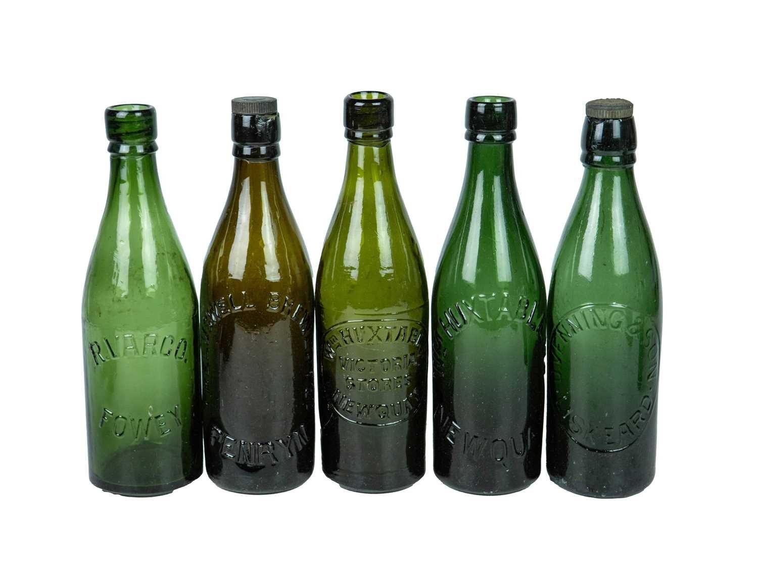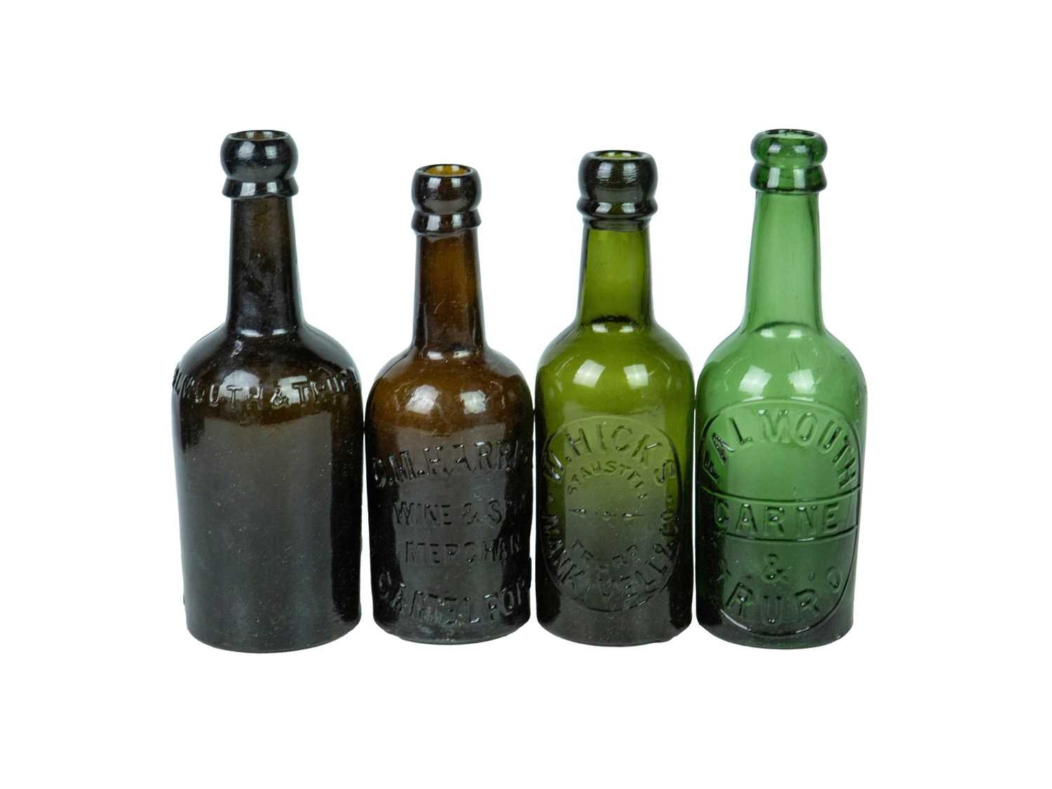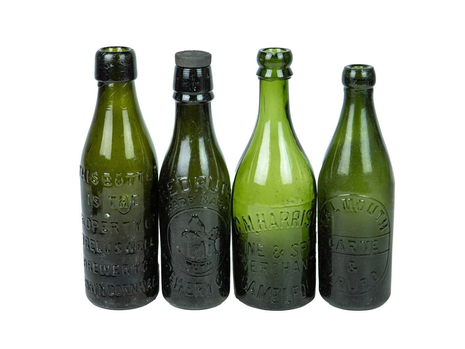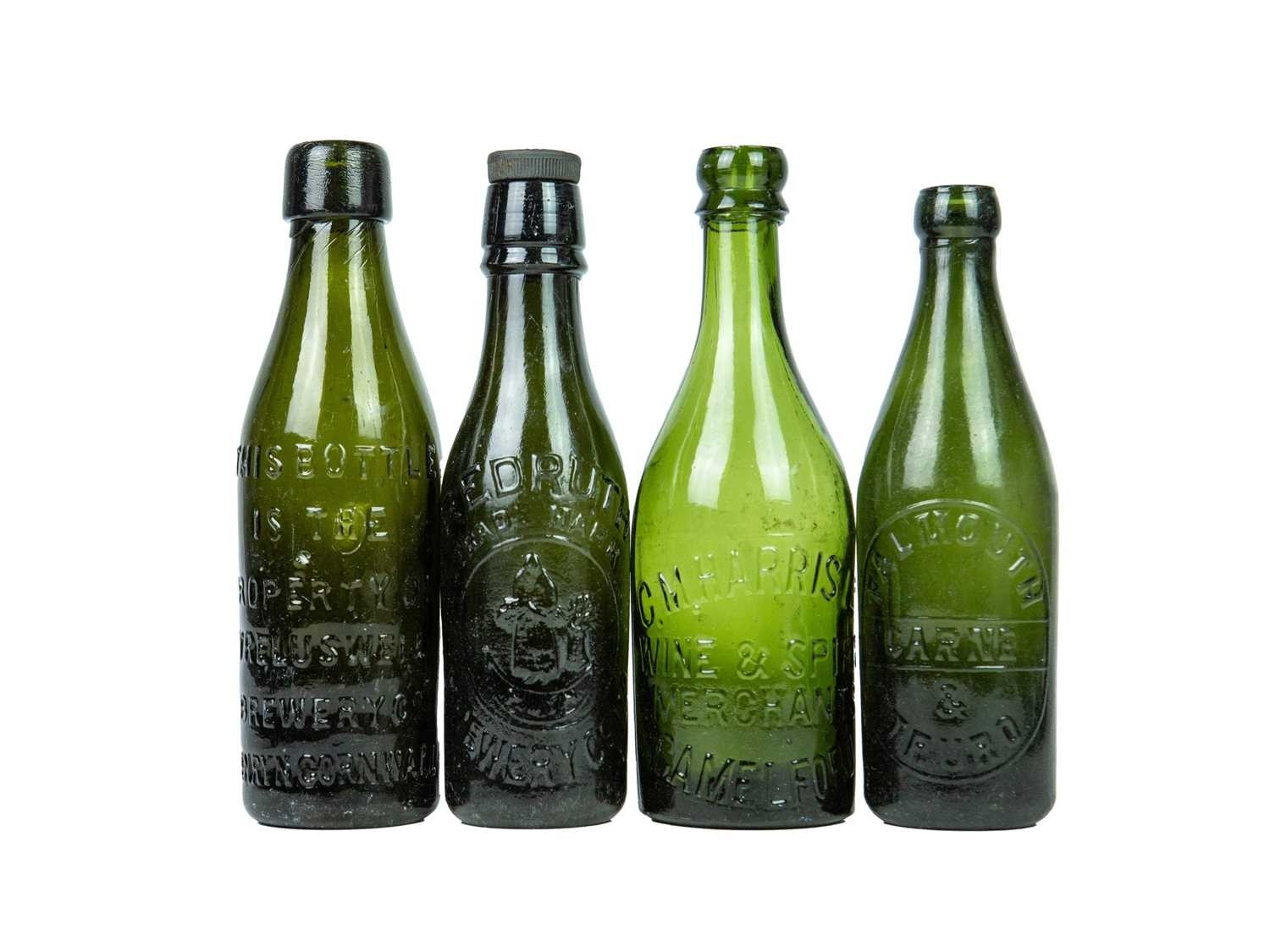 A collection of local interest (Cornish) green glass bottles. Comprising a 'Redruth Brewery Co. Ltd' bottle, a 'Treluswell Brewery Co. Penryn' bottle, plus another bearing the moulded inscription 'This bottle is the property of Treluswell Brewery Co. Penryn Cornwall', a 'W. Hicks Nankivell & Co' bottle, 'D Venning & Son Liskeard' and 'R. Varco Fowey' examples, together with two 'Wm Huxtable Ltd Newquay', two 'C.M. Harris Ld...Camelford' and three 'Carne Falmouth & Truro' bottles (13).