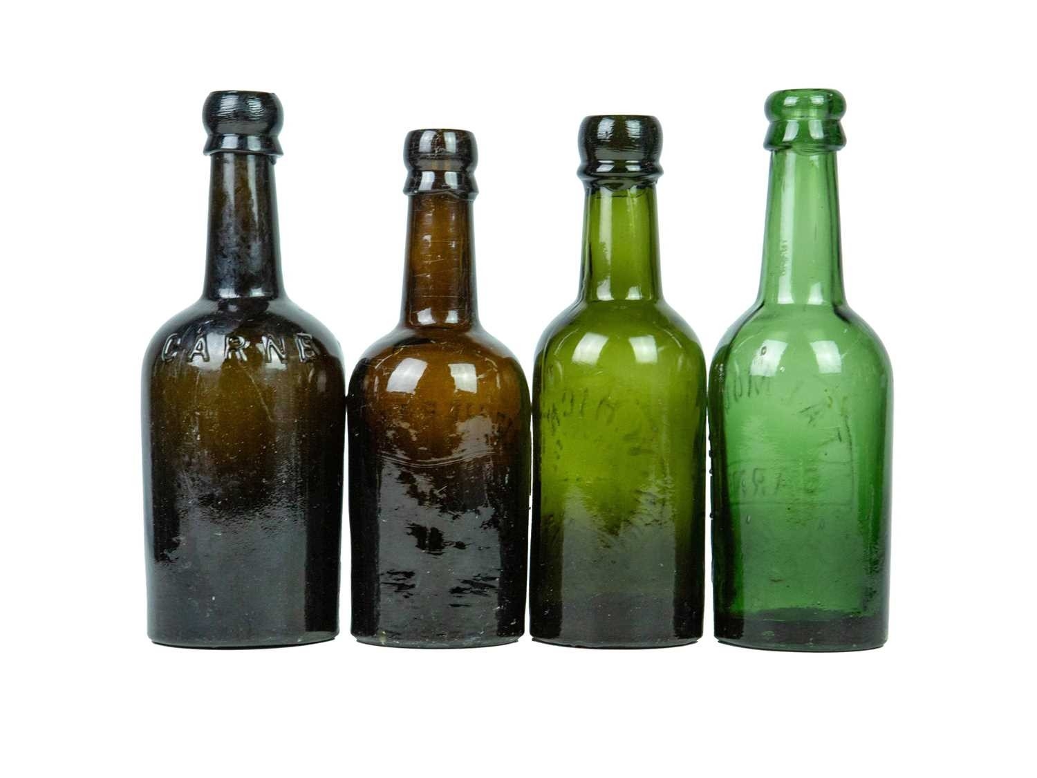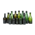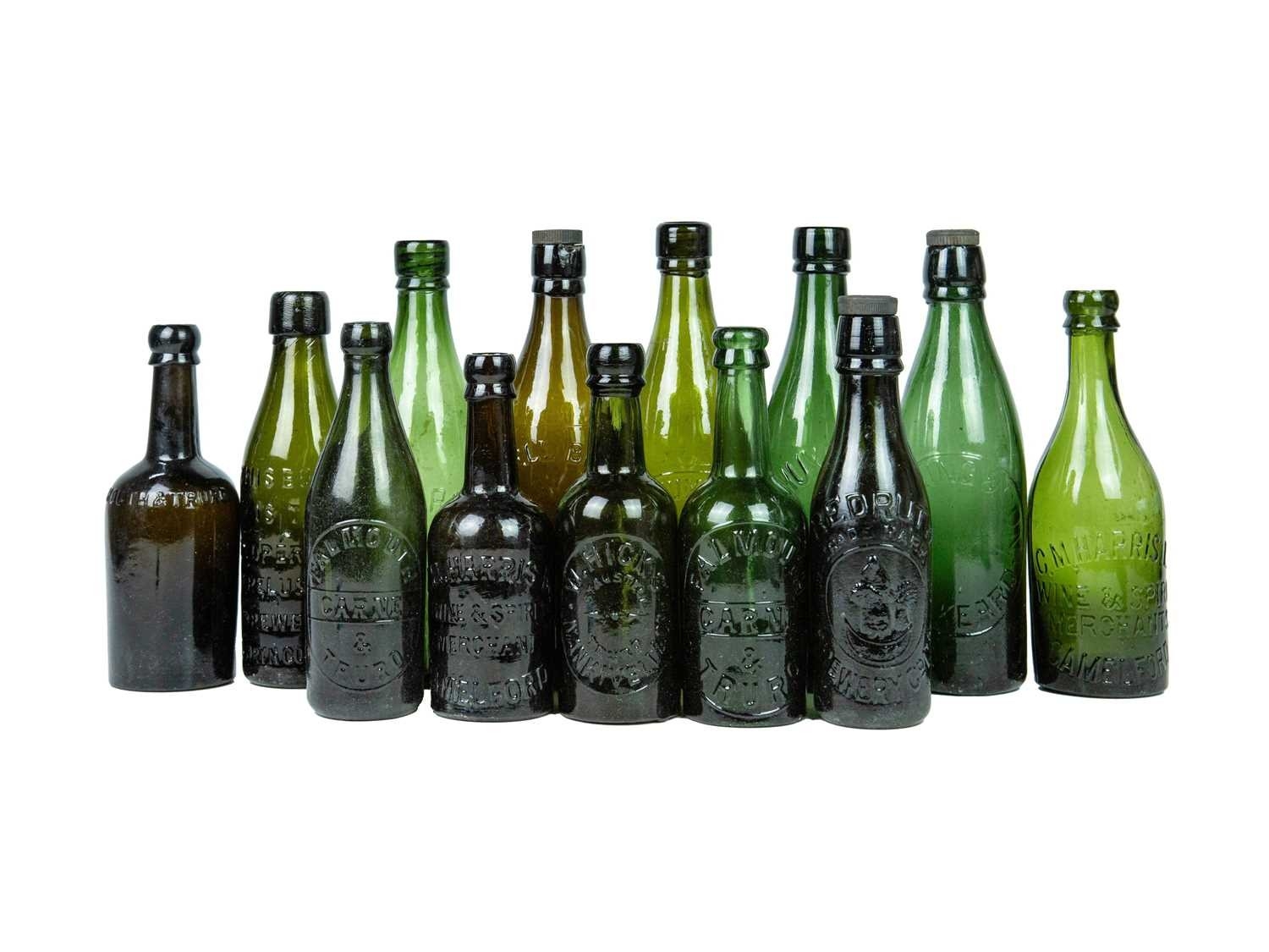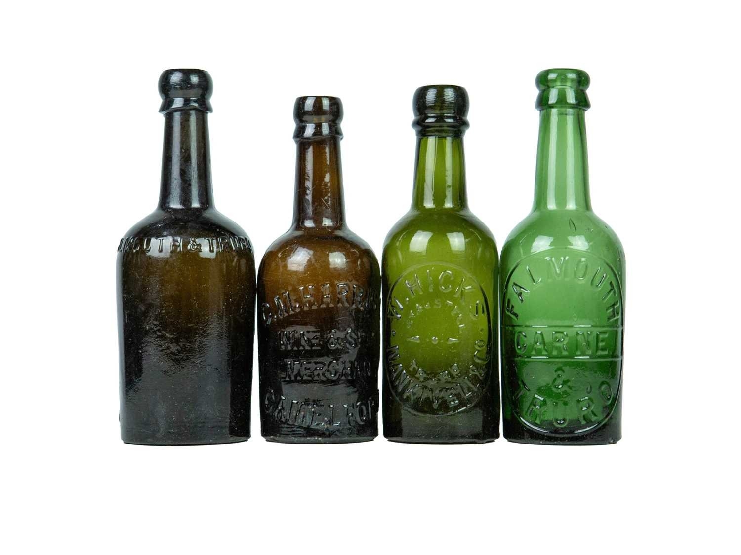 A collection of local interest (Cornish) green glass bottles. Comprising a 'Redruth Brewery Co. Ltd' bottle, a 'Treluswell Brewery Co. Penryn' bottle, plus another bearing the moulded inscription 'This bottle is the property of Treluswell Brewery Co. Penryn Cornwall', a 'W. Hicks Nankivell & Co' bottle, 'D Venning & Son Liskeard' and 'R. Varco Fowey' examples, together with two 'Wm Huxtable Ltd Newquay', two 'C.M. Harris Ld...Camelford' and three 'Carne Falmouth & Truro' bottles (13).