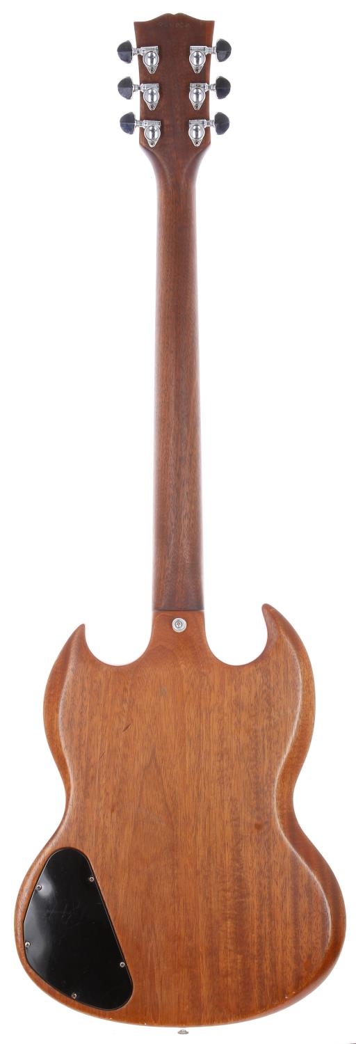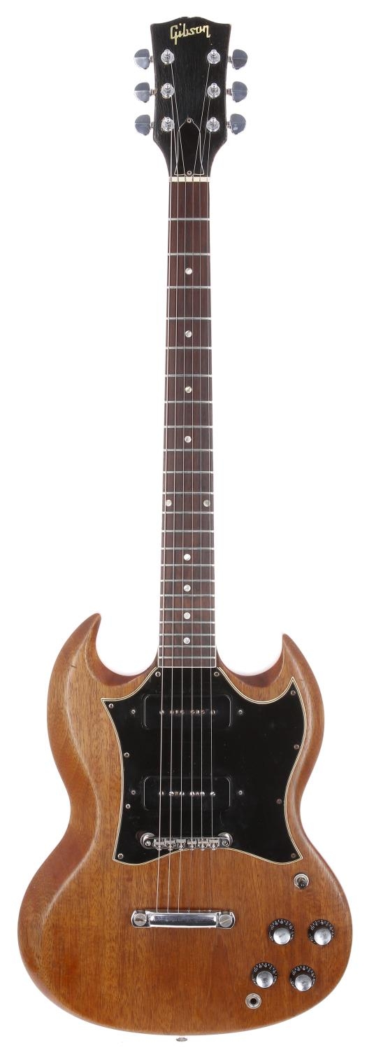 1967 Gibson SG Special electric guitar, made in USA; Body: mahogany, finish stripped to natural, various minor dings and scratches; Neck: finish stripped, a few dings, re-stamped serial number, lacquer checking to head face; Fretboard: rosewood; Frets: mild wear, refret; Electrics: working, one replacement potentiometer, some rewiring, replaced switch; Hardware: replacement Tune-o-Matic bridge, original vibrato removed and converted to stop bar tail, replacement control knobs, replacement Grover tuners; Case: Hiscox hard case; Weight: 2.83kg; Overall condition: good