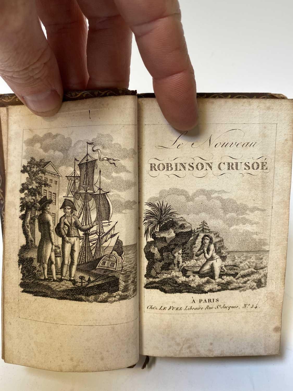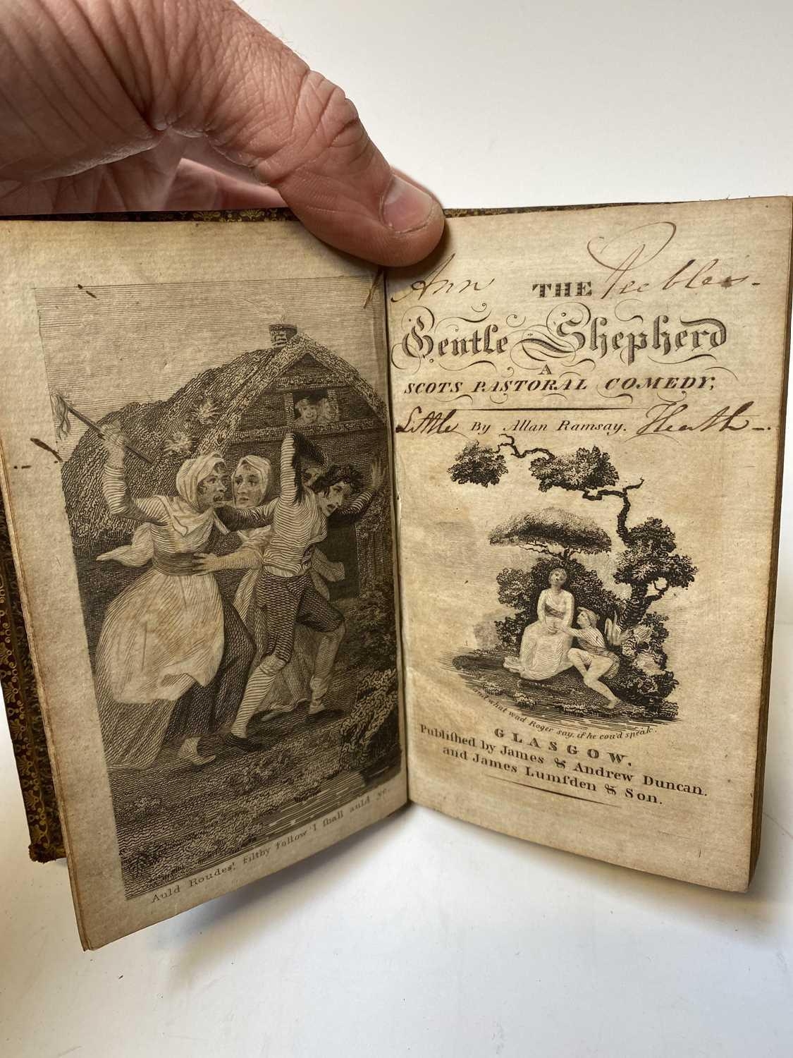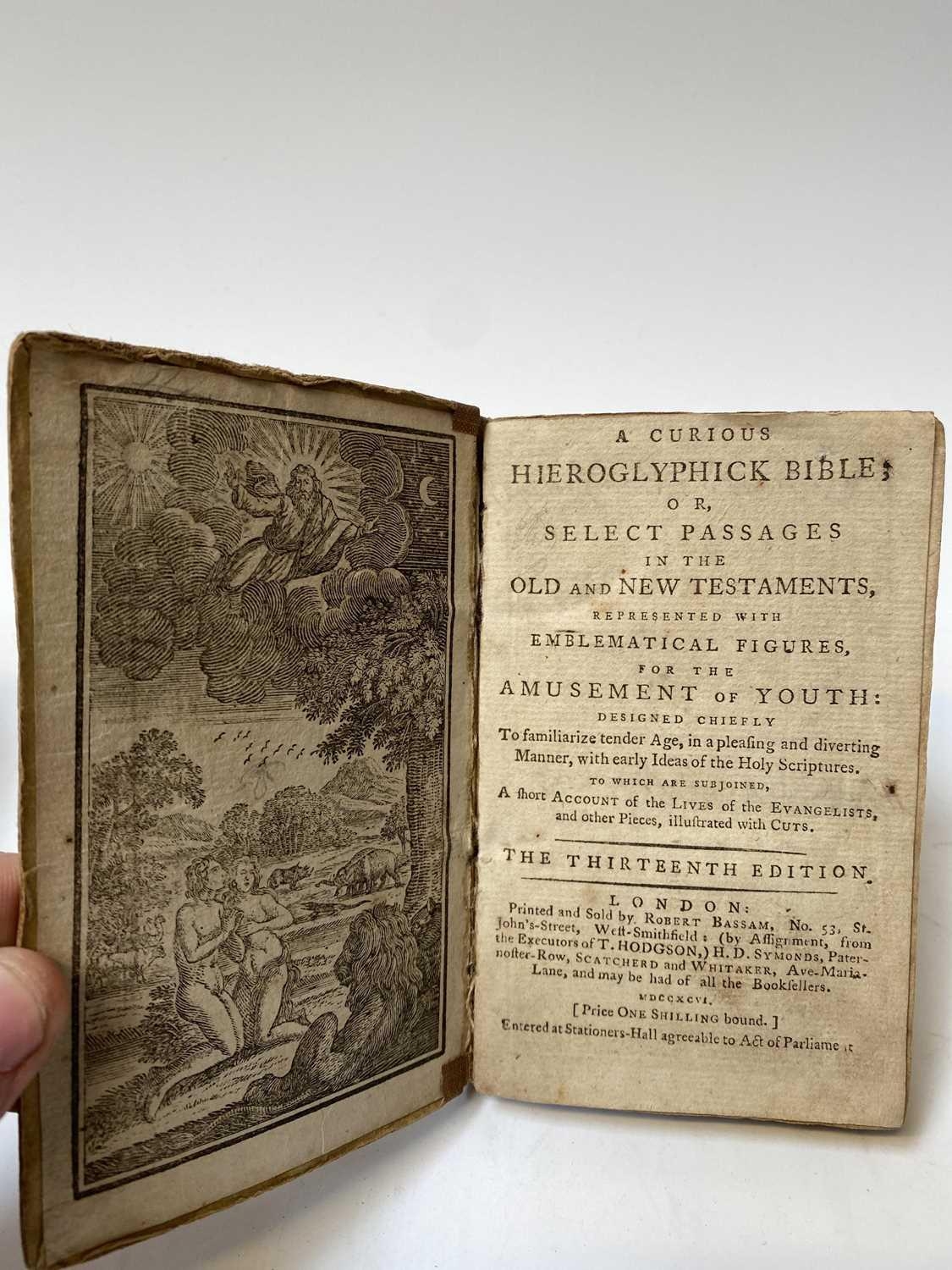 'A Curious Hieroglyphick Bible.....,' thirteenth edition, illustrated card boards, engraved frontispiece, engraved illustrations throughout, printed and sold by Robert Bassam, London, 1796; ALLAN RAMSEY. 'The Gentle Shepherd: A Scot's Pastoral Comedy,' frontispiece, engraved title page, full leather with gilt decorations, James and Andrew Duncan, Glasgow, 1775; DANIEL DEFOE. 'Le Nouveau Robinson Crusoe,' full leather with gilt decorations to spine, engraved title piece and frontis, Le Fuel, Paris; With nine other foreign and small format volumes. (12)