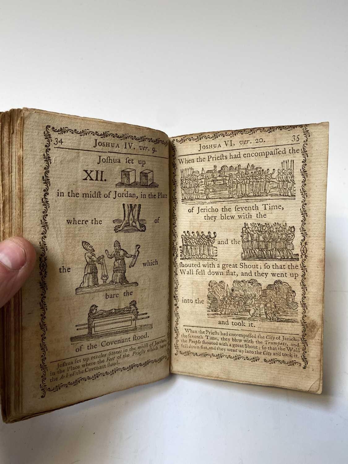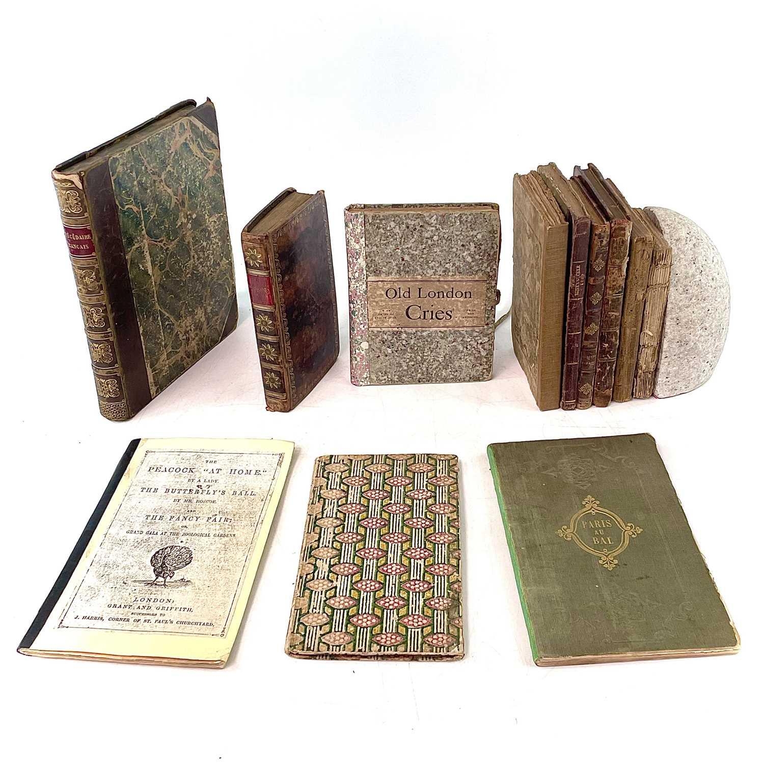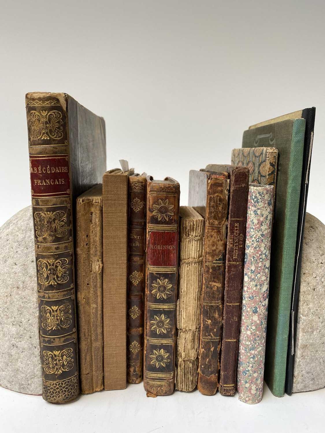 'A Curious Hieroglyphick Bible.....,' thirteenth edition, illustrated card boards, engraved frontispiece, engraved illustrations throughout, printed and sold by Robert Bassam, London, 1796; ALLAN RAMSEY. 'The Gentle Shepherd: A Scot's Pastoral Comedy,' frontispiece, engraved title page, full leather with gilt decorations, James and Andrew Duncan, Glasgow, 1775; DANIEL DEFOE. 'Le Nouveau Robinson Crusoe,' full leather with gilt decorations to spine, engraved title piece and frontis, Le Fuel, Paris; With nine other foreign and small format volumes. (12)