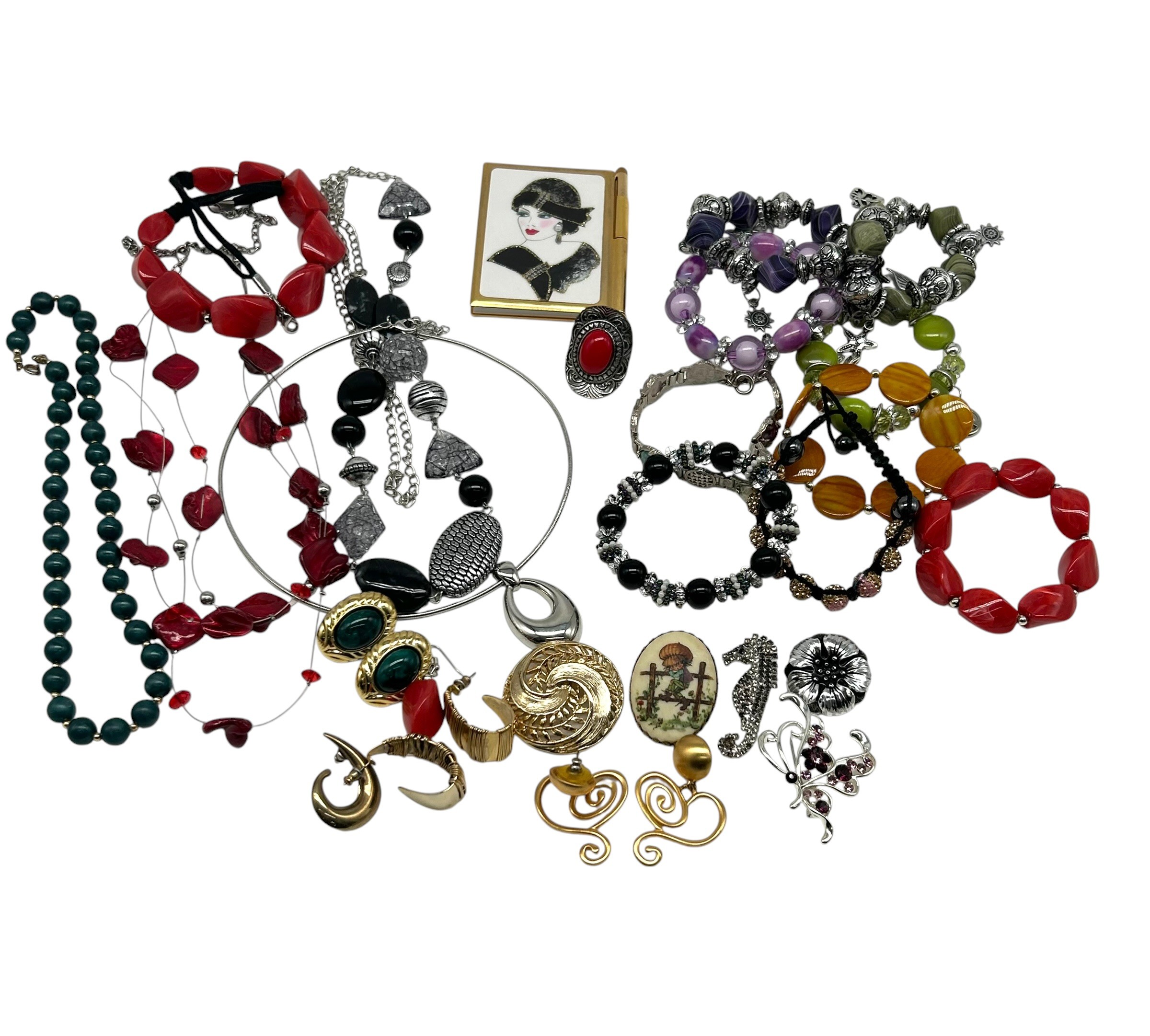 Collection of Costume Jewellery to include Necklaces, Brooches, Earrings and Art Deco Style Notepad