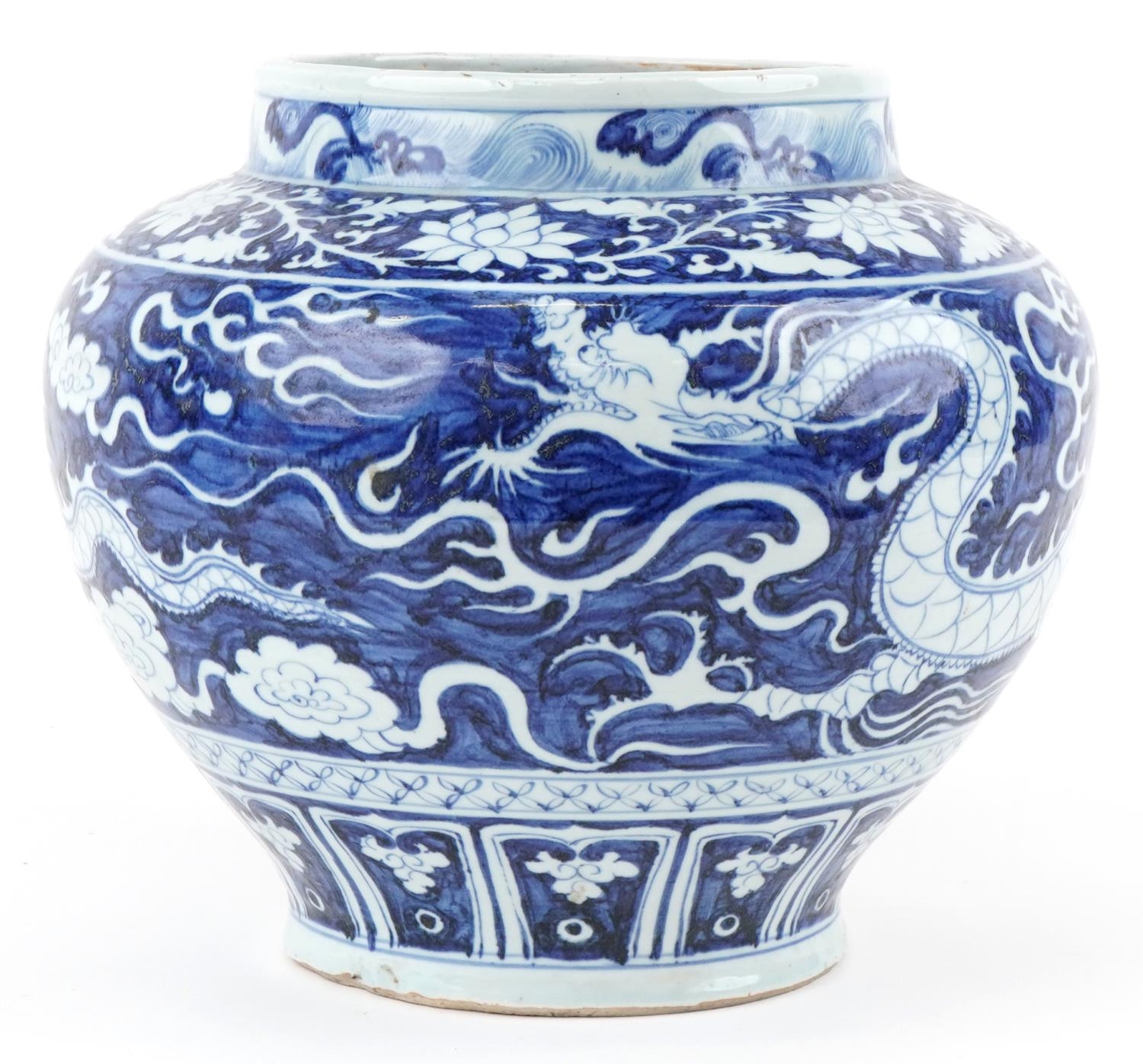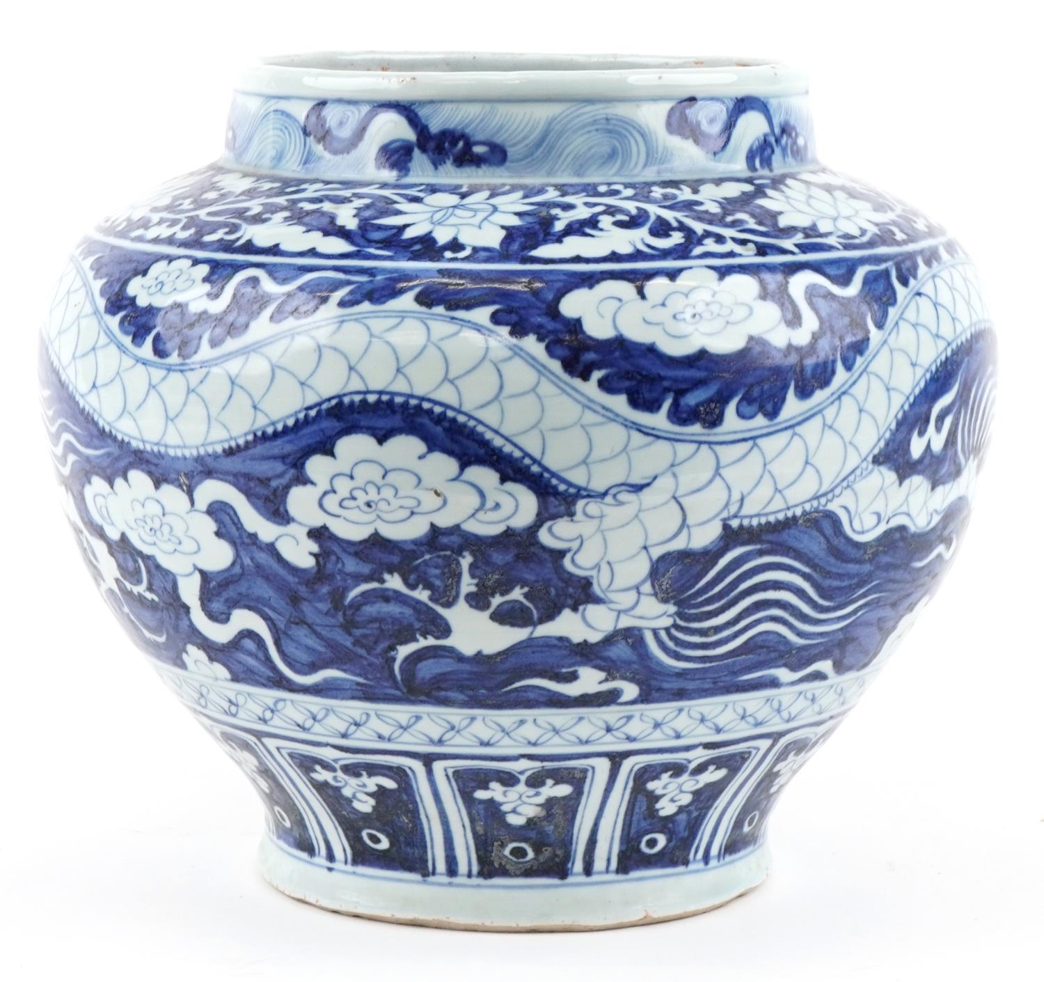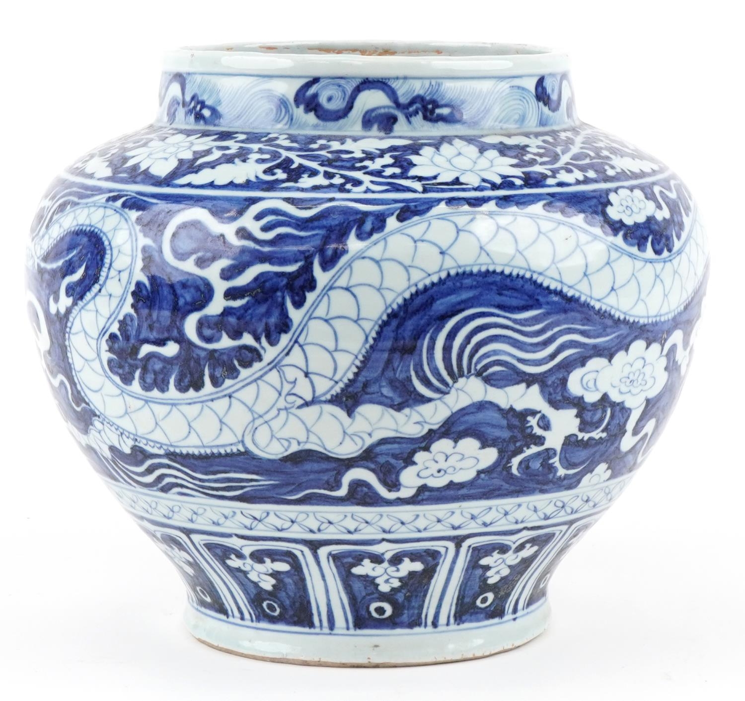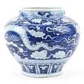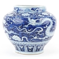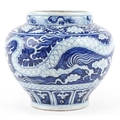 A large Chinese blue and white porcelain vase hand painted with a dragon and foliage, 20th century, 28cm high x 29cm in diameter.