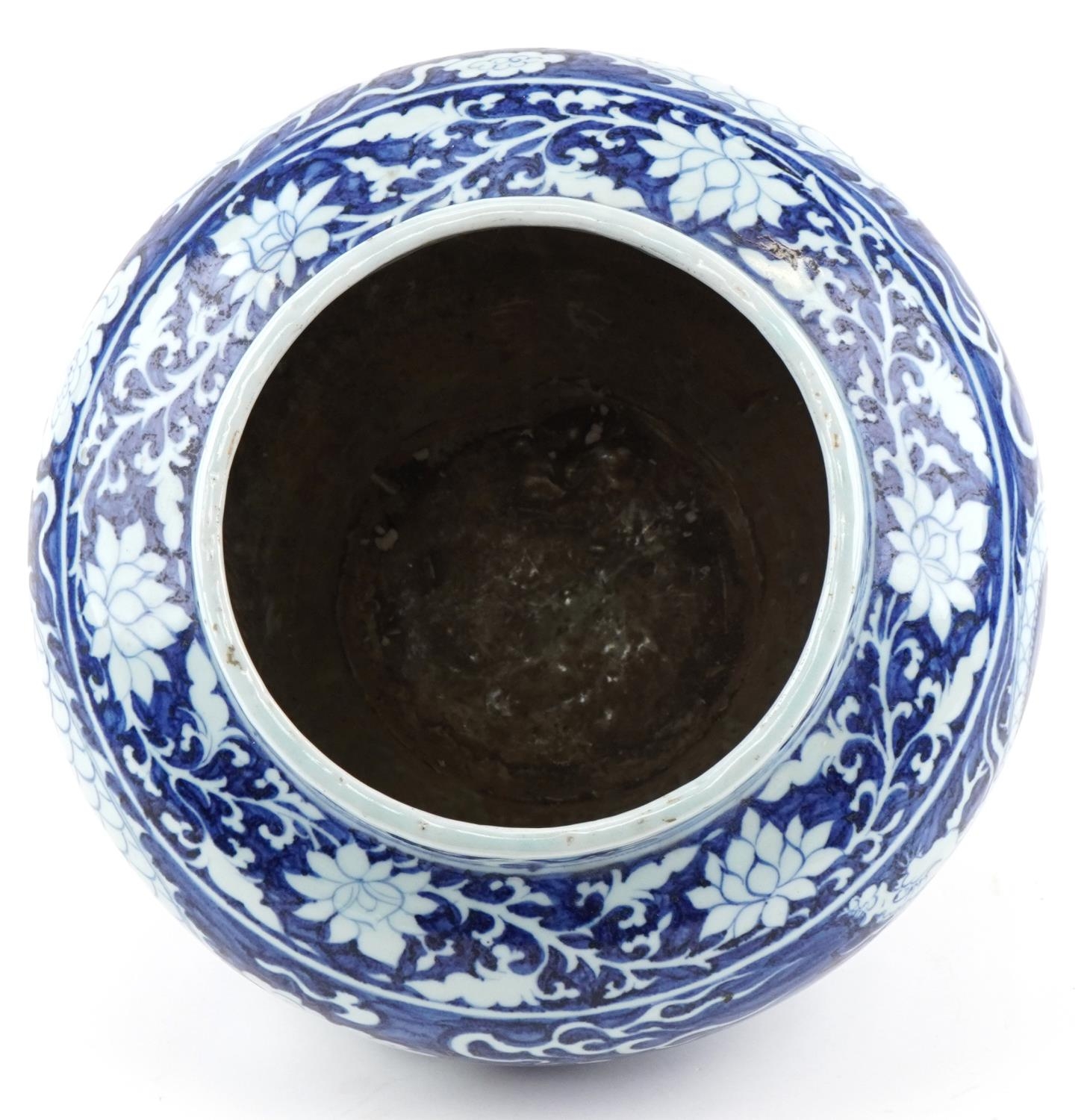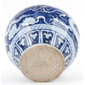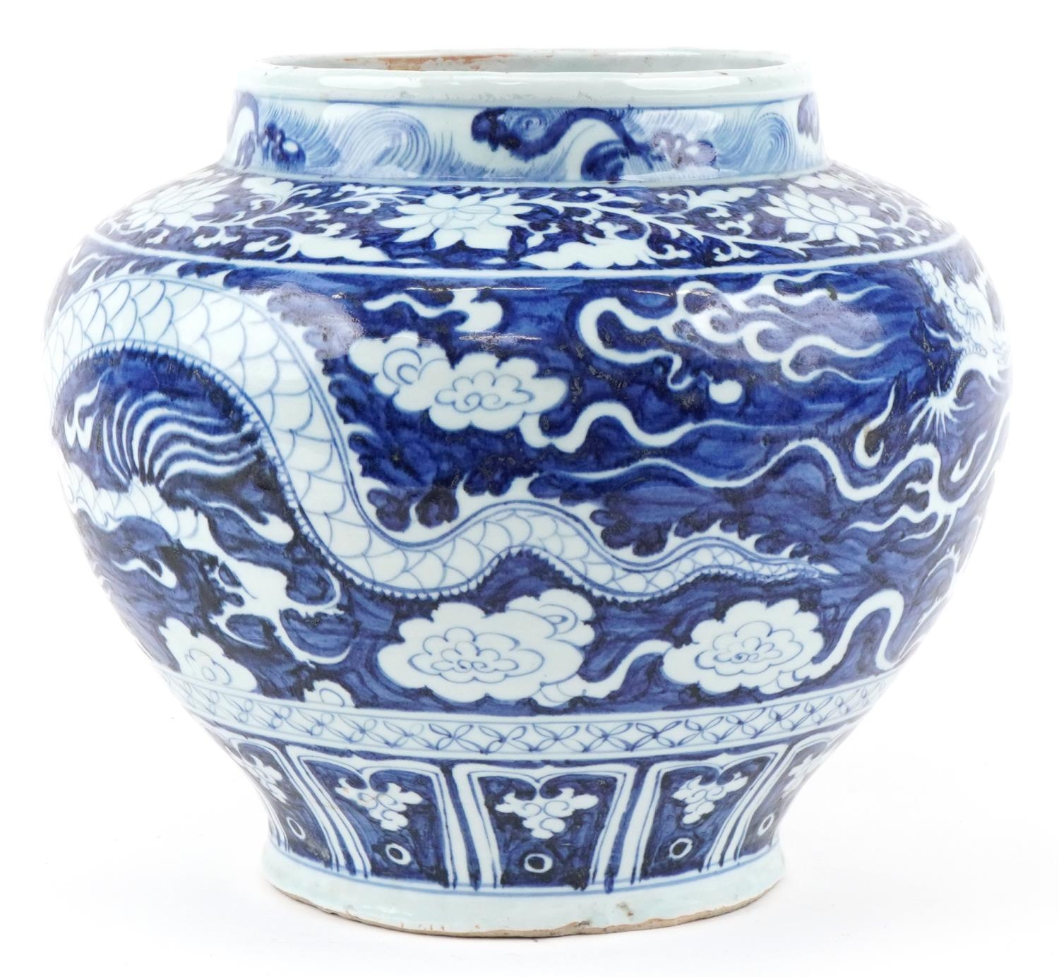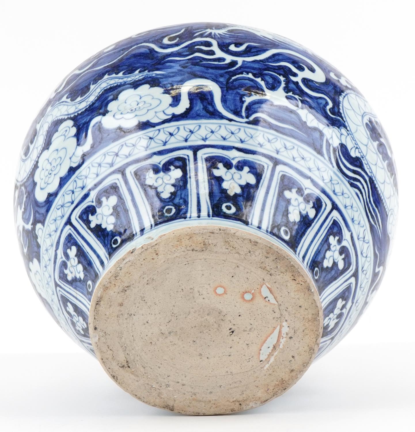 A large Chinese blue and white porcelain vase hand painted with a dragon and foliage, 20th century, 28cm high x 29cm in diameter.