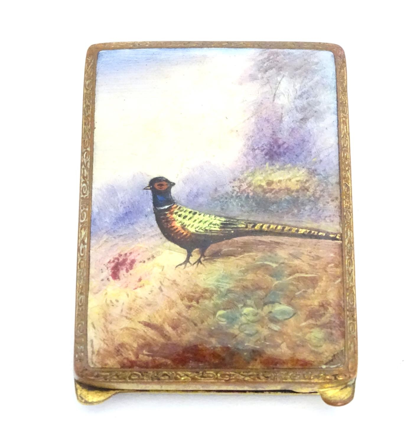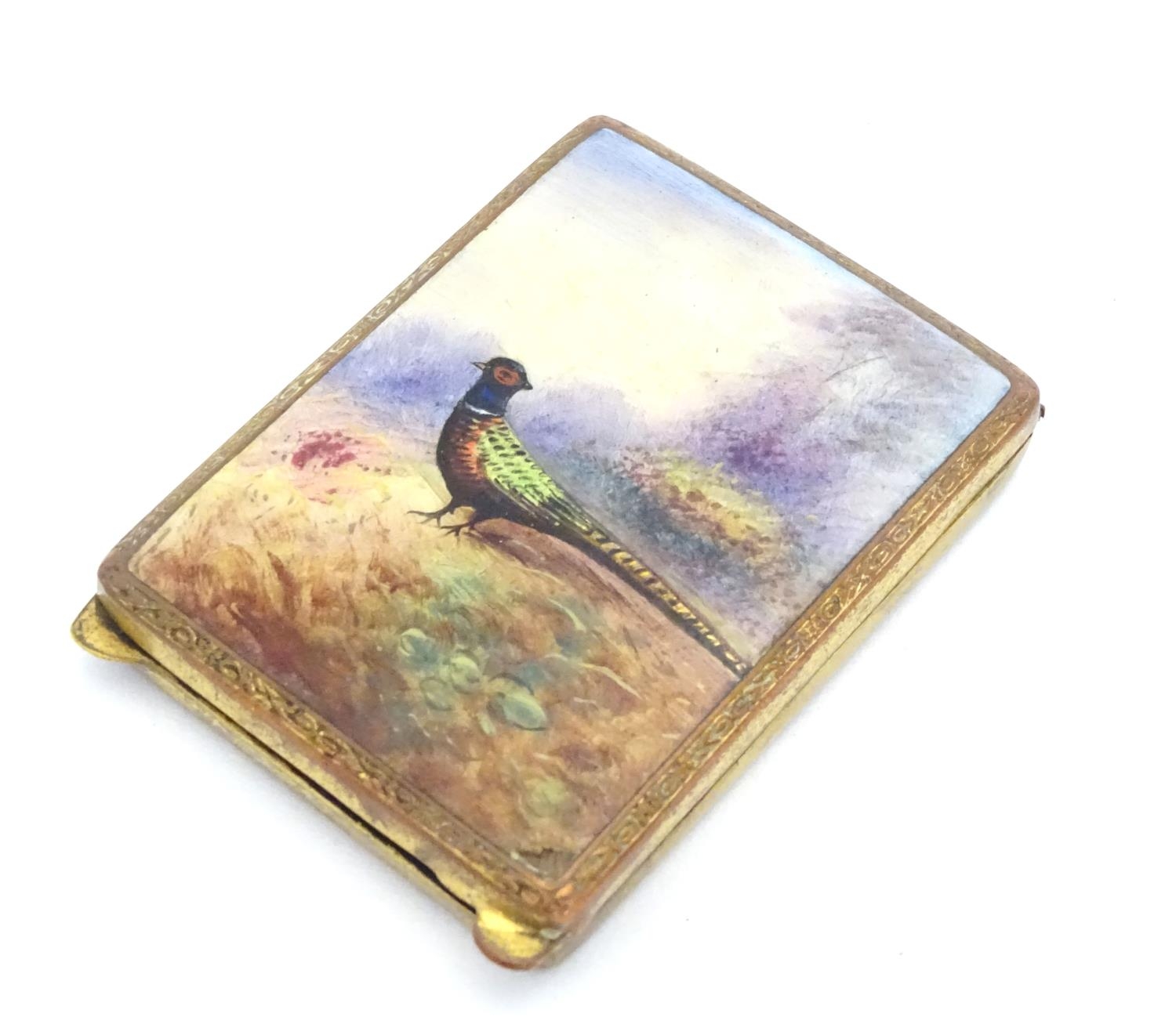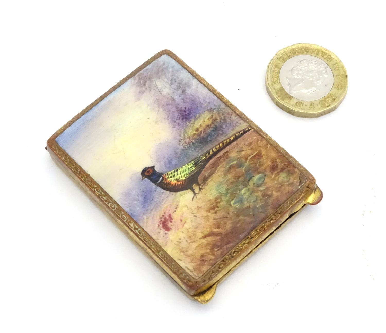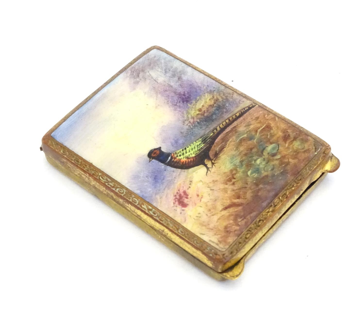 A gilt metal match book case / vesta case with enamel decoration to lid depicting a pheasant in a landscape. 2 1/2" x 1 3/4"