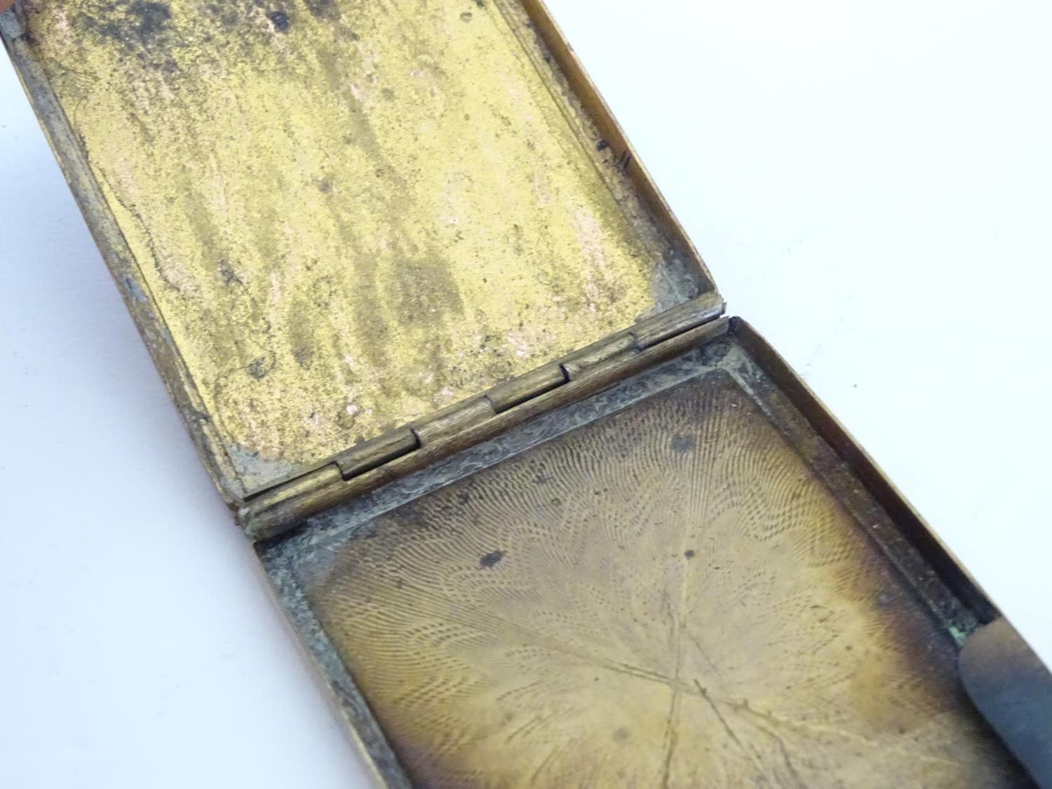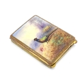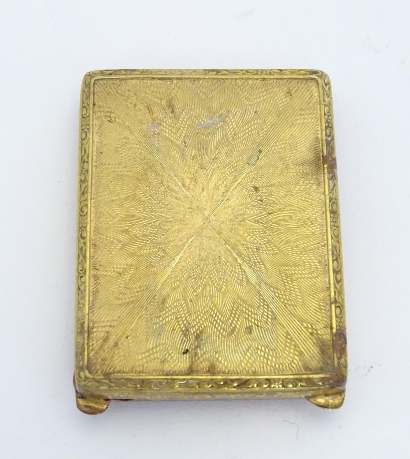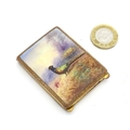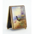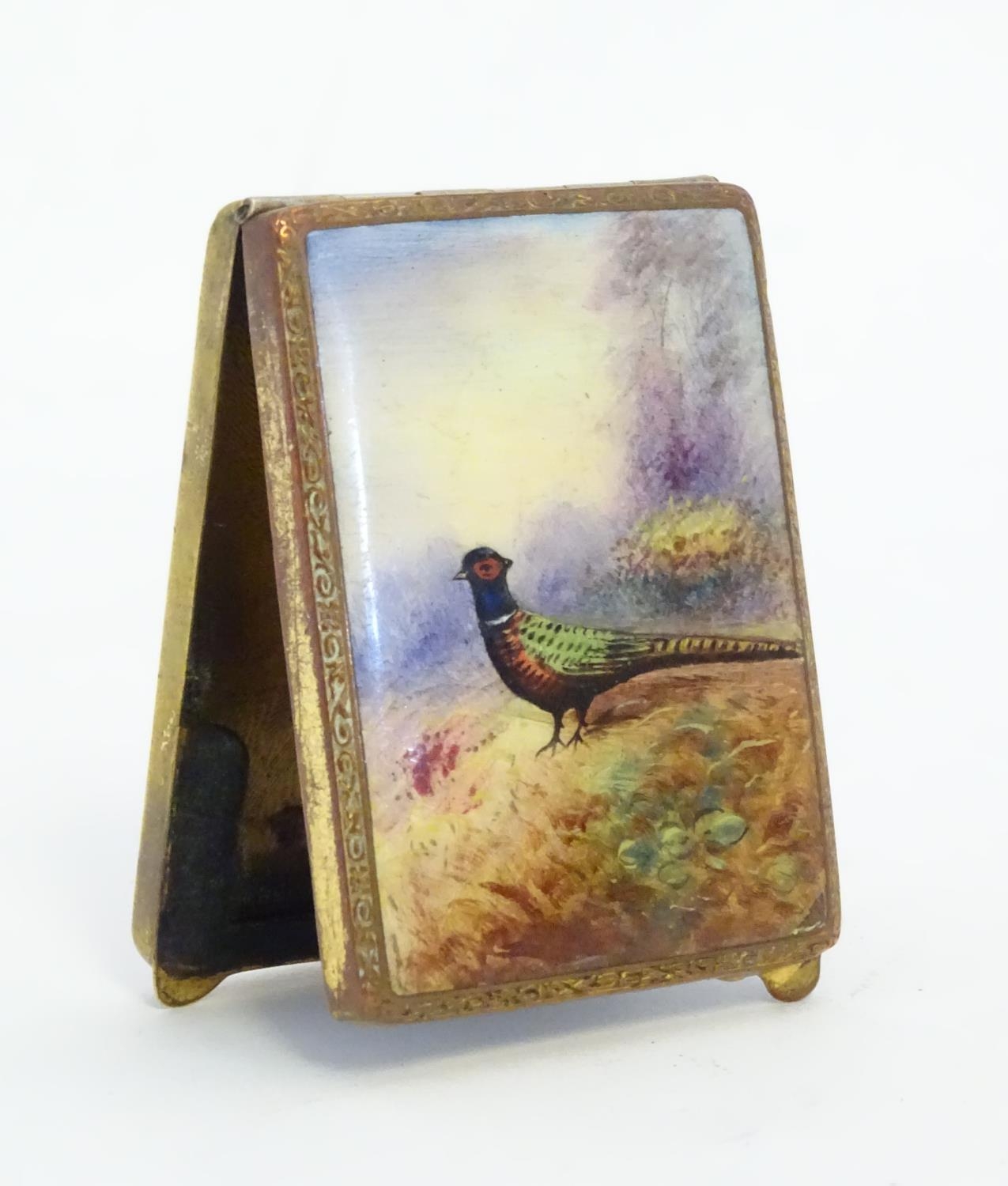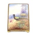 A gilt metal match book case / vesta case with enamel decoration to lid depicting a pheasant in a landscape. 2 1/2" x 1 3/4"