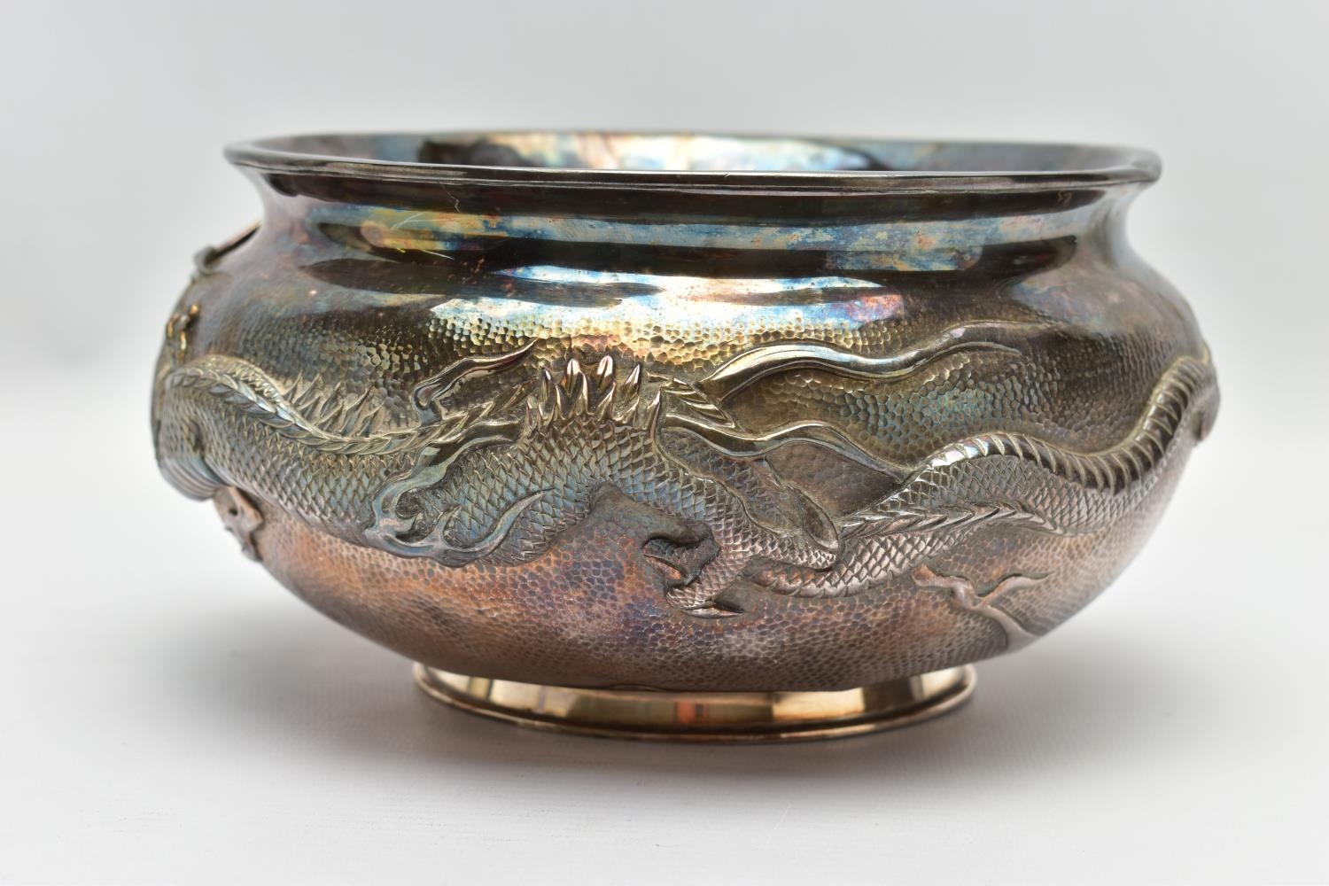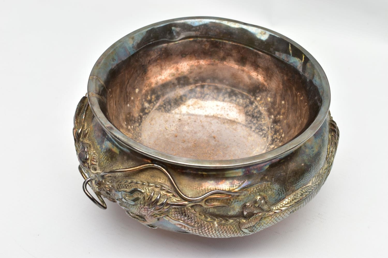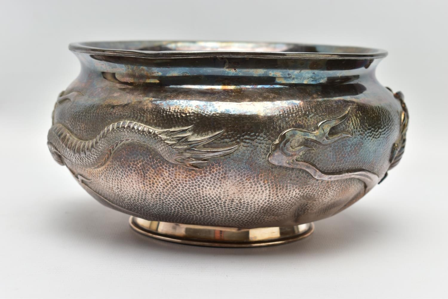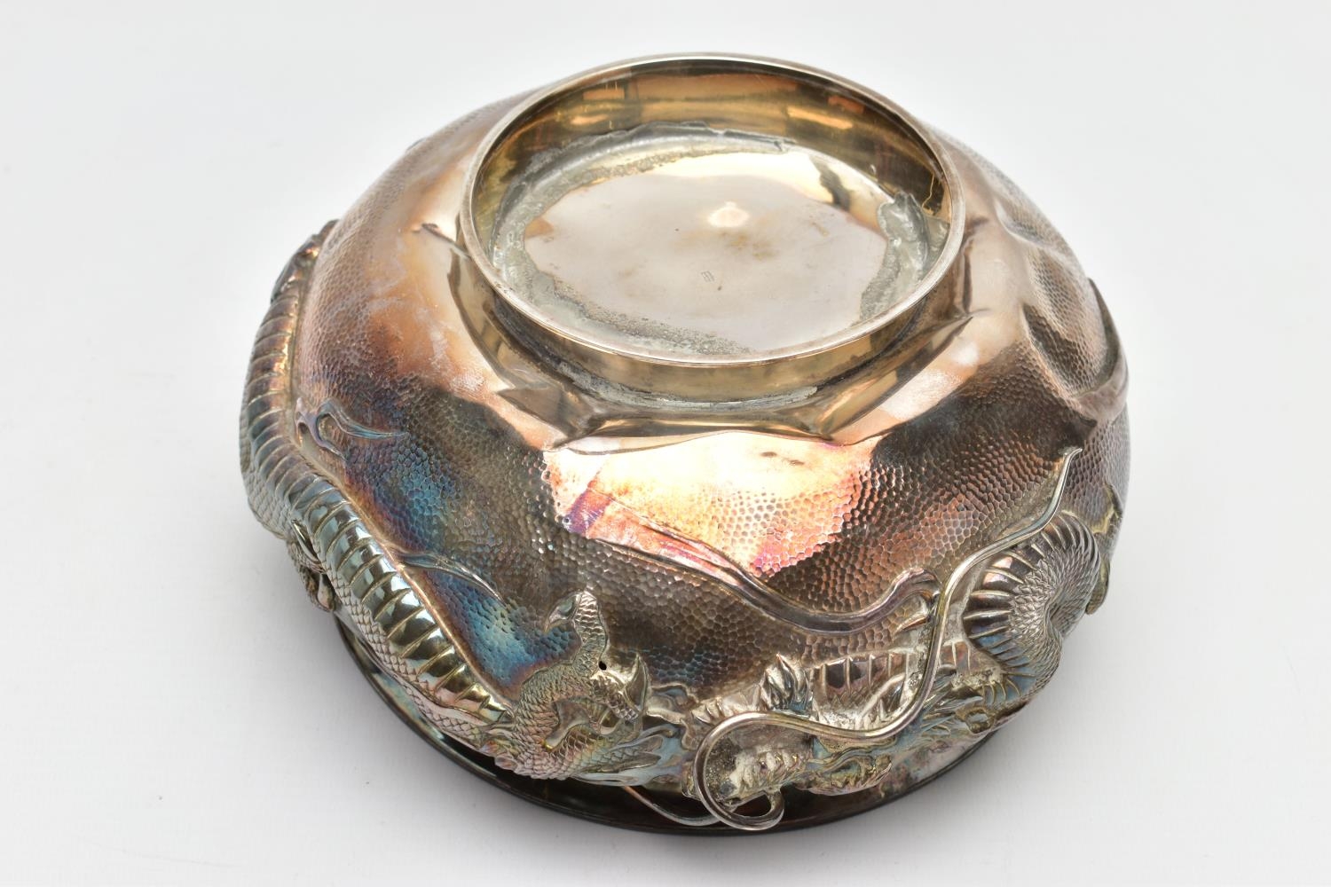 A LATE 19TH CENTURY CHINESE WHITE METAL DOUBLE WALLED CIRCULAR BOWL, the exterior decorated in relief with a dragon on a textured ground, on a short foot, character marks to the underside, 622.3 grams, diameter 20cm approx. x height 10cm (Condition report: in poor condition with solder to the inside of the foot rim, the base of the bowl pushed in by the foot, sizeable dents and creases throughout)