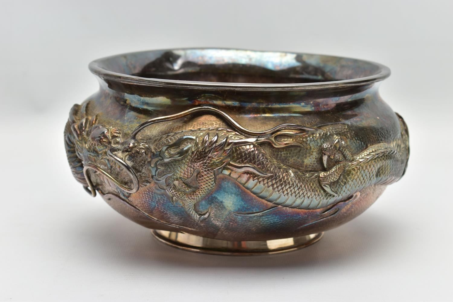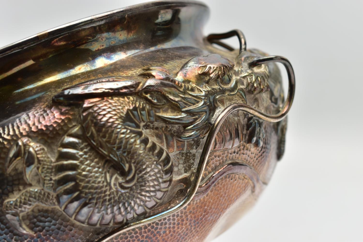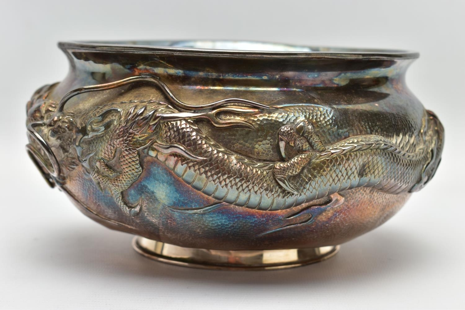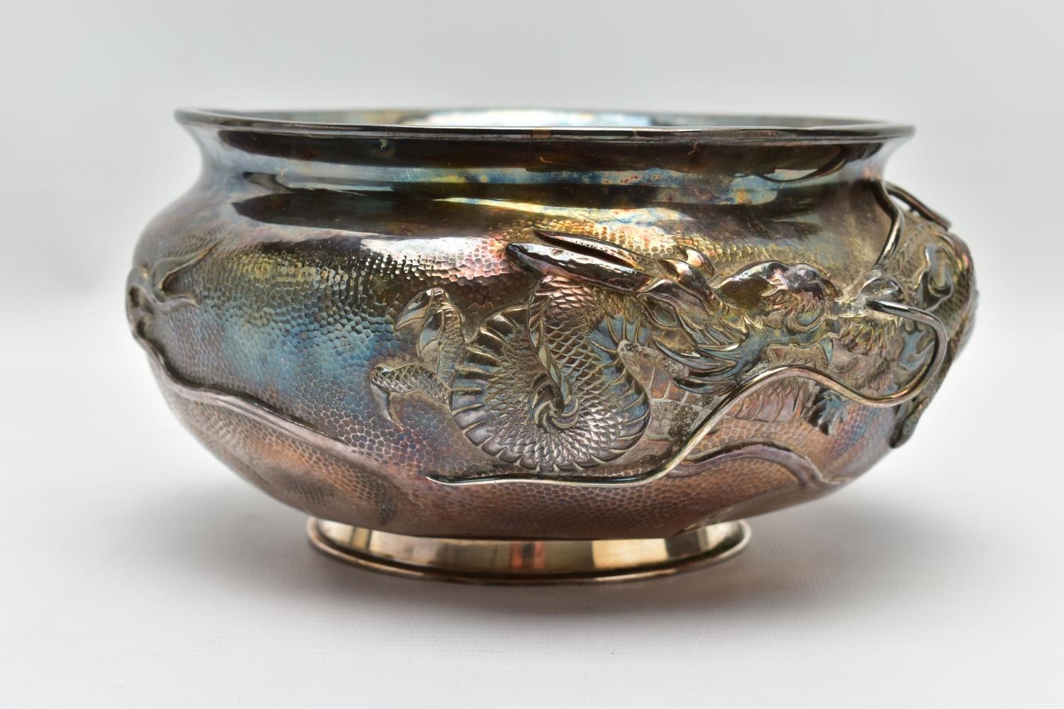 A LATE 19TH CENTURY CHINESE WHITE METAL DOUBLE WALLED CIRCULAR BOWL, the exterior decorated in relief with a dragon on a textured ground, on a short foot, character marks to the underside, 622.3 grams, diameter 20cm approx. x height 10cm (Condition report: in poor condition with solder to the inside of the foot rim, the base of the bowl pushed in by the foot, sizeable dents and creases throughout)