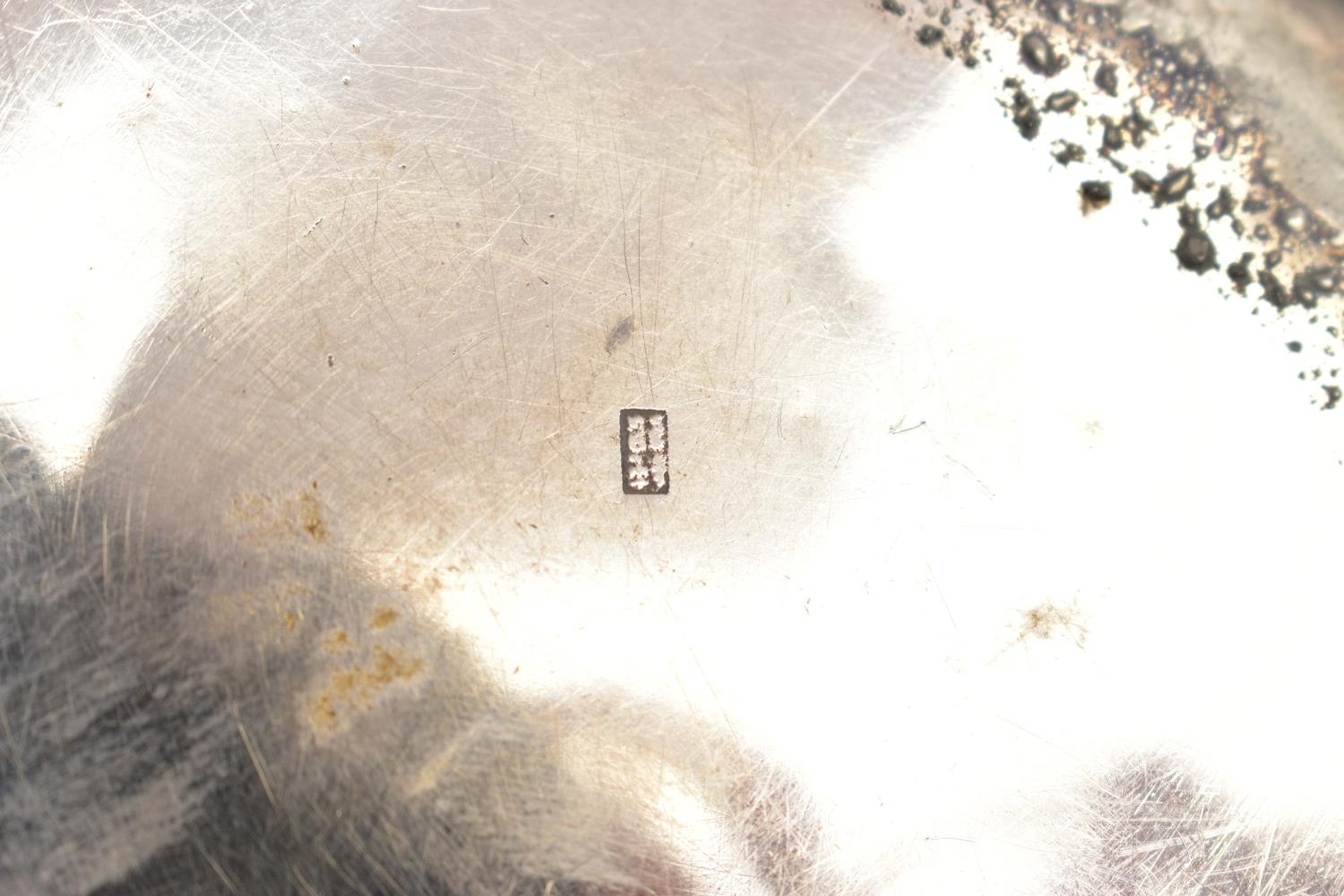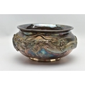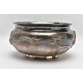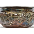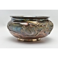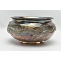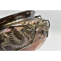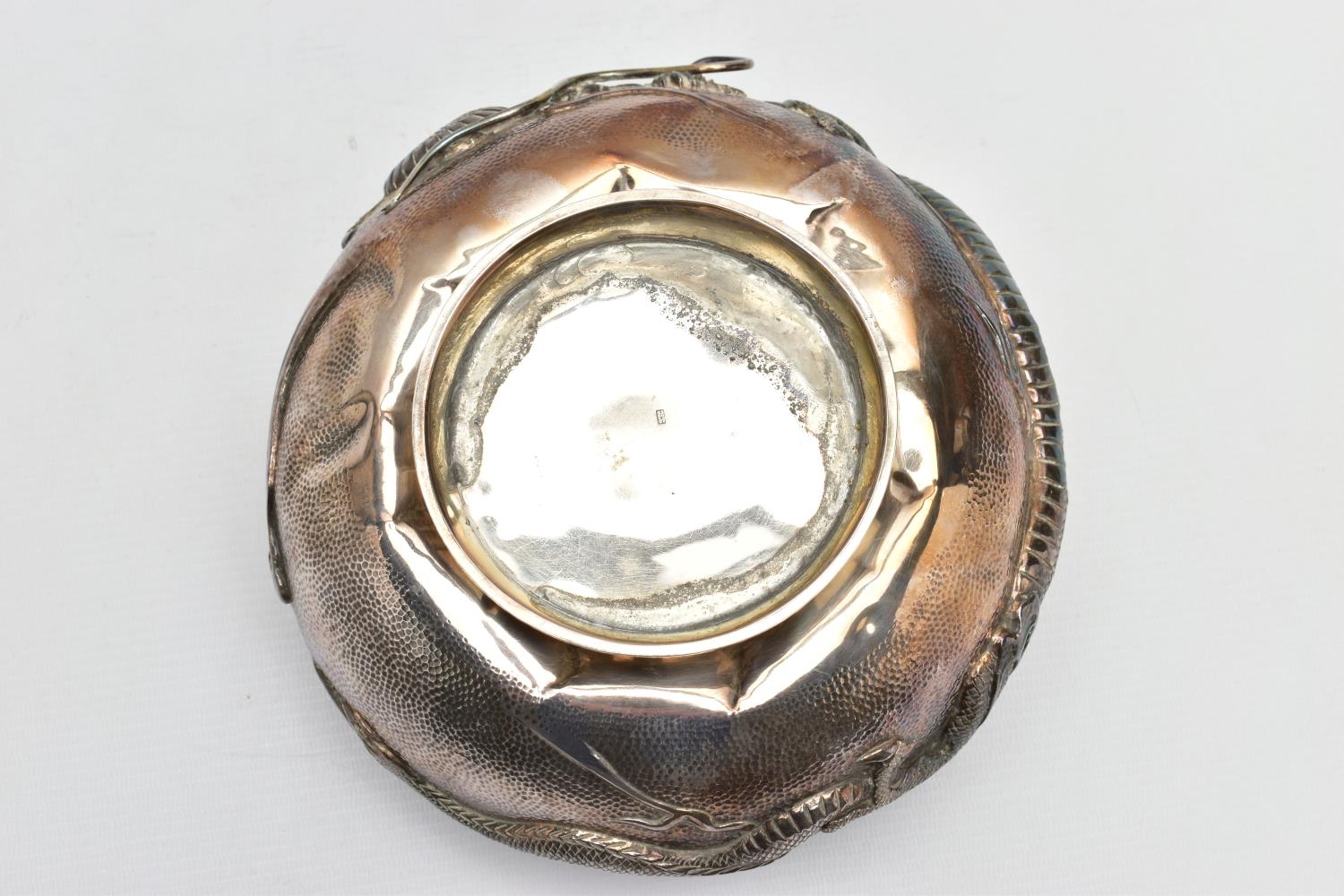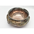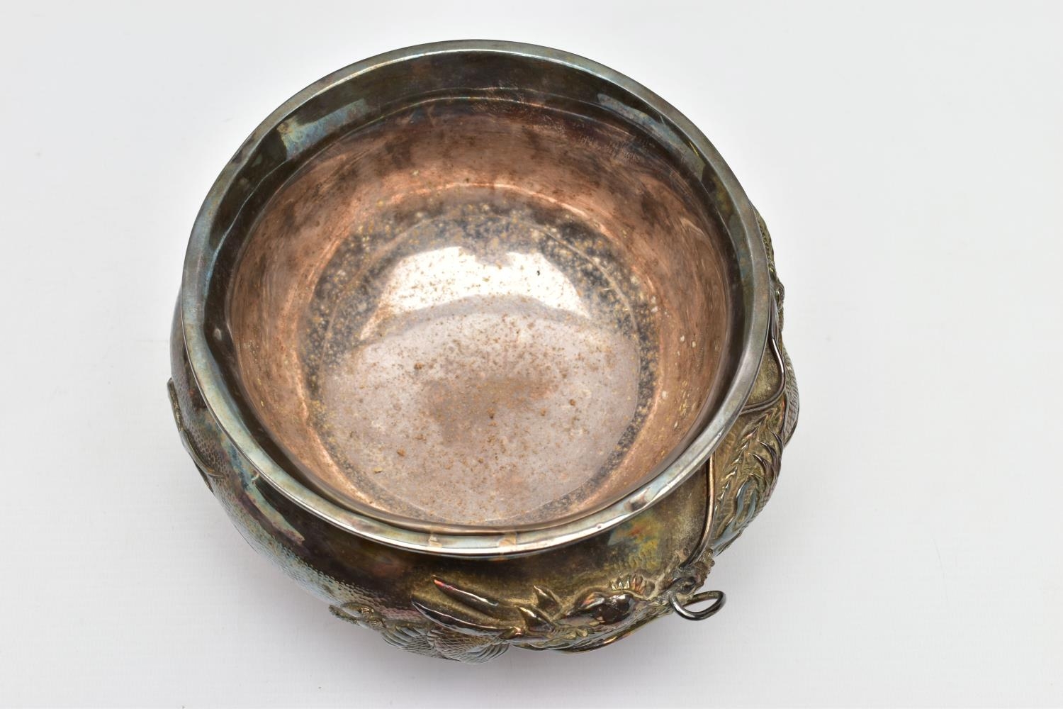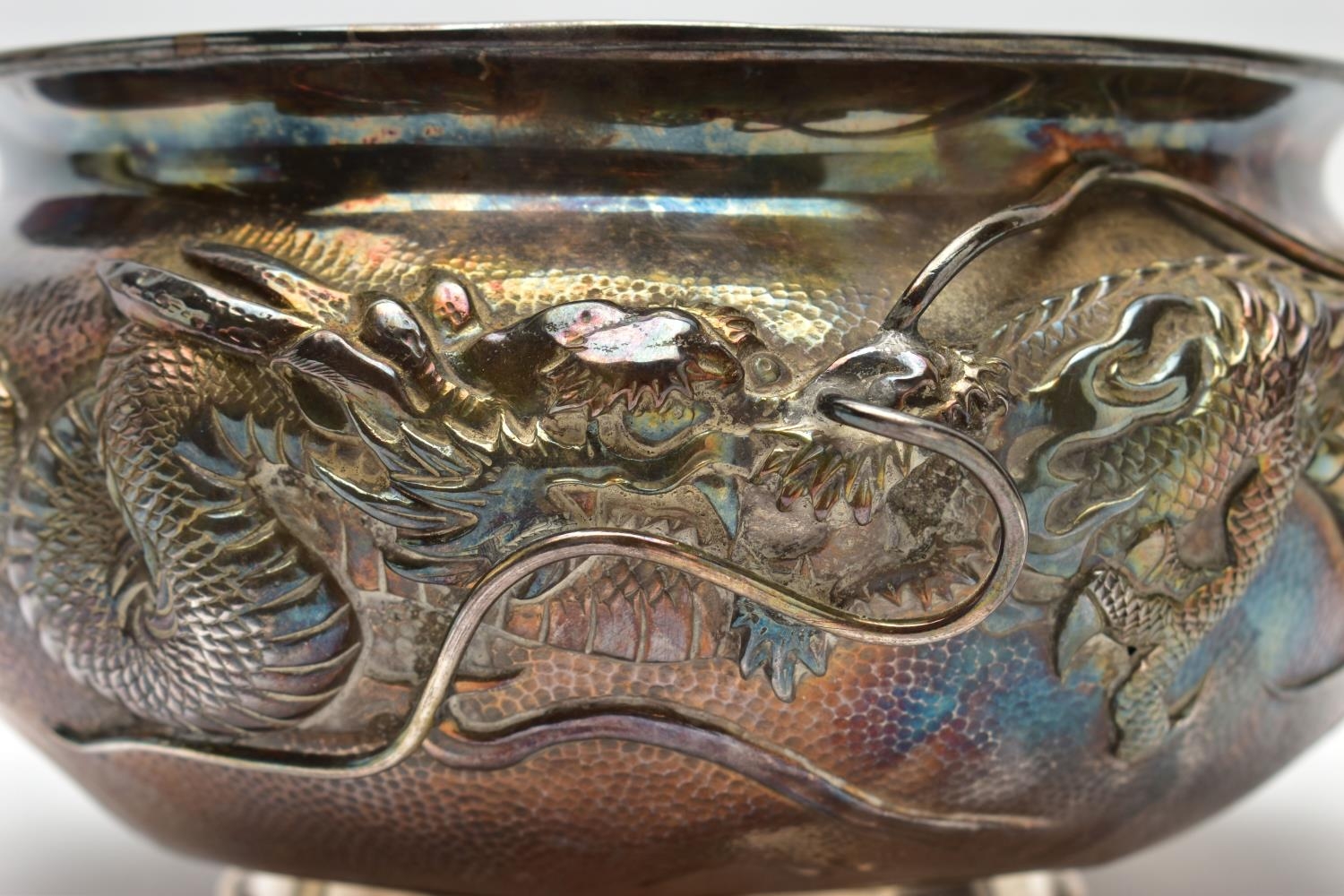 A LATE 19TH CENTURY CHINESE WHITE METAL DOUBLE WALLED CIRCULAR BOWL, the exterior decorated in relief with a dragon on a textured ground, on a short foot, character marks to the underside, 622.3 grams, diameter 20cm approx. x height 10cm (Condition report: in poor condition with solder to the inside of the foot rim, the base of the bowl pushed in by the foot, sizeable dents and creases throughout)