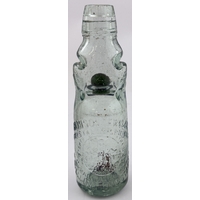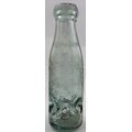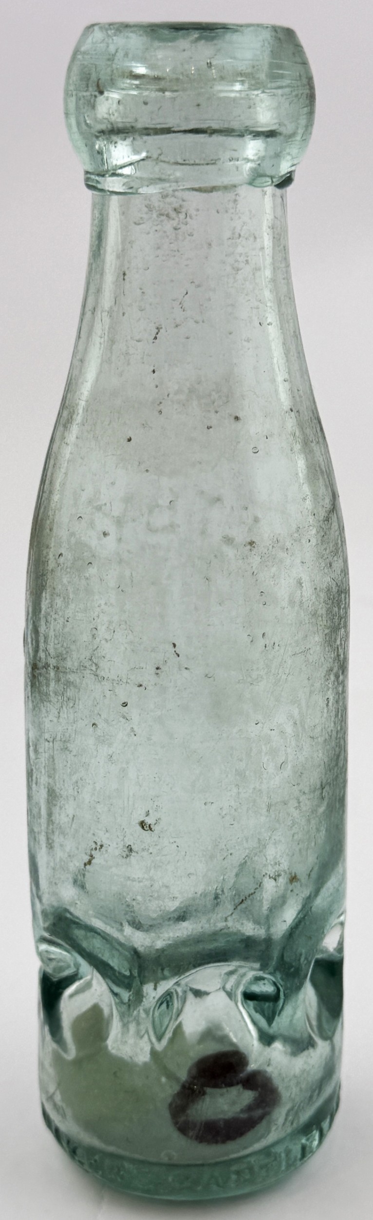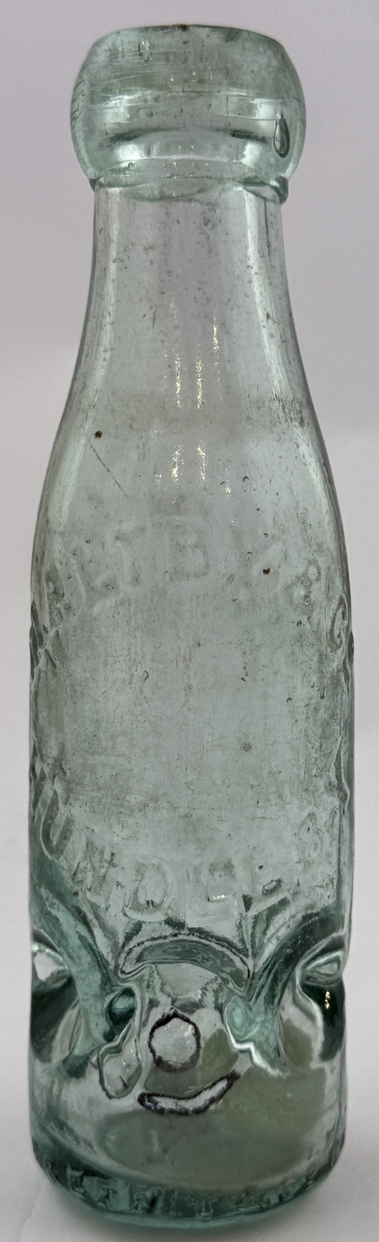 LINCOLNSHIRE PATENT MINERAL WATER BOTTLE. 7.5ins. Unusual 6oz mineral embossed MALTBY & CO/ HUNDLEBY to front with 6 retaining lugs near base & internal lip recess for washer, possibly a Sykes Macvay variation? Embossed E BREFFIT & CO LD MAKERS CASTLEFORD around base edge.