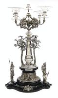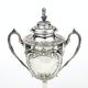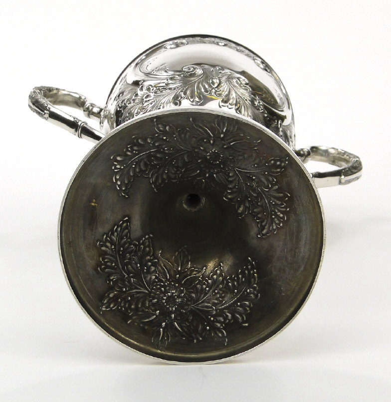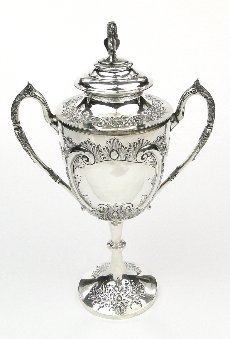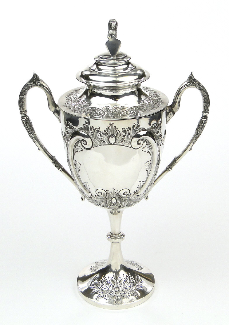Edwardian silver two handled trophy and cover, the lid with lion and shield knop, the body with embossed decoration and blank cartouches and raised on a circular foot, the body and lid hallmarked Sheffield 1901-02, the knop hallmarked Sheffield 1896-7, 41cm high