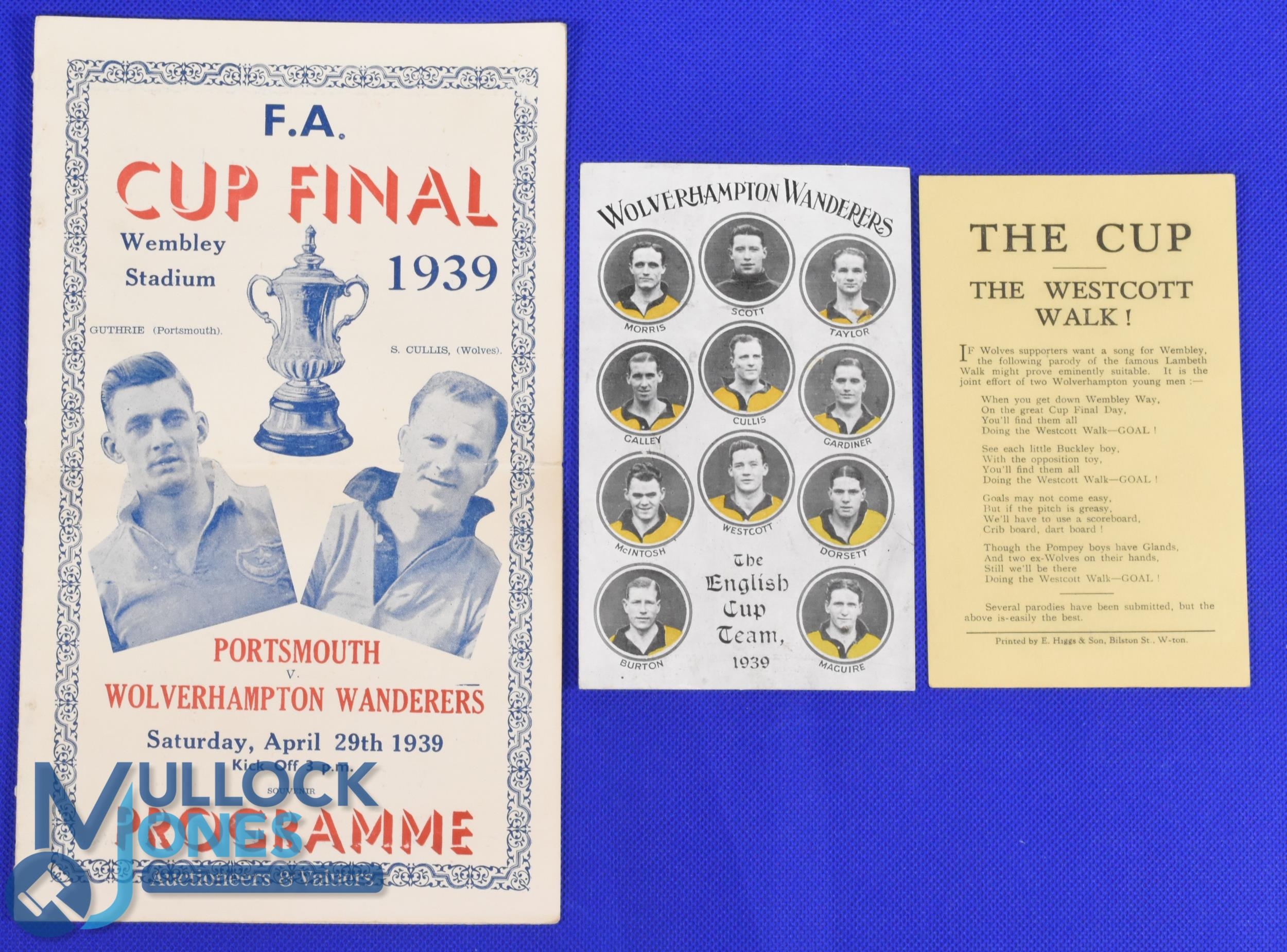 1939 FAC Final souvenir programme 4 page card, no writing, centre pocket fold (kept flat for years), small single card insert with a Wolves match song (printers E Higgs & Son, Wolverhampton), also a souvenir postcard featuring the 1939 Wolves team player portraits; fair/good. (3)