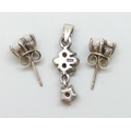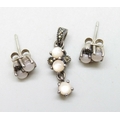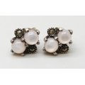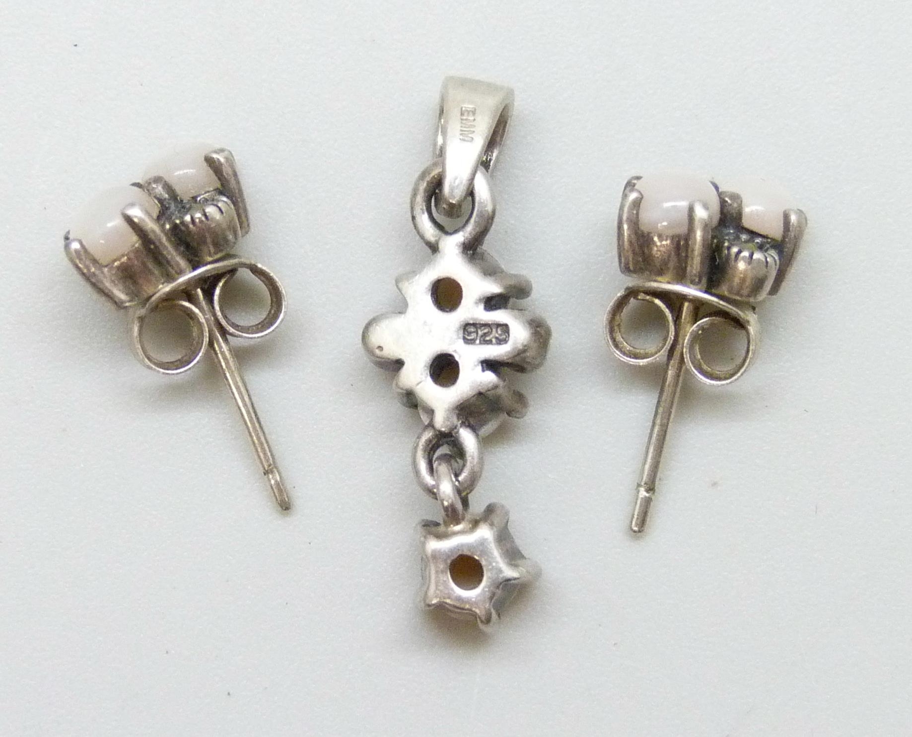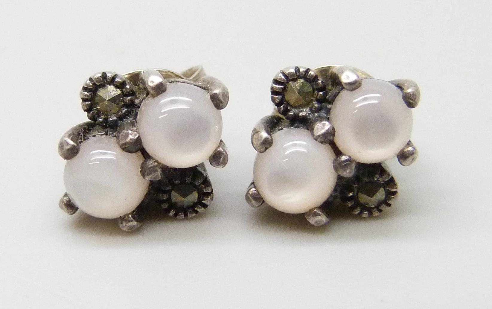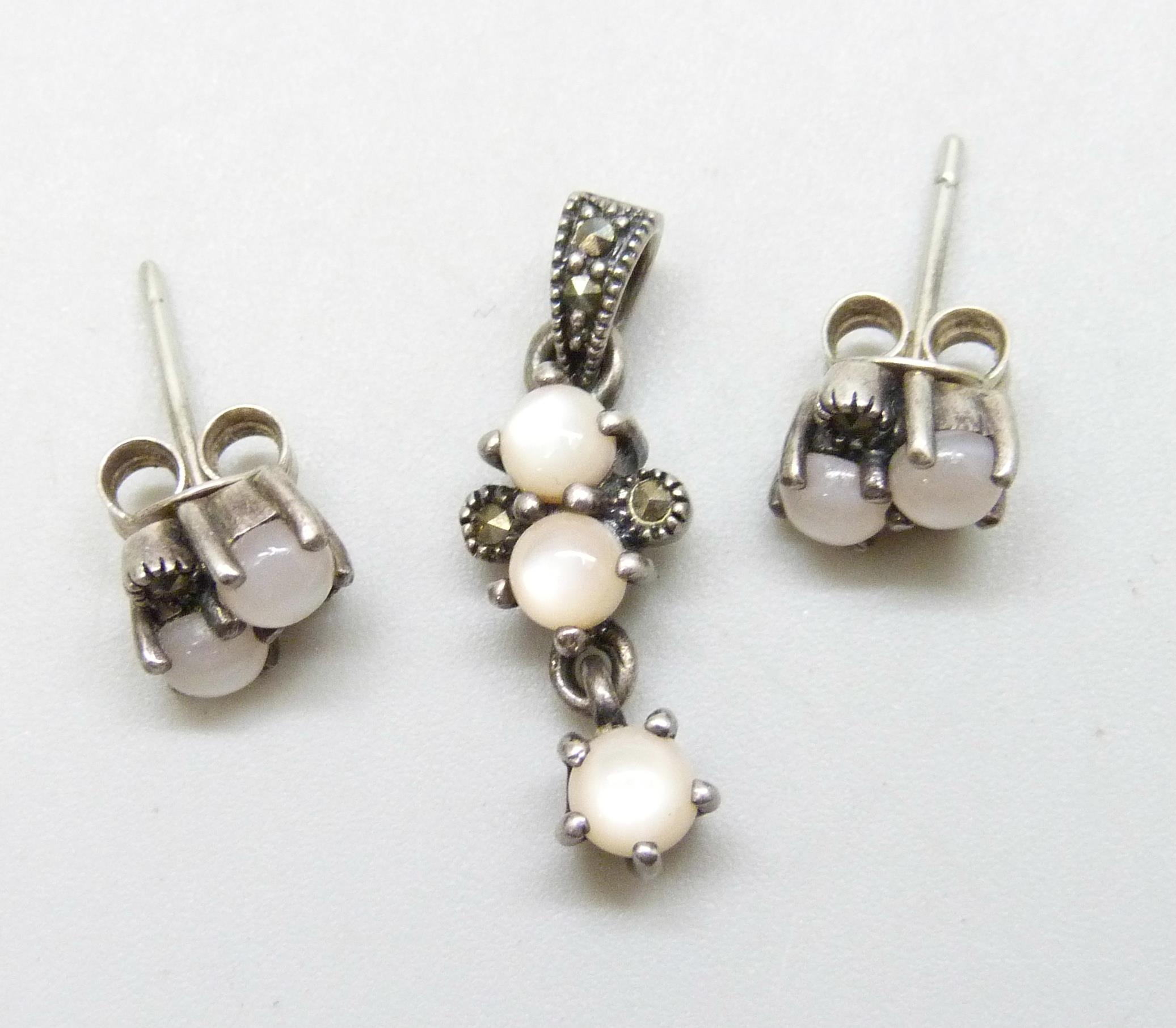 A pair of silver mother of pearl and marcasite earrings and matching pendant, 2.4cm including bale