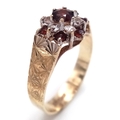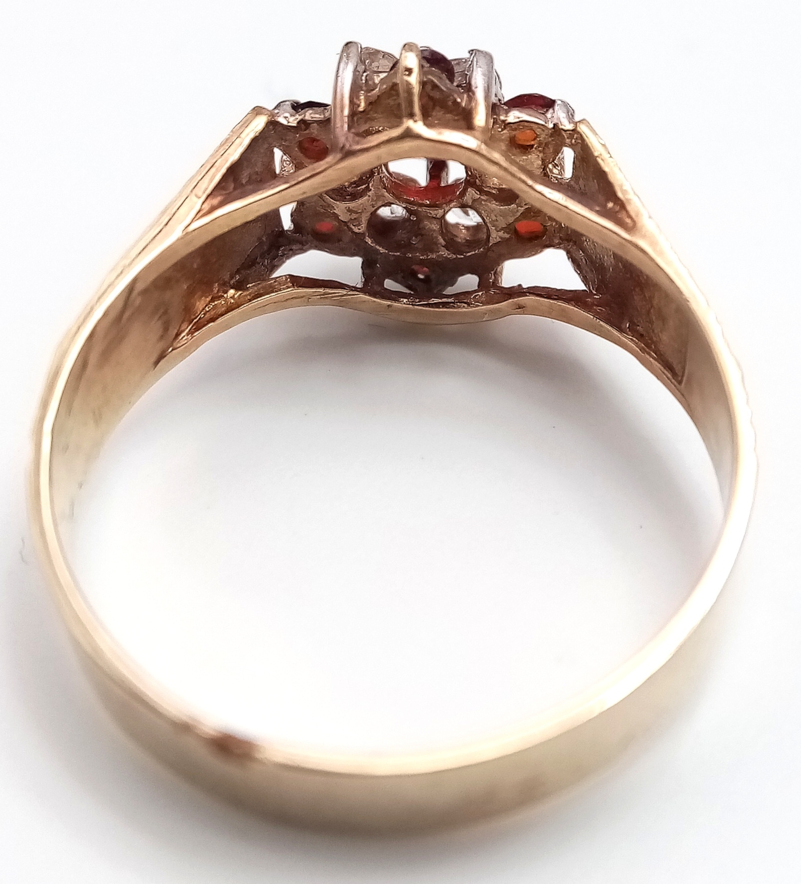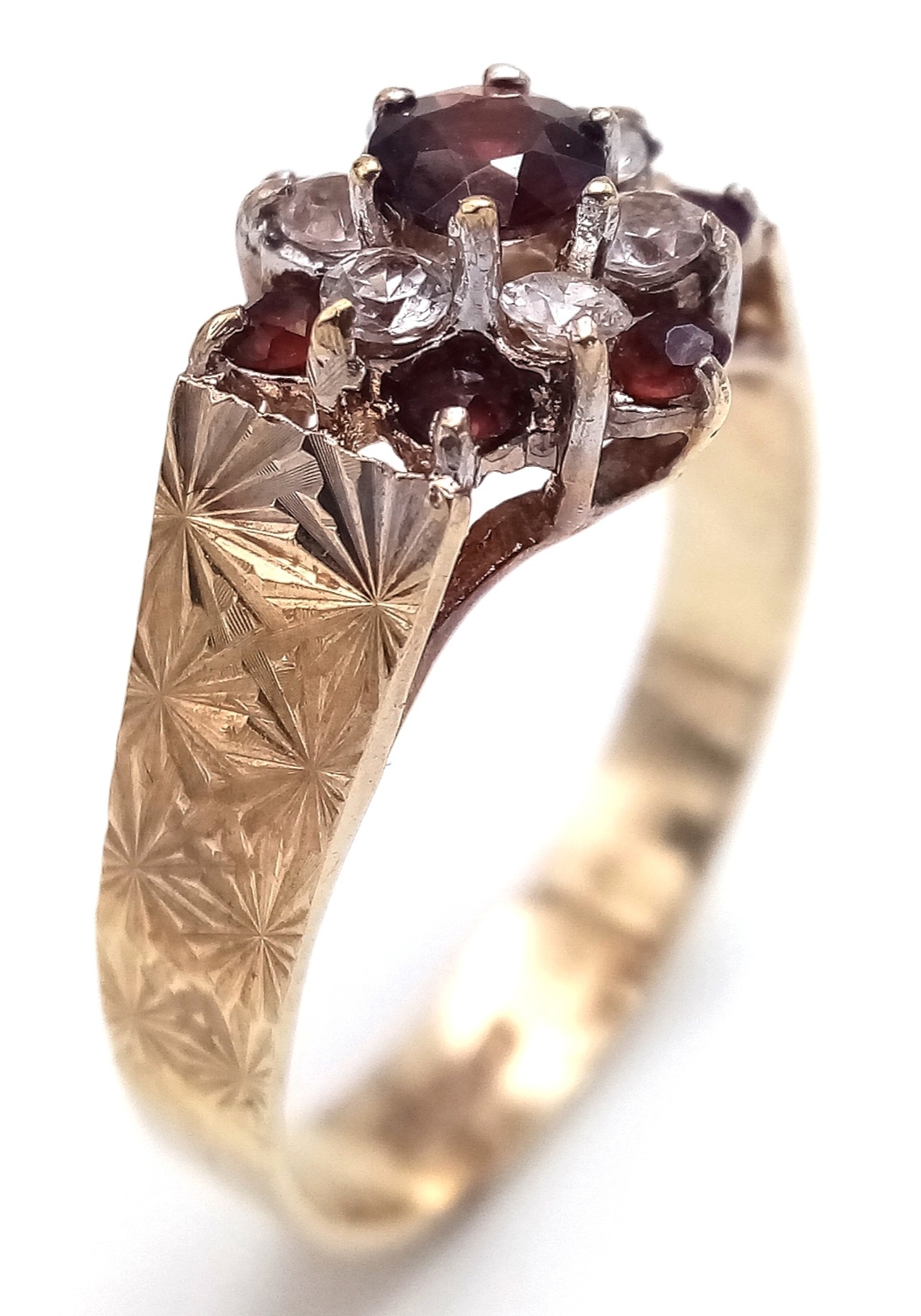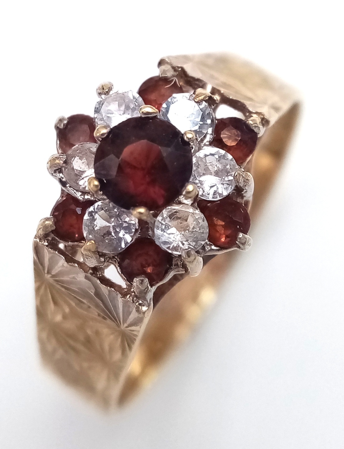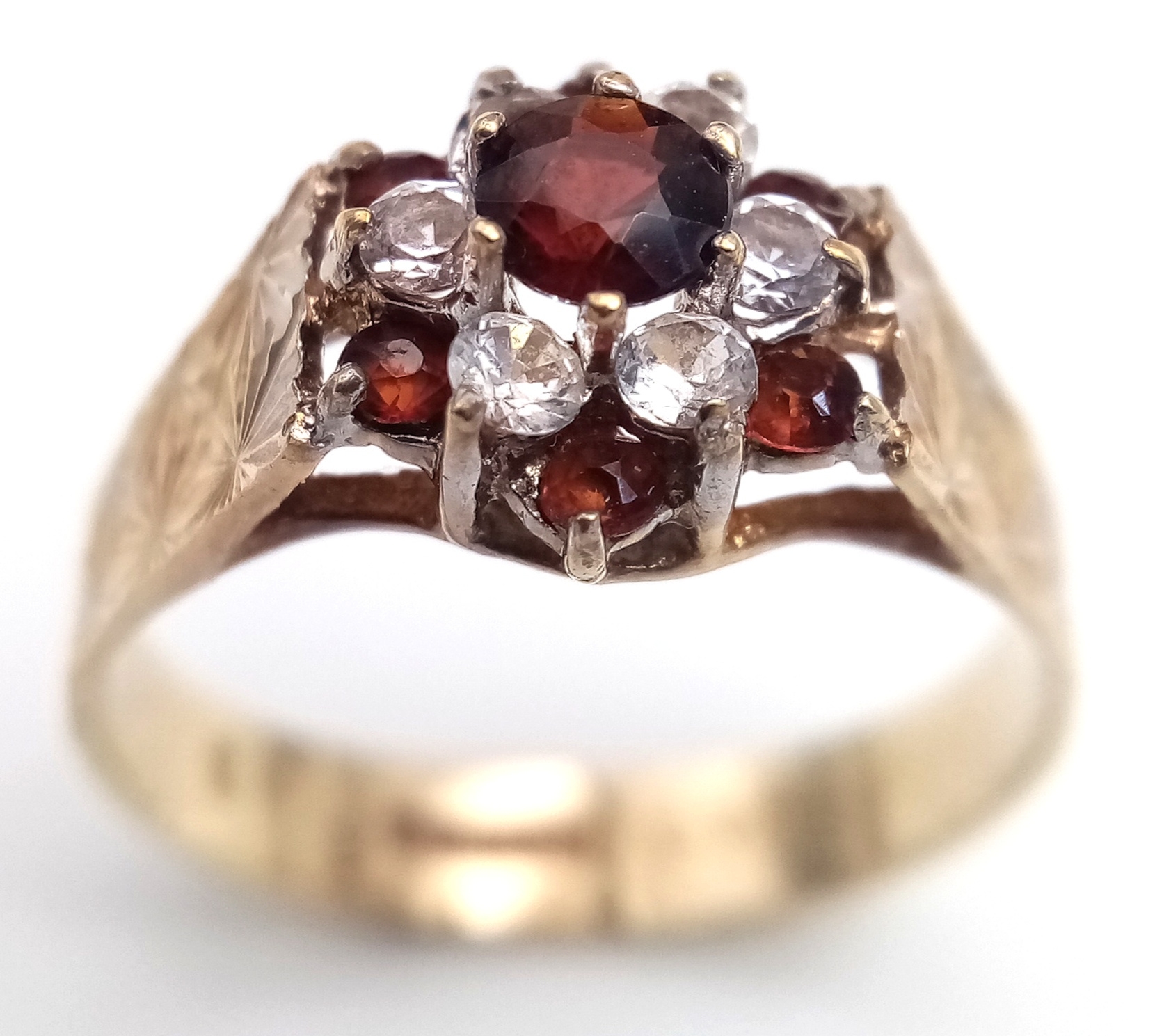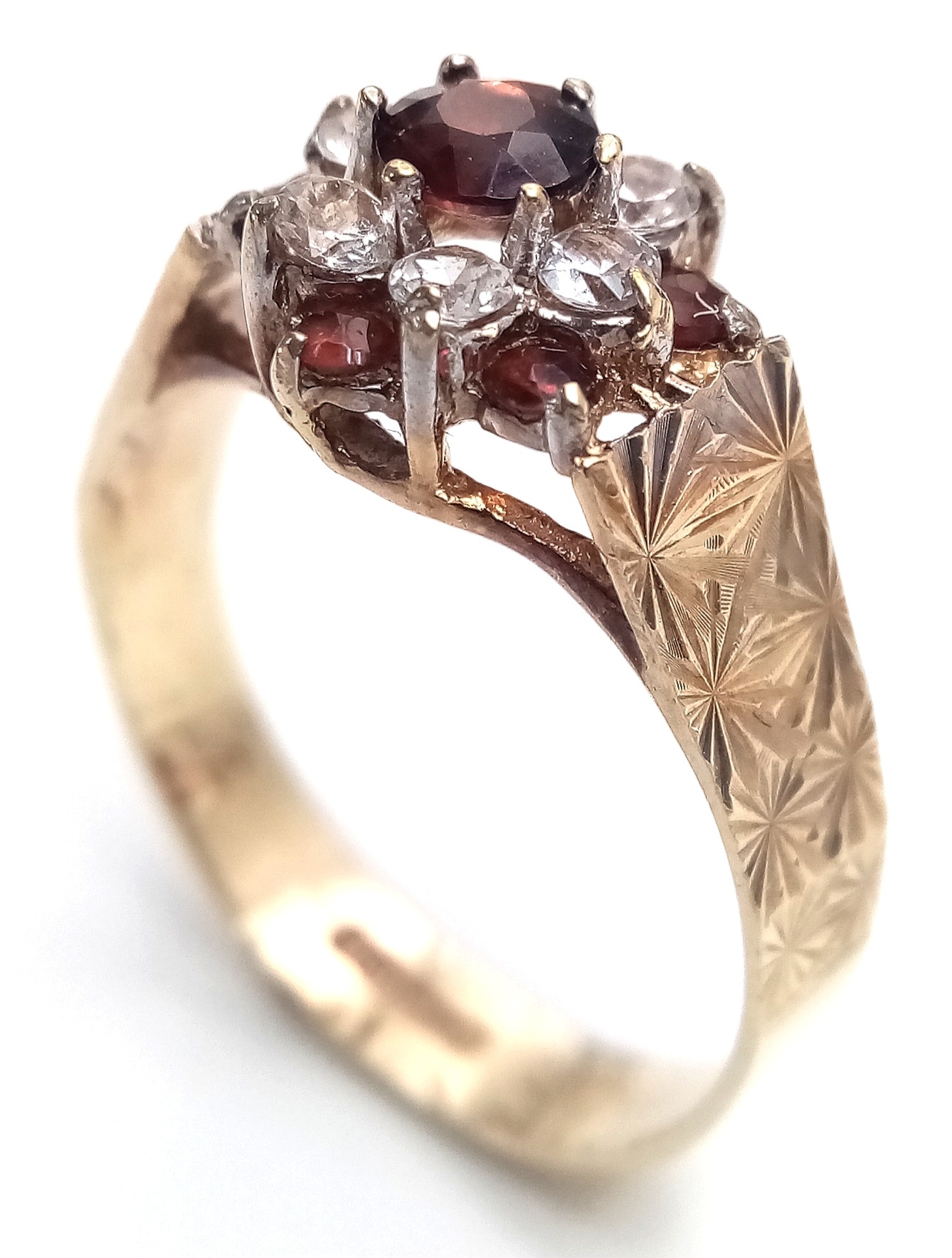 Vintage 9 CARAT GOLD RING. Clear hallmark for Birmingham 1977 . Having Garnet and Zirconia Detail. 2.44 Grams. Size O 1/2. Exceptional condition, please see pictures.