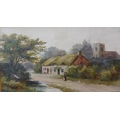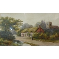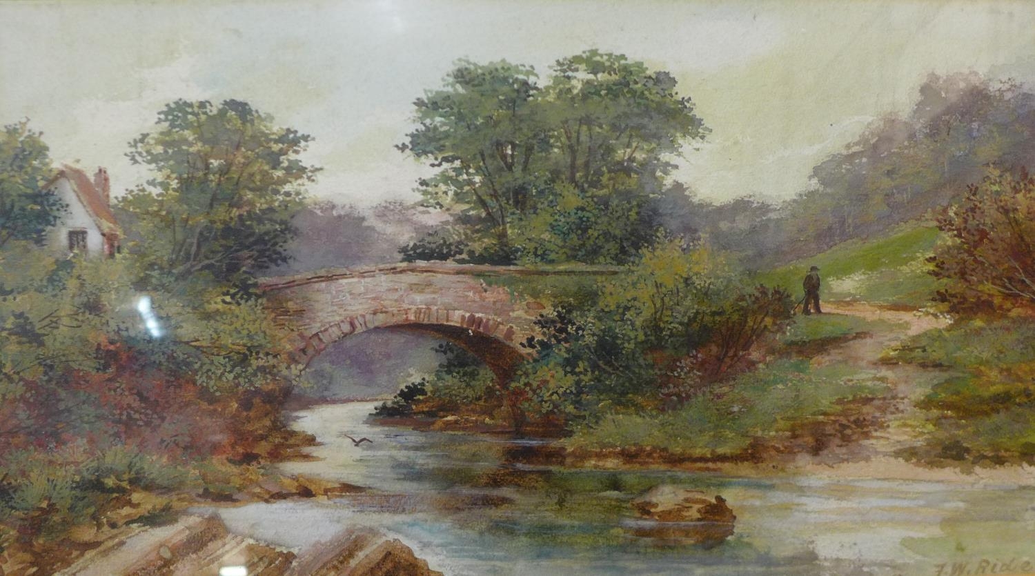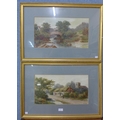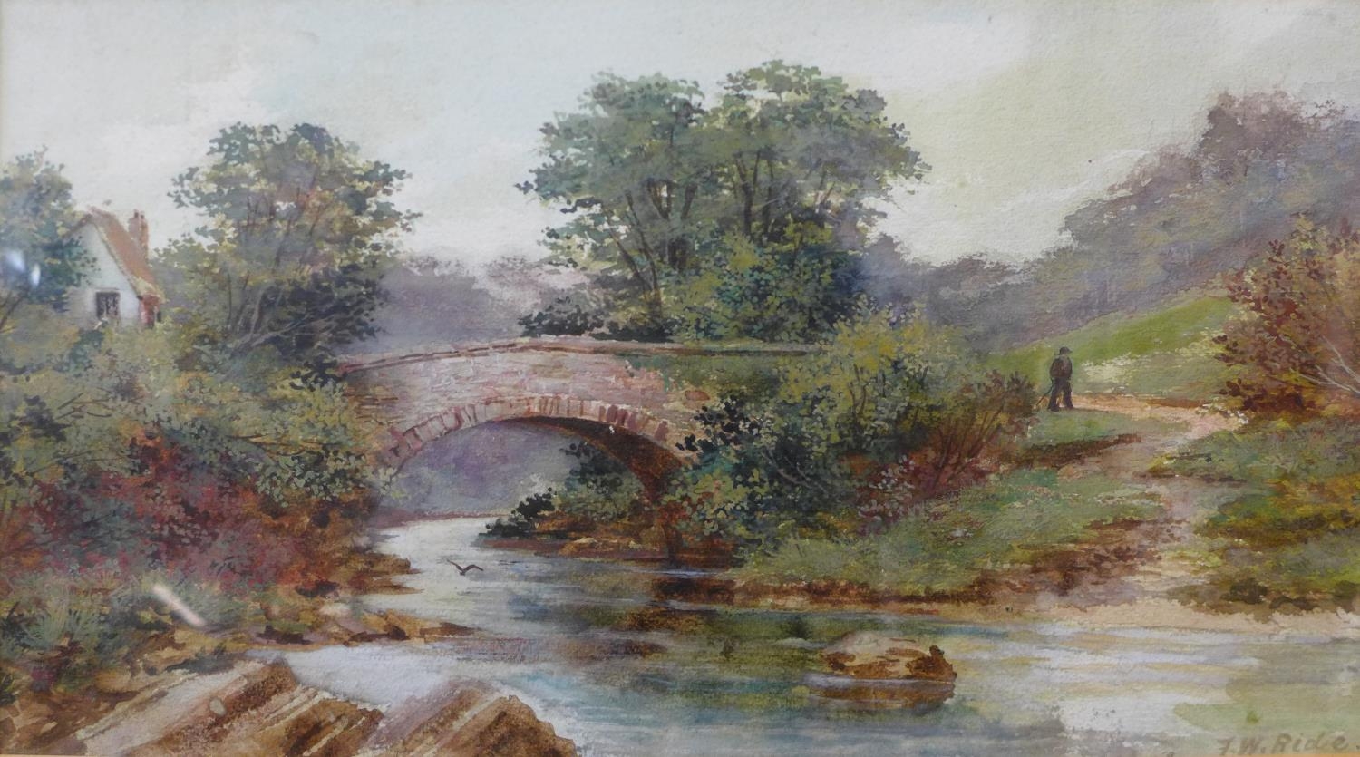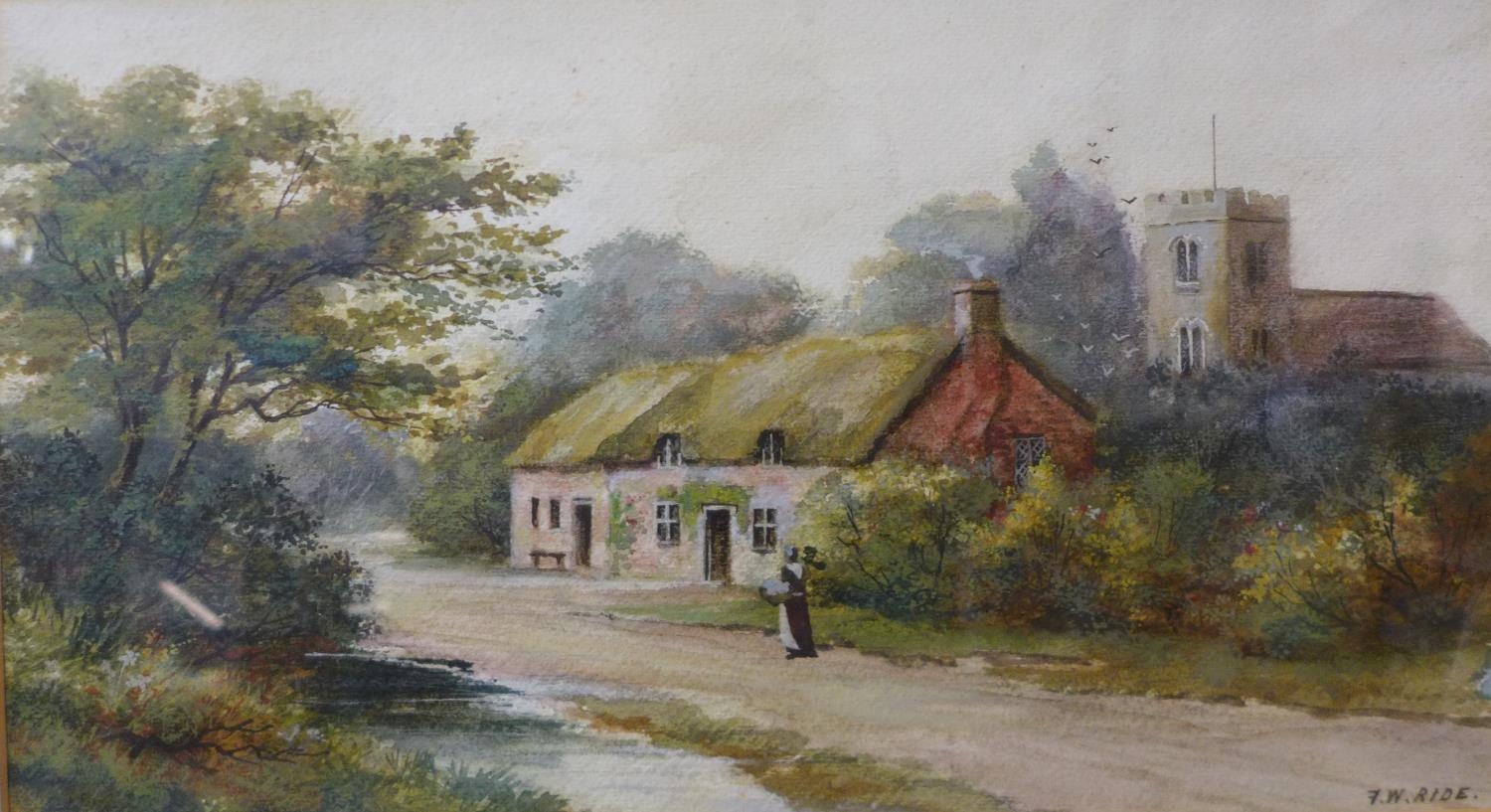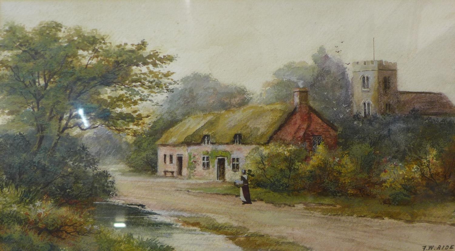 F.W. Ride, pair of rural landscapes with figures, watercolour, 25 x 45cms, framed