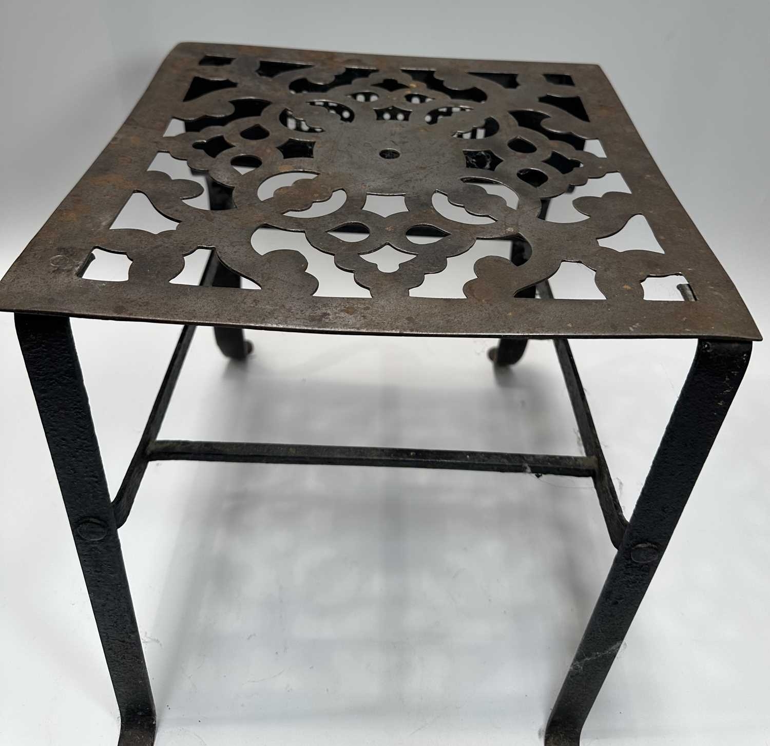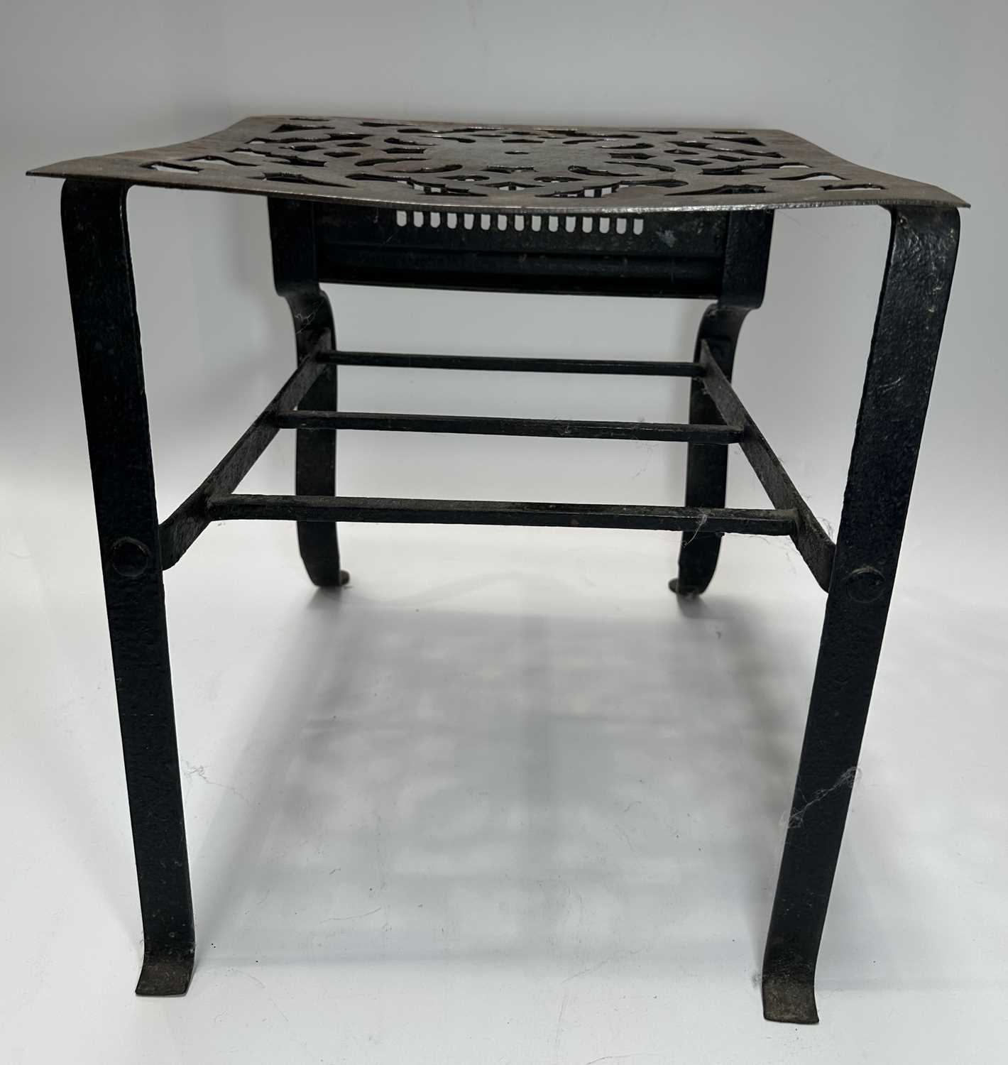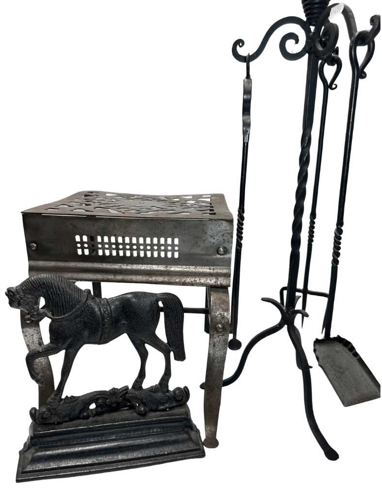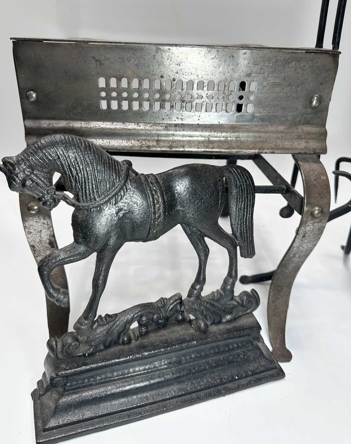 A Georgian steel footman or fireside stall, cut away top, fretted front rail, square back legs and braille front with exaggerated knees, height 35cm, width 32cm, depth approx 37cm, together with a wrought iron companion set on stand, and a cast iron doorstop of a horse (3)