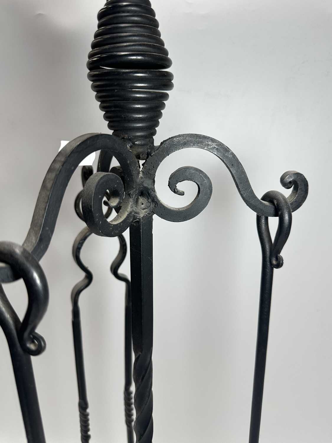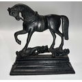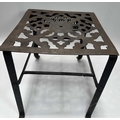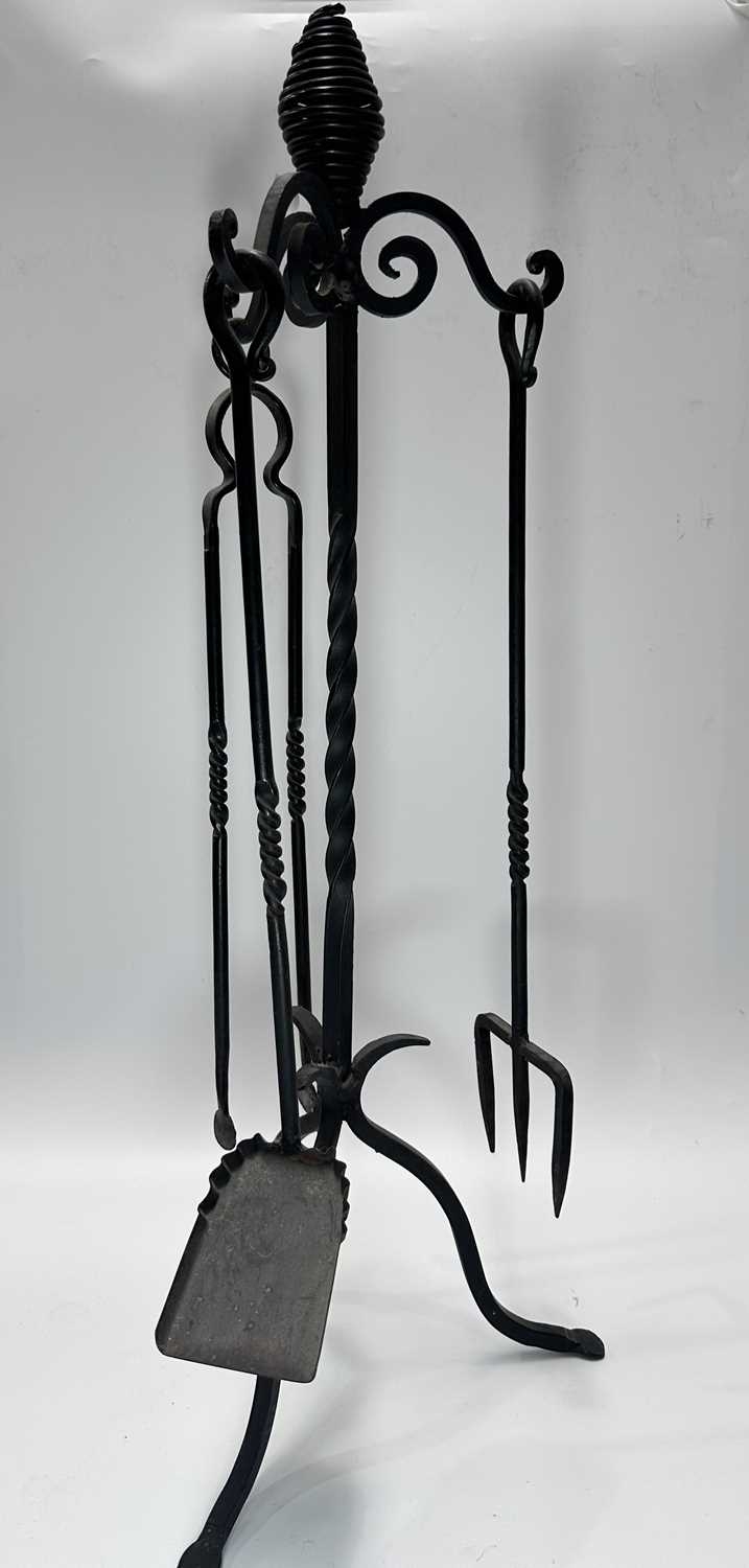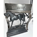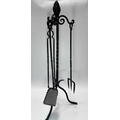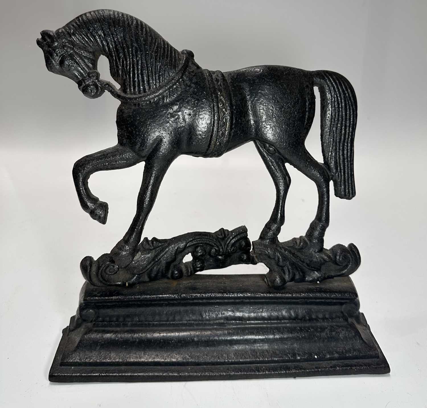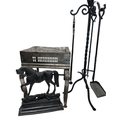 A Georgian steel footman or fireside stall, cut away top, fretted front rail, square back legs and braille front with exaggerated knees, height 35cm, width 32cm, depth approx 37cm, together with a wrought iron companion set on stand, and a cast iron doorstop of a horse (3)